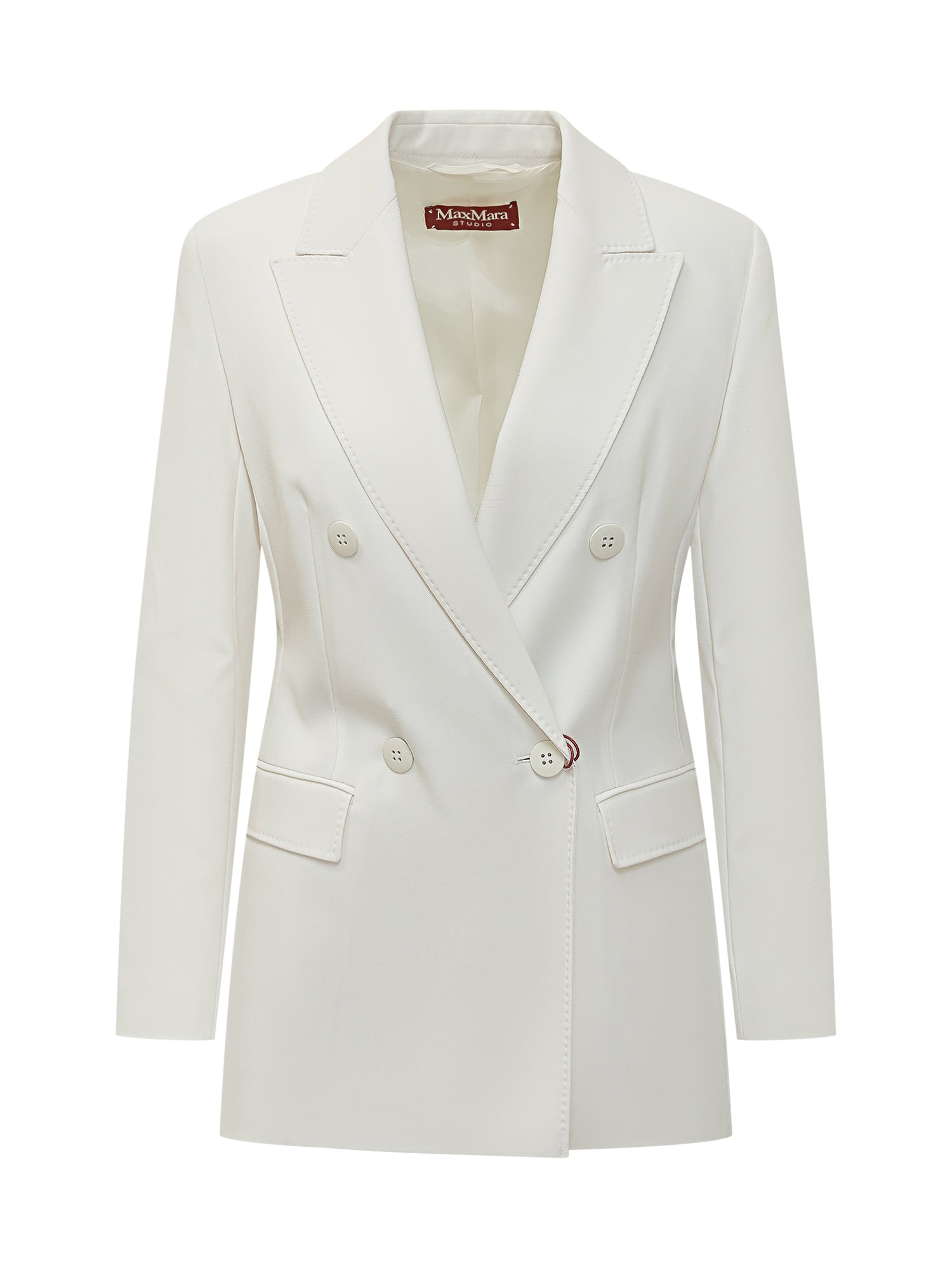 Giacca doppiopetto sartoriale con rever classico, chiusura con bottoni, tasche con patta, linea strutturata e vestibilita elegante.