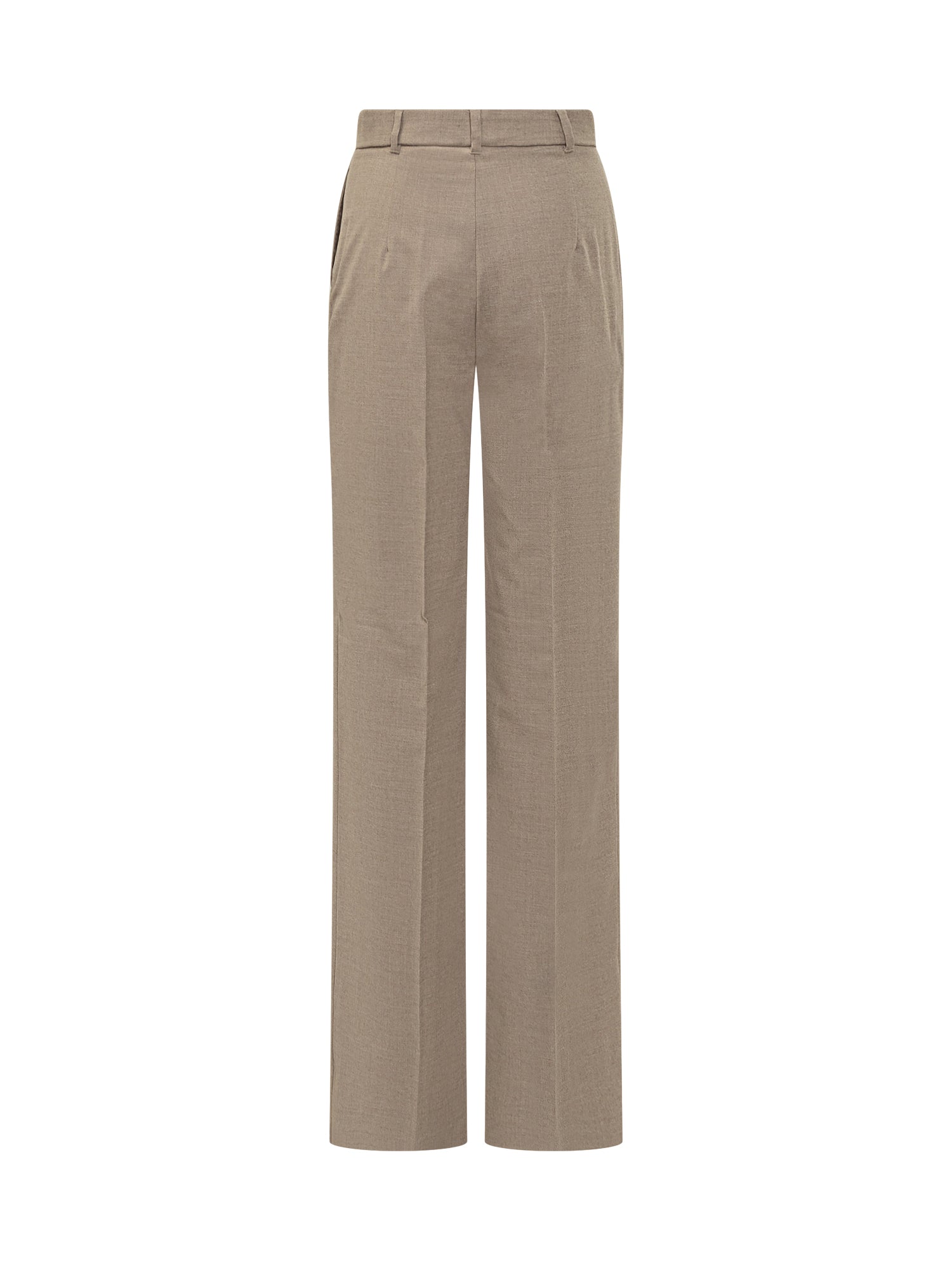 Pantaloni Max Mara Studio in lana beige con linea dritta e piega centrale. Modello a vita media con chiusura a bottone e zip, passanti per cintura e tasche laterali.