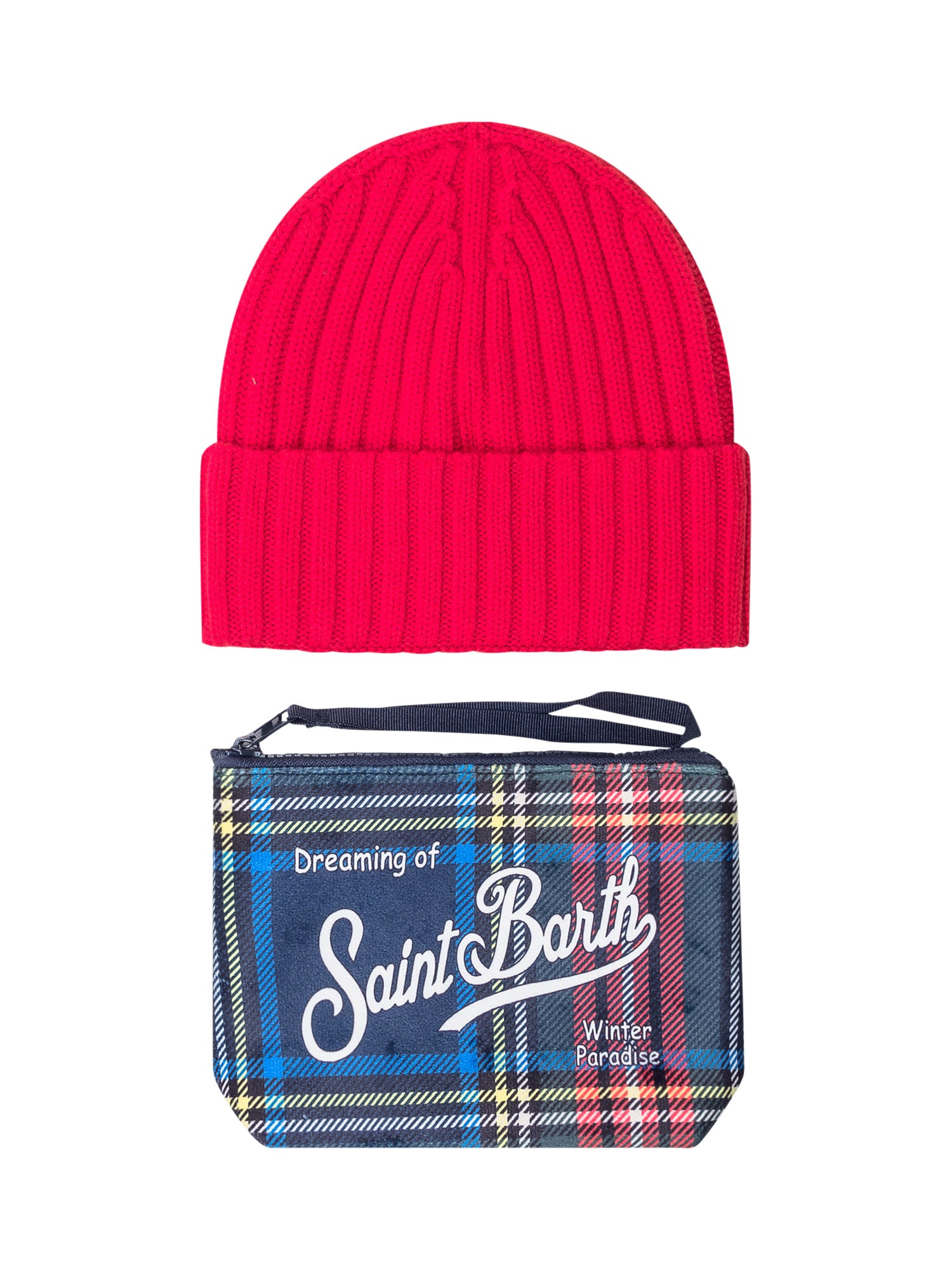 Christmas Box MC2 Saint Barth con cuffia in maglia fucsia e pochette tartan con scritta logo.
