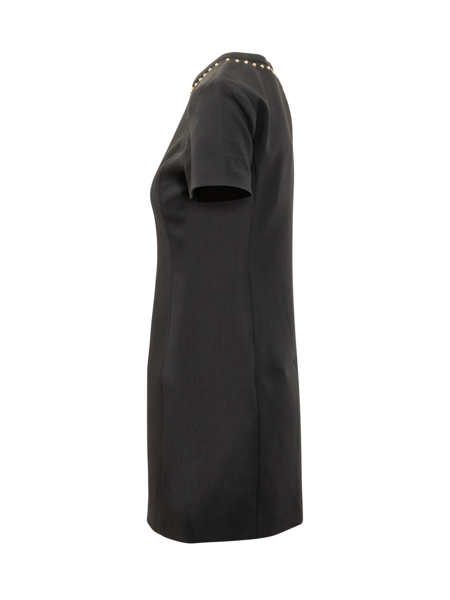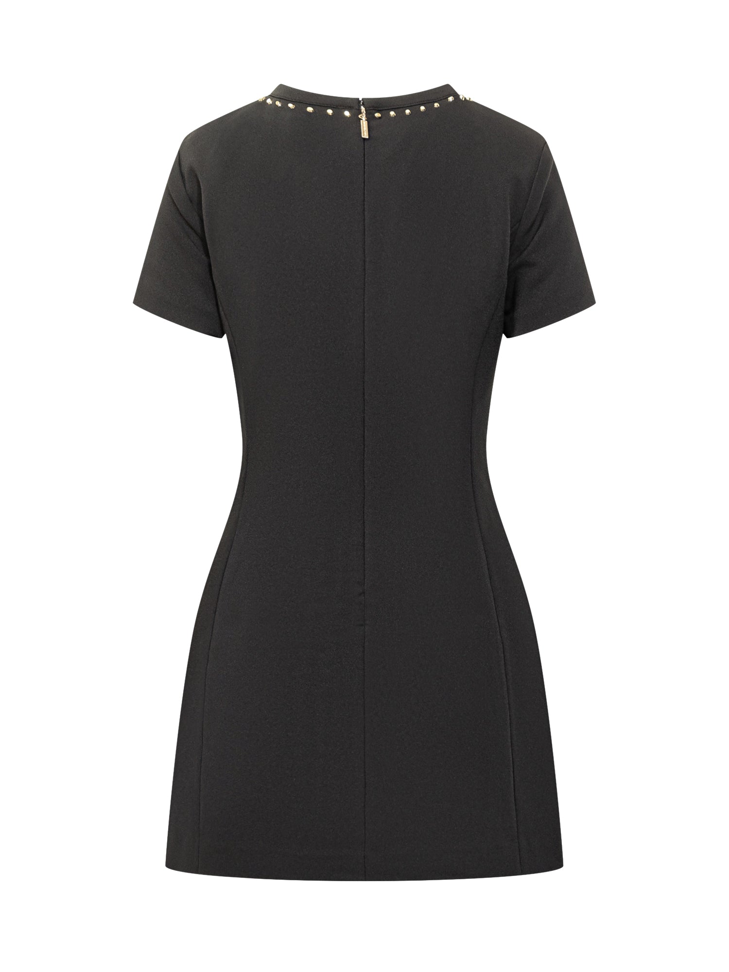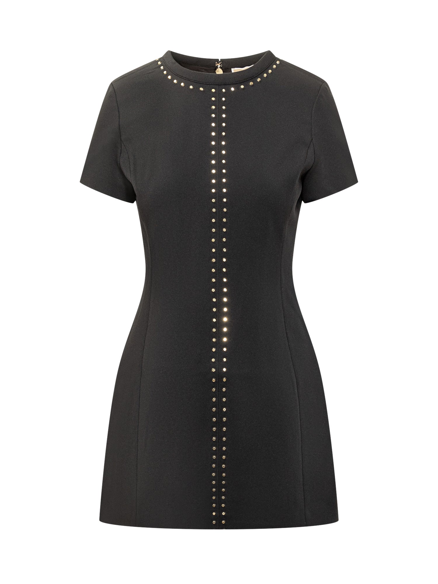 Abito corto nero a maniche corte con dettagli di borchie dorate, rifinito con chiusura a zip e gancio.