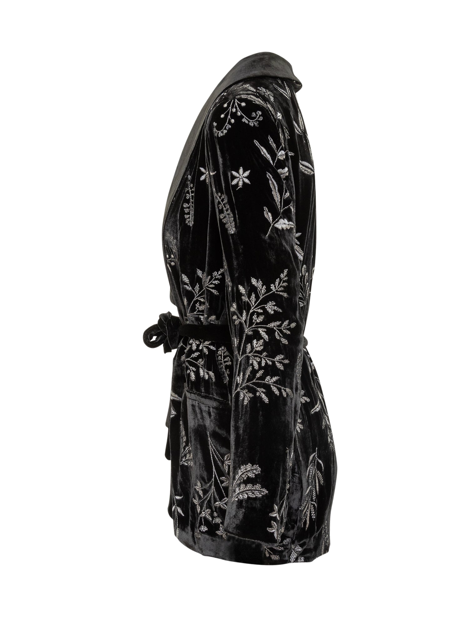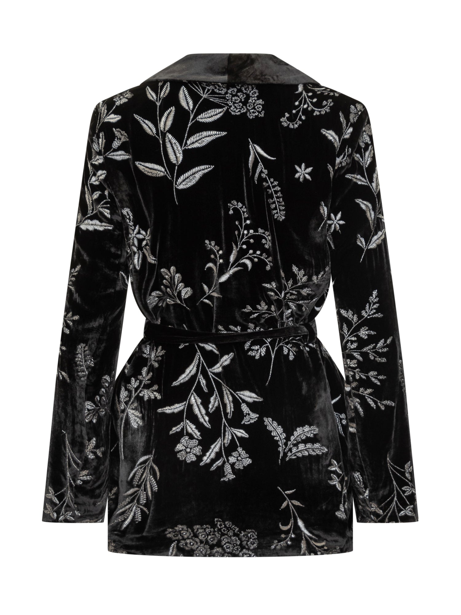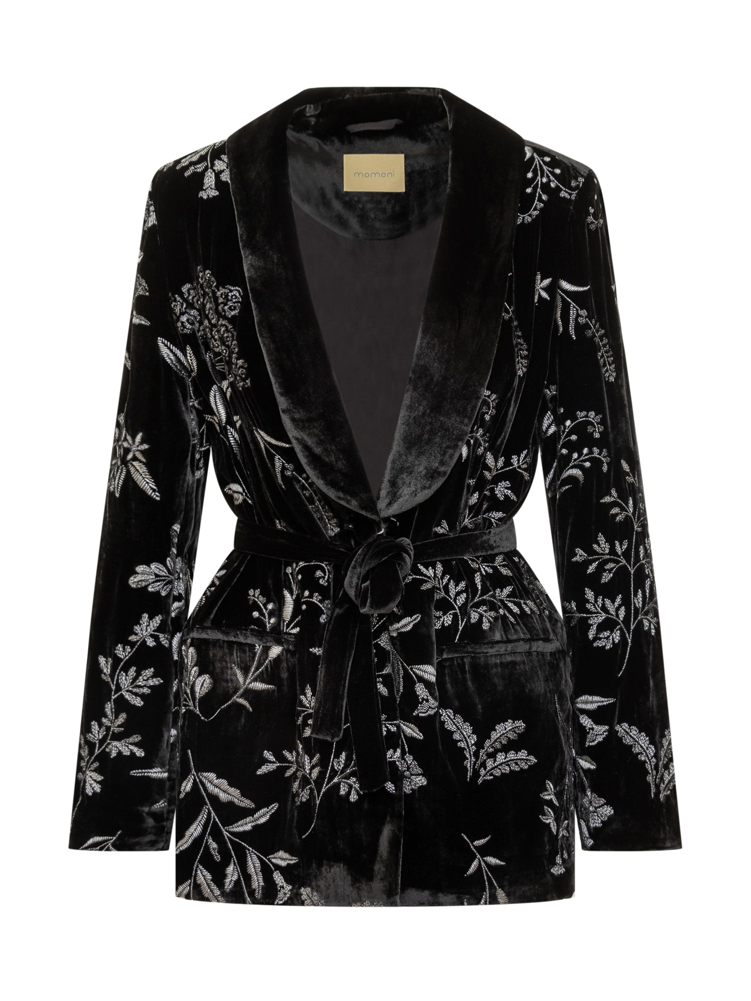 Elegante blazer Monom\u00EC in velluto nero con raffinati ricami floreali. Dotato di cintura in vita, unisce stile sofisticato e femminile.