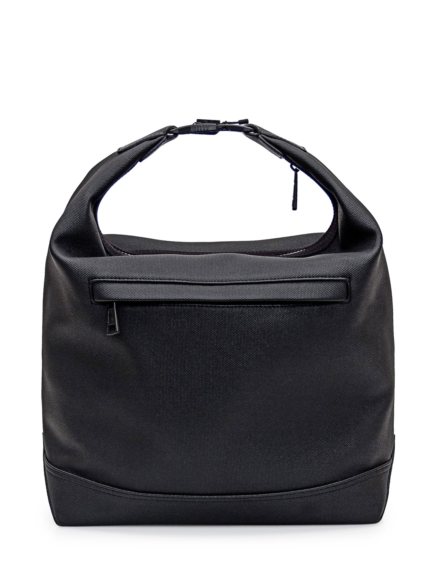 Borsa Tote nera. Un manico con fibbia. Due tasche con zip con due tracolle interne fronte e retro. Tasca interna con zip. Chiusura con zip. Patch Logo in pelle sul davanti.