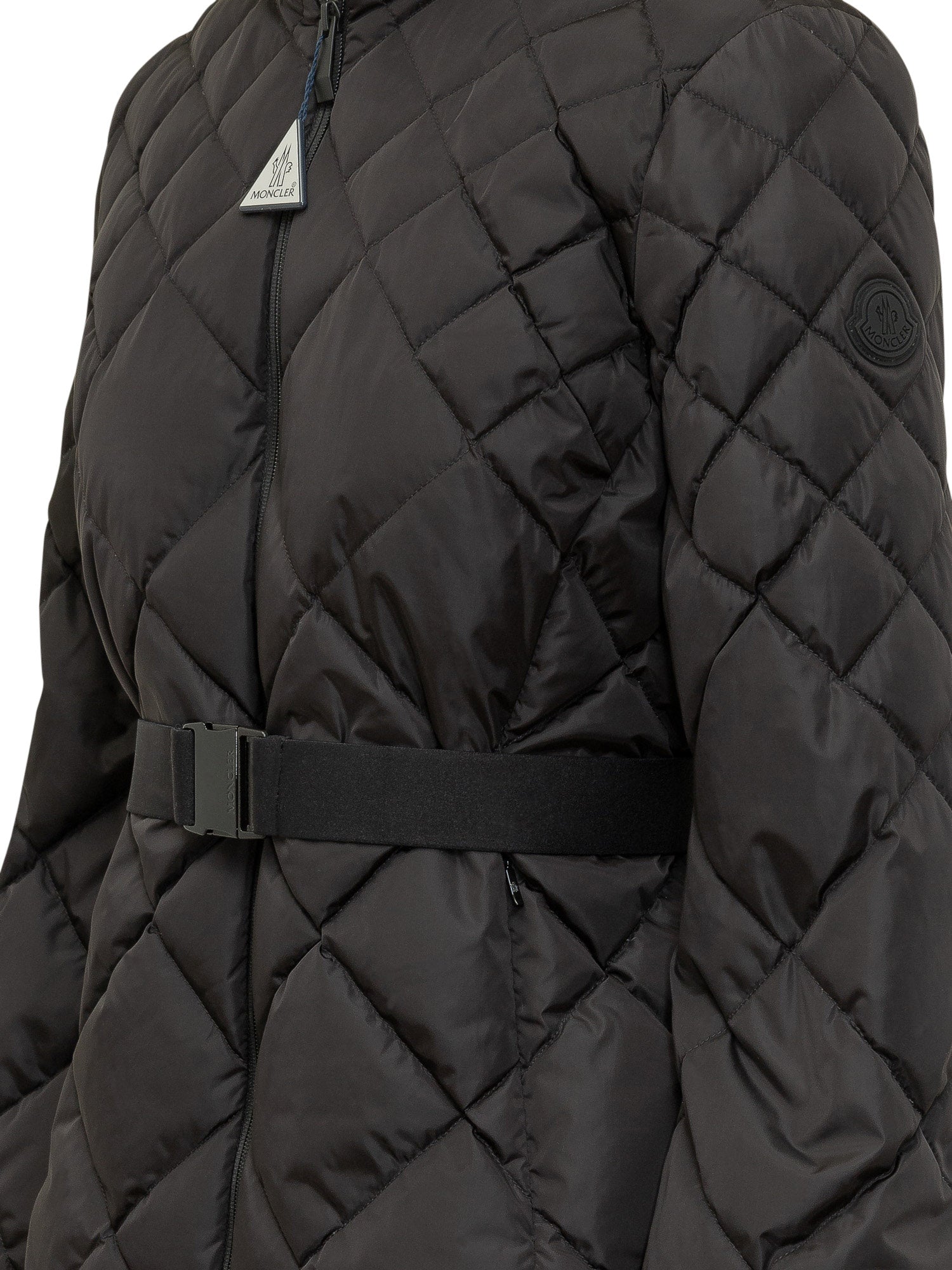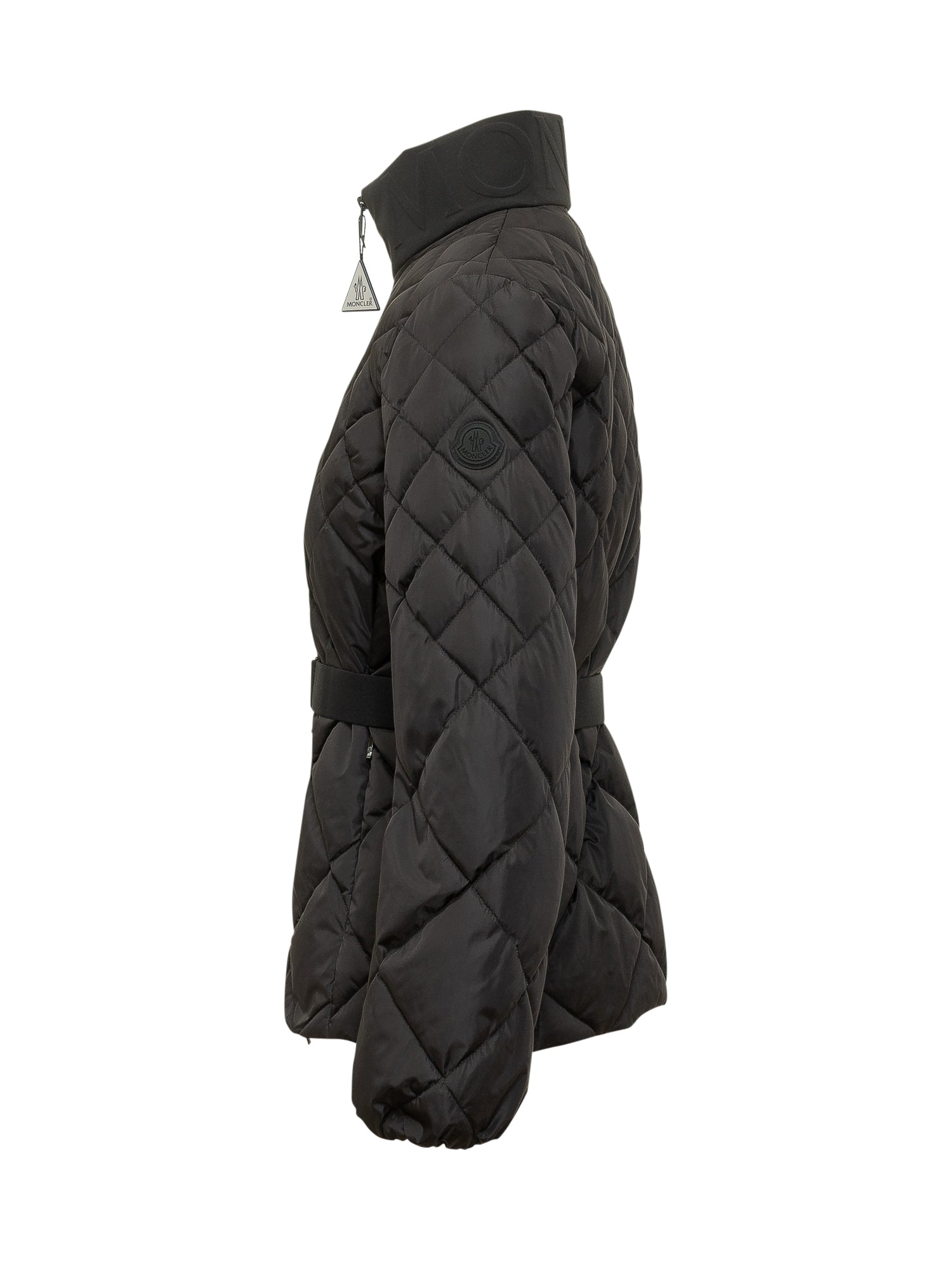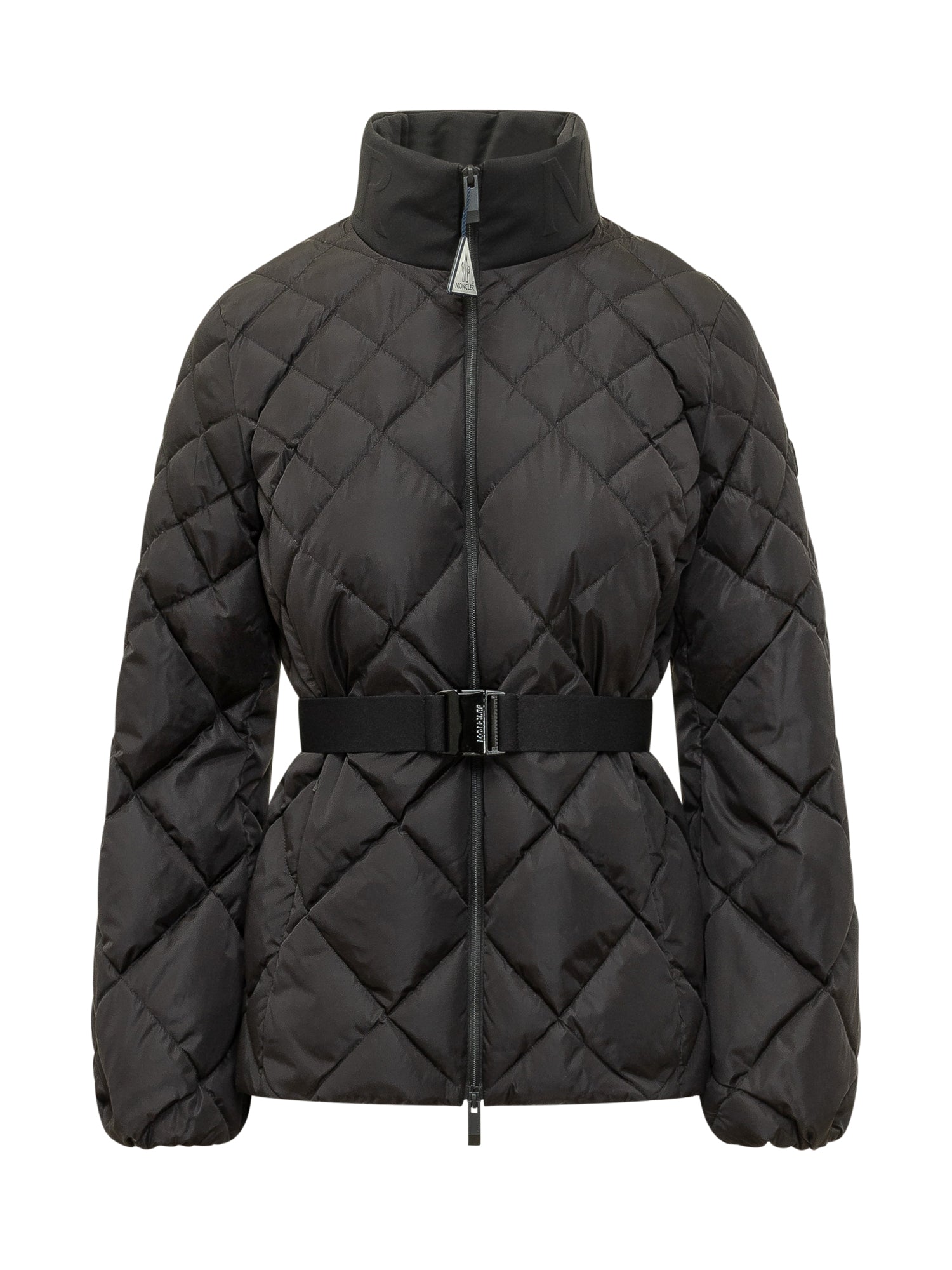 Giacca trapuntata con collo alto e chiusura zip frontale. Cintura in vita per una silhouette definita.