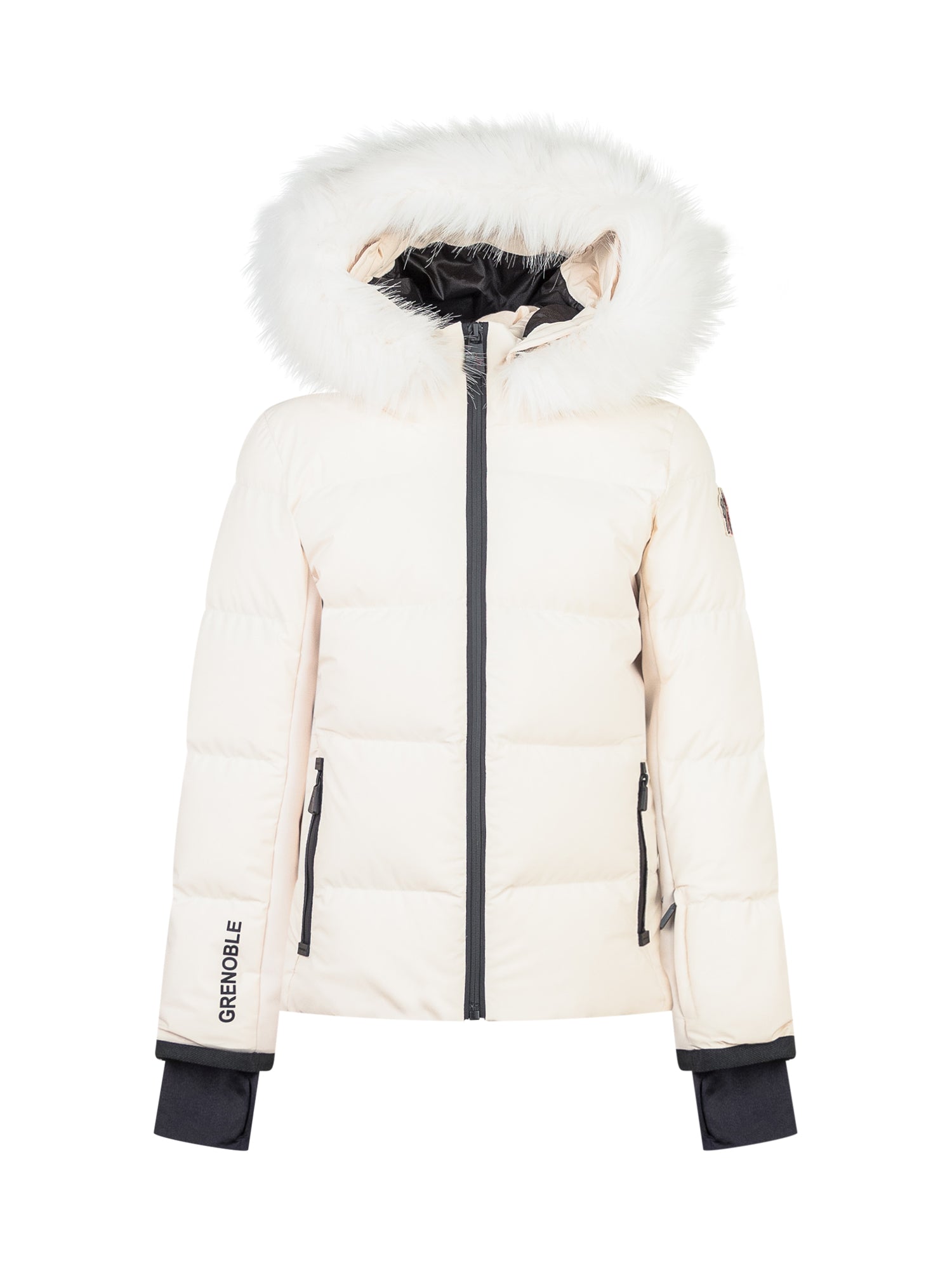 Piumino New Guyane Moncler Kids in bianco, con cappuccio bordato in pelliccia, chiusura zip e tasche laterali.