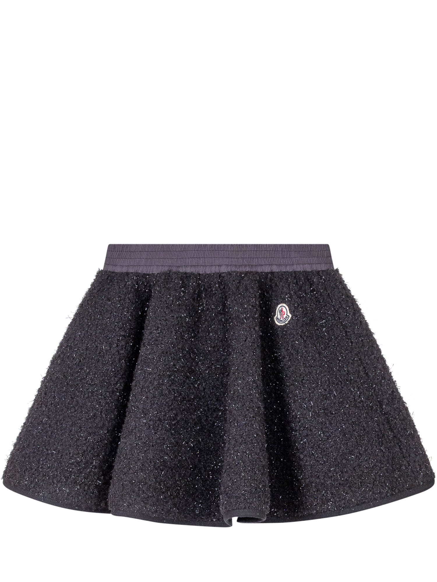 Gonna nera svasata Moncler per bambine, con finitura brillante. Vita elasticizzata e logo laterale.