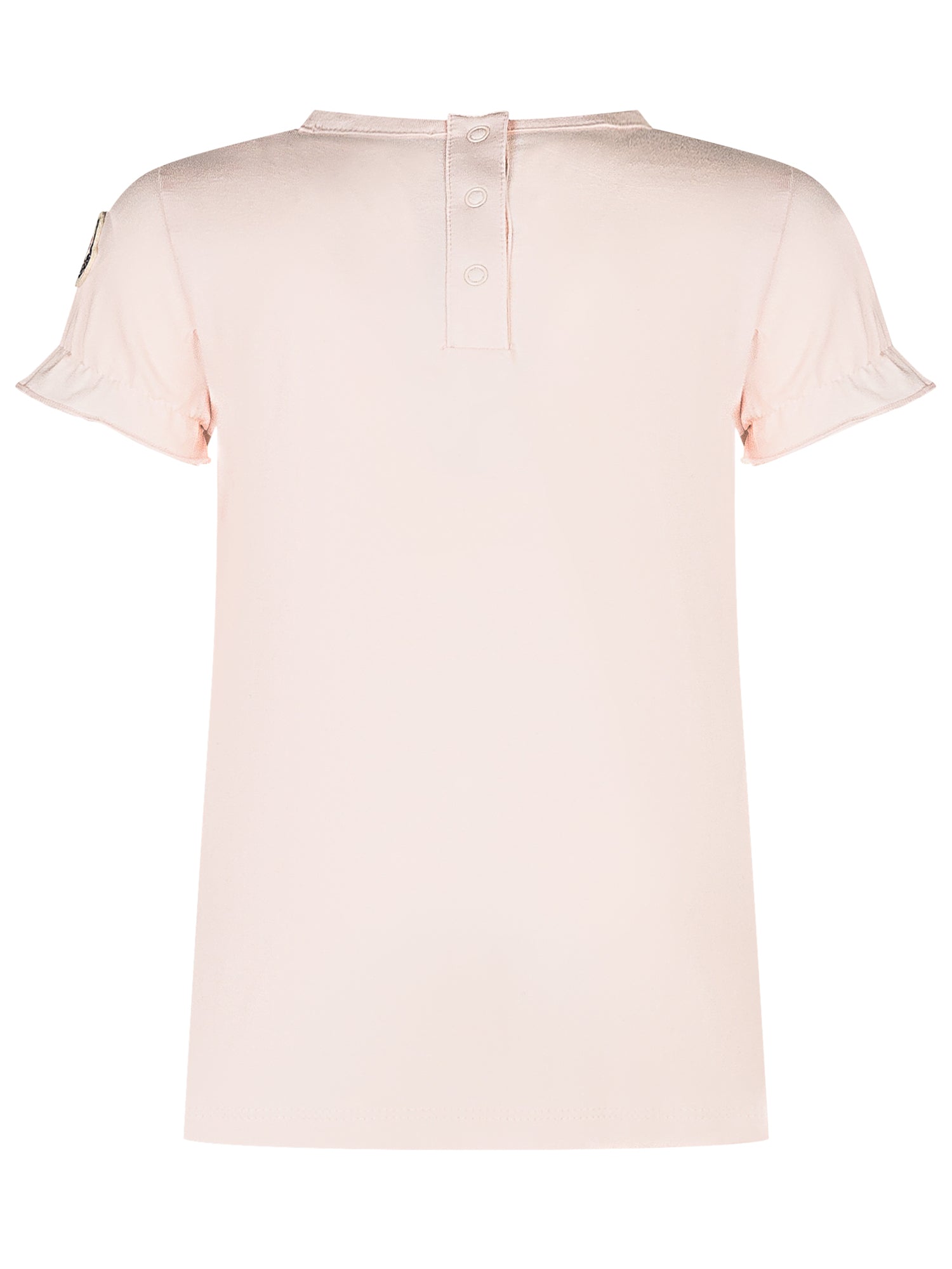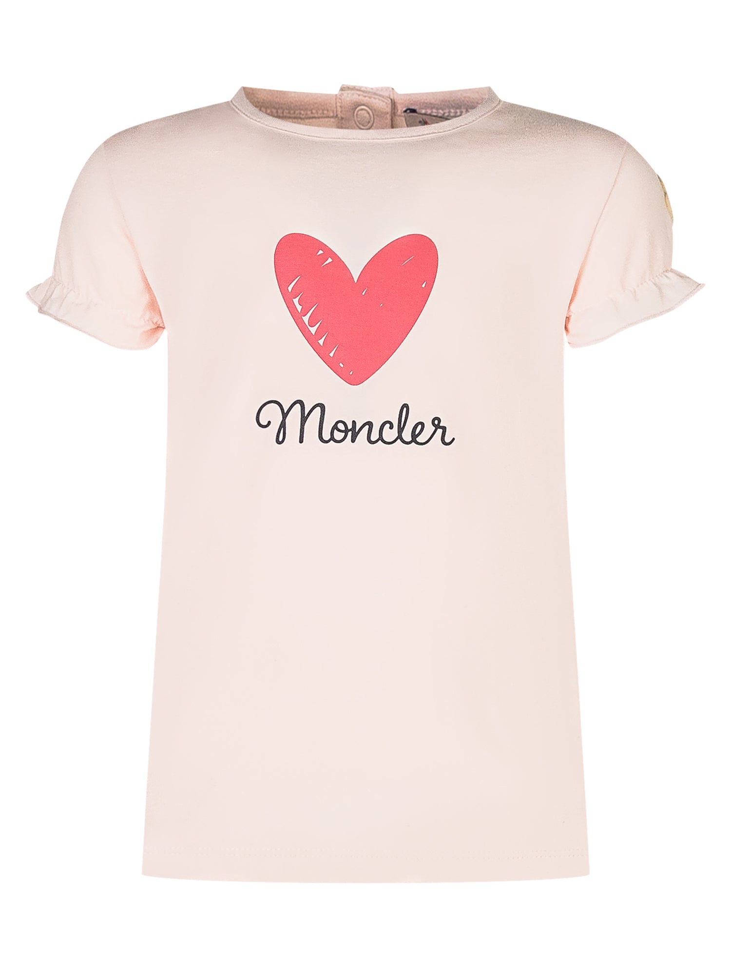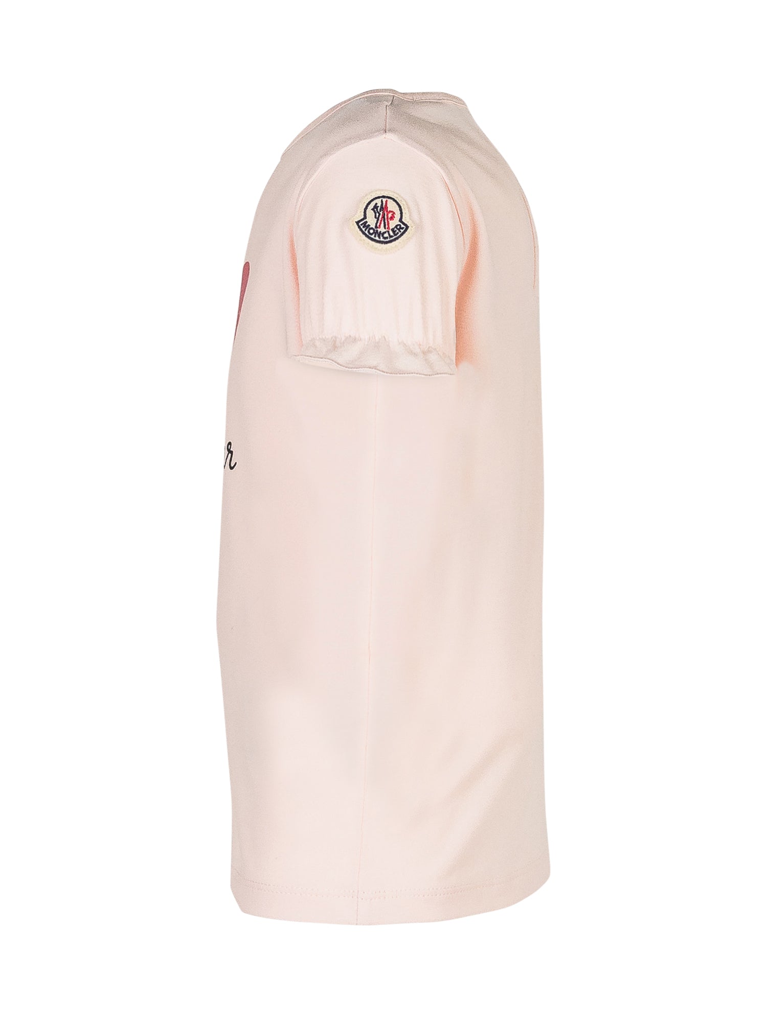T-shirt rosa chiaro con stampa cuore rosso e logo frontale, maniche corte con delicata arricciatura e chiusura a bottoni sul retro.