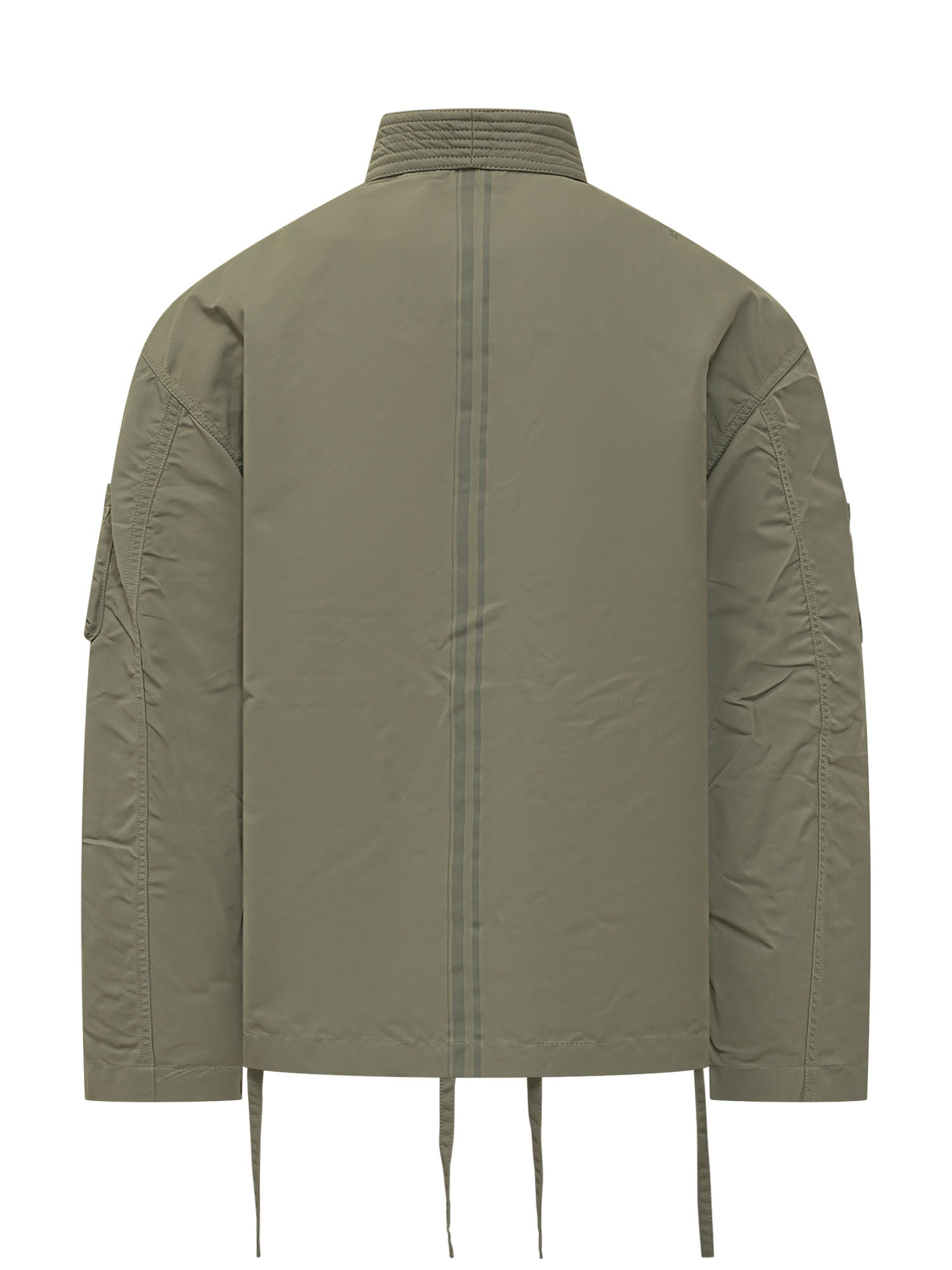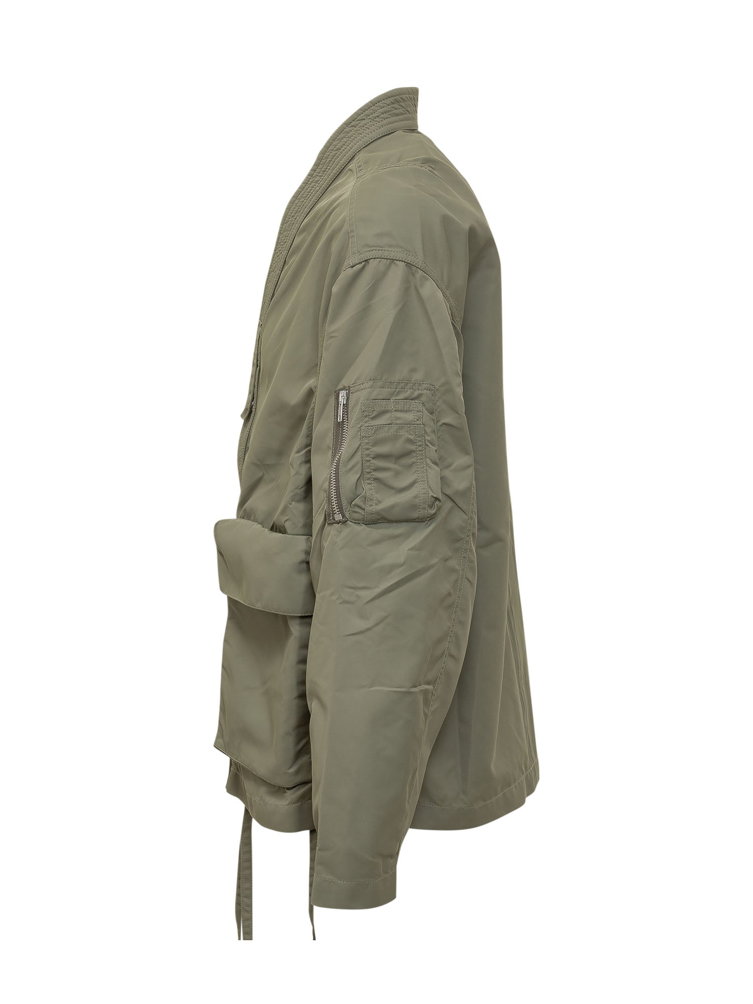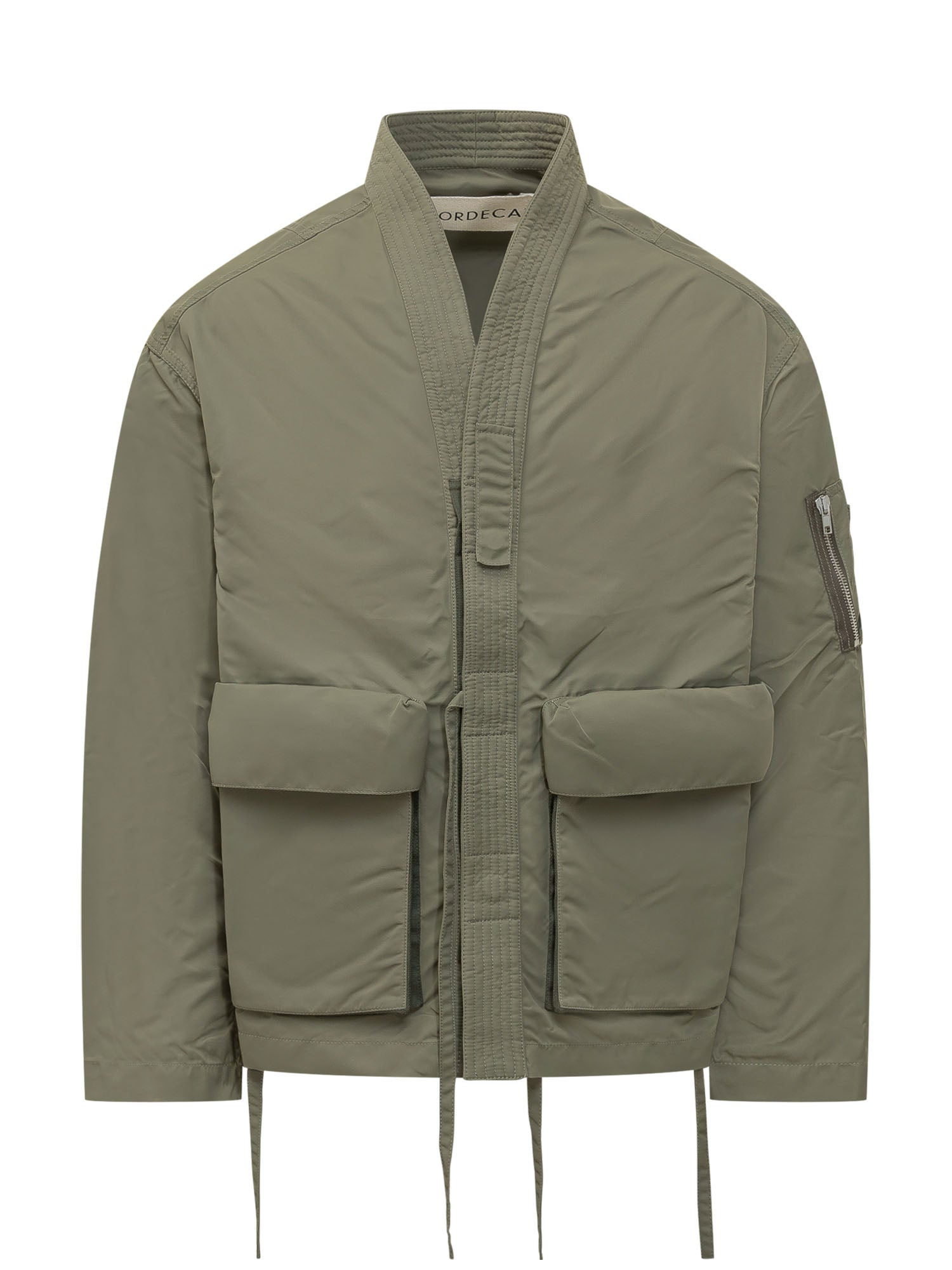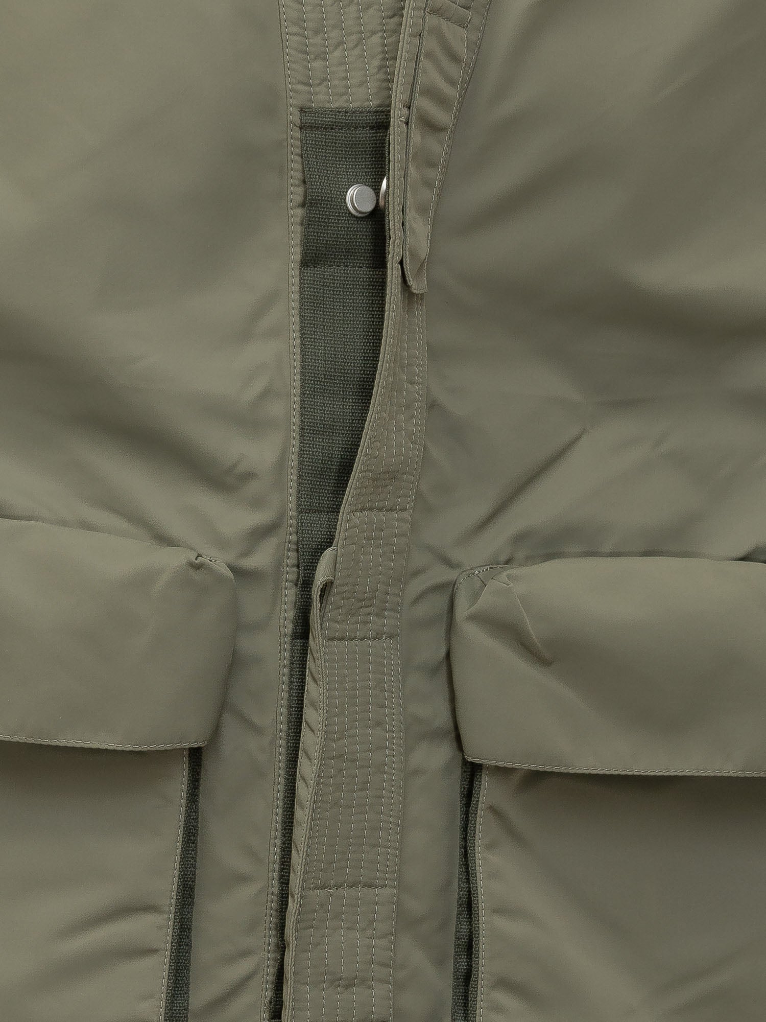 Giacca con scollo a V e chiusura frontale nascosta. Due ampie tasche applicate e tasca con zip sulla manica. Linea ampia con coulisse regolabili.