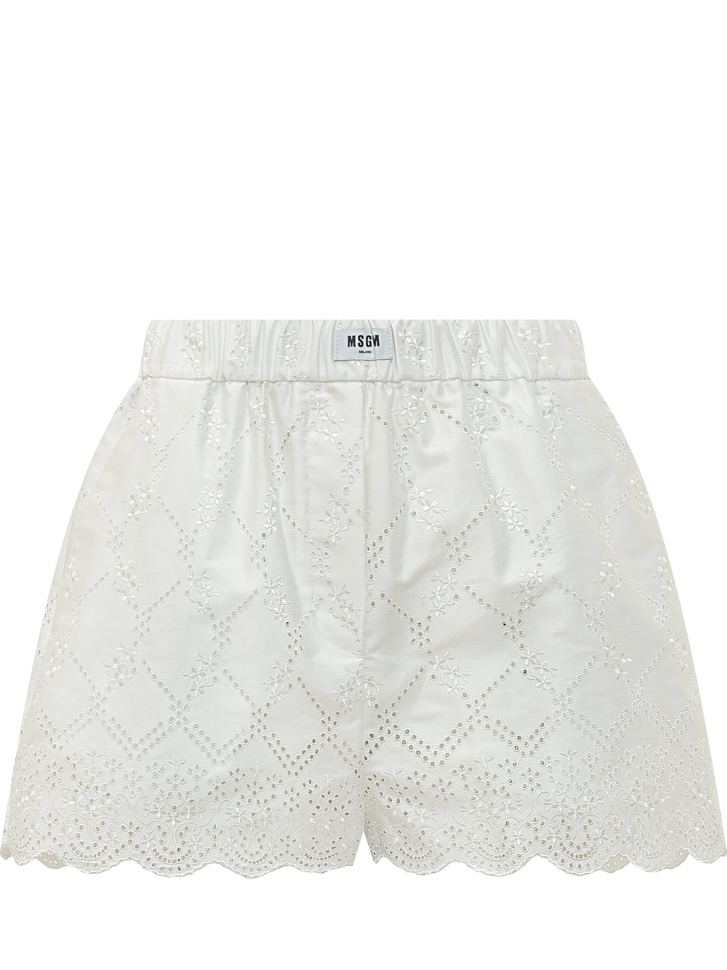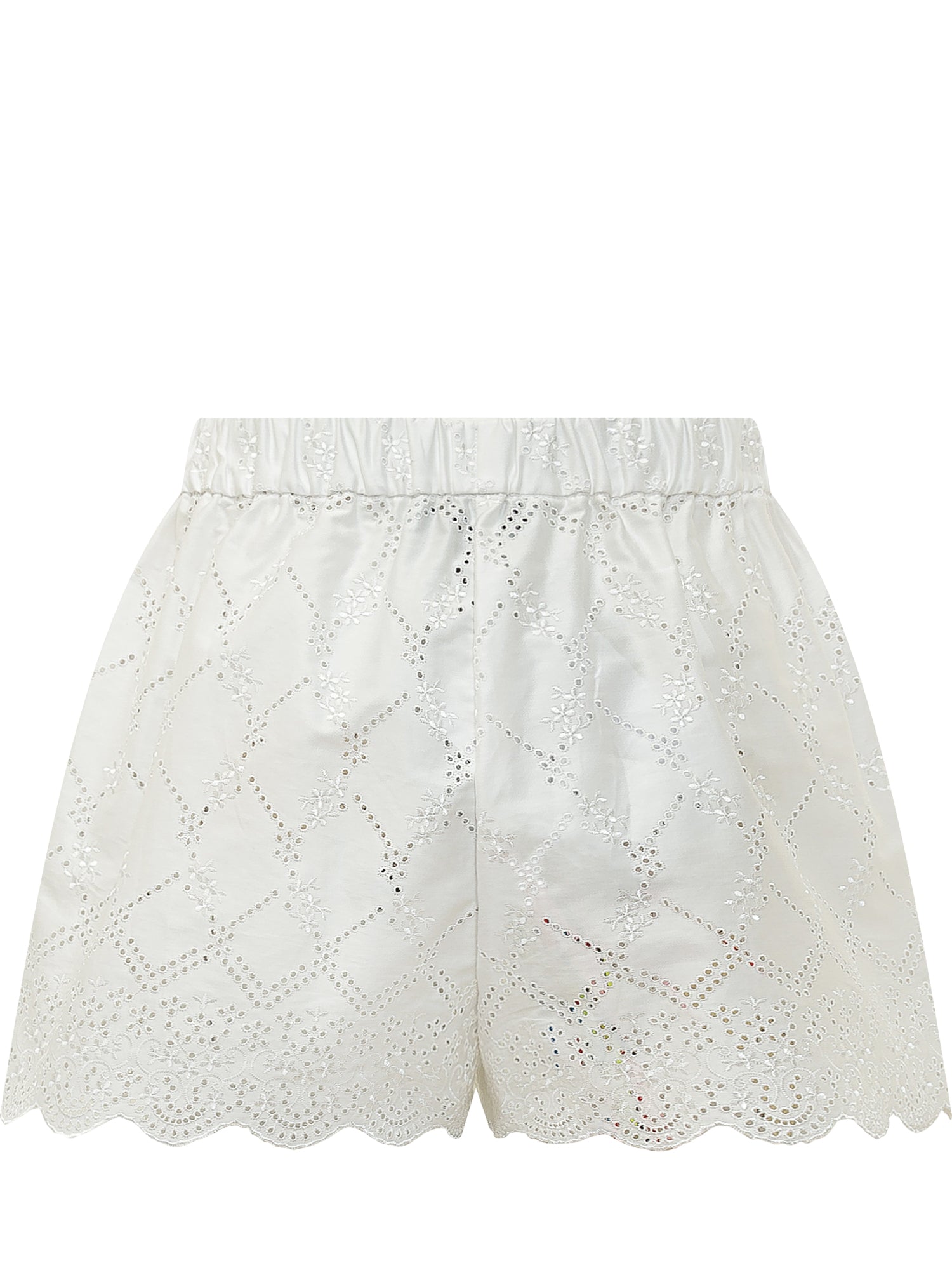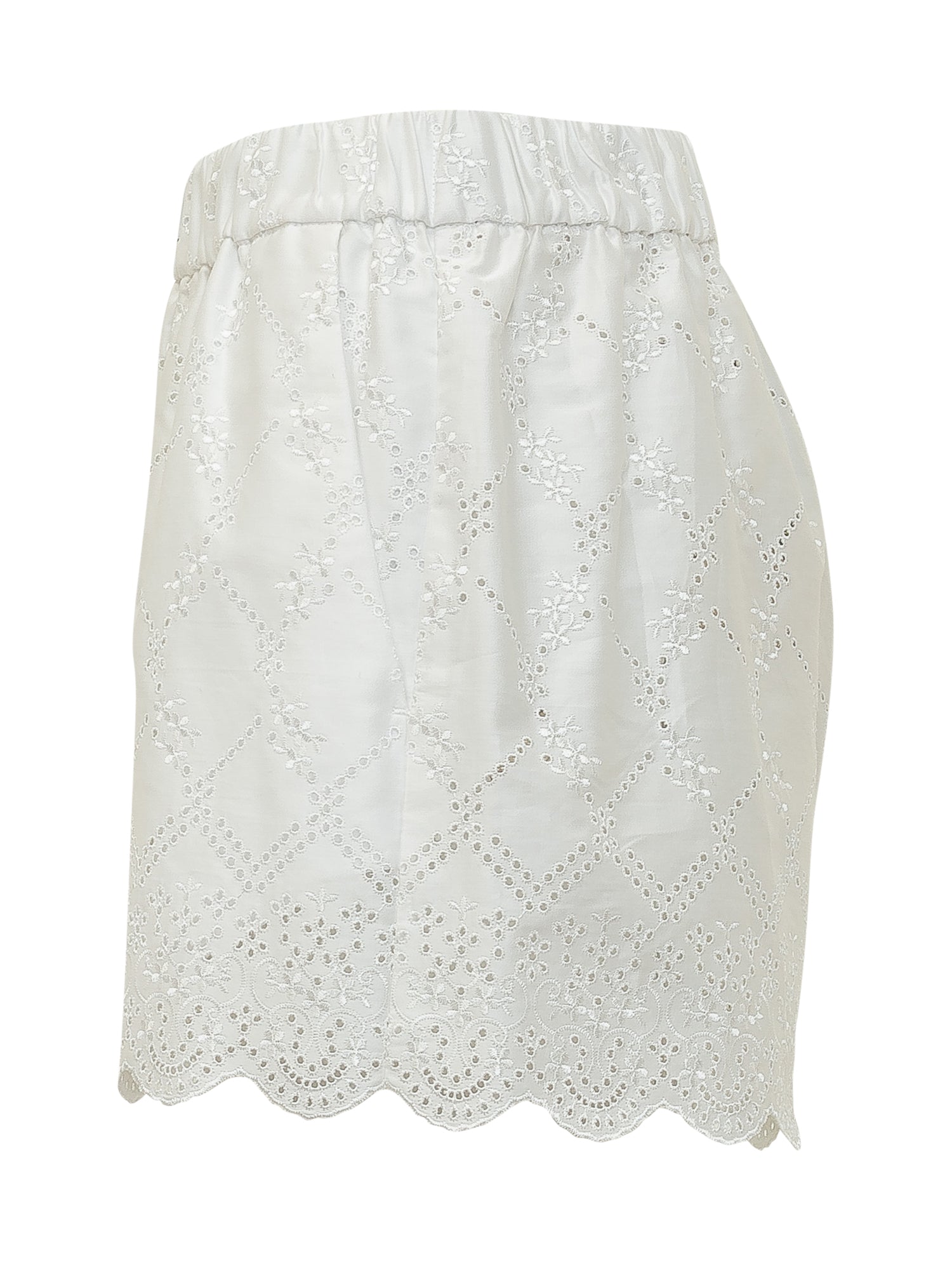 Short in cotone con vita elasticizzata e ricamo sangallo traforato. Orlo smerlato e linea svasata per comfort e stile.