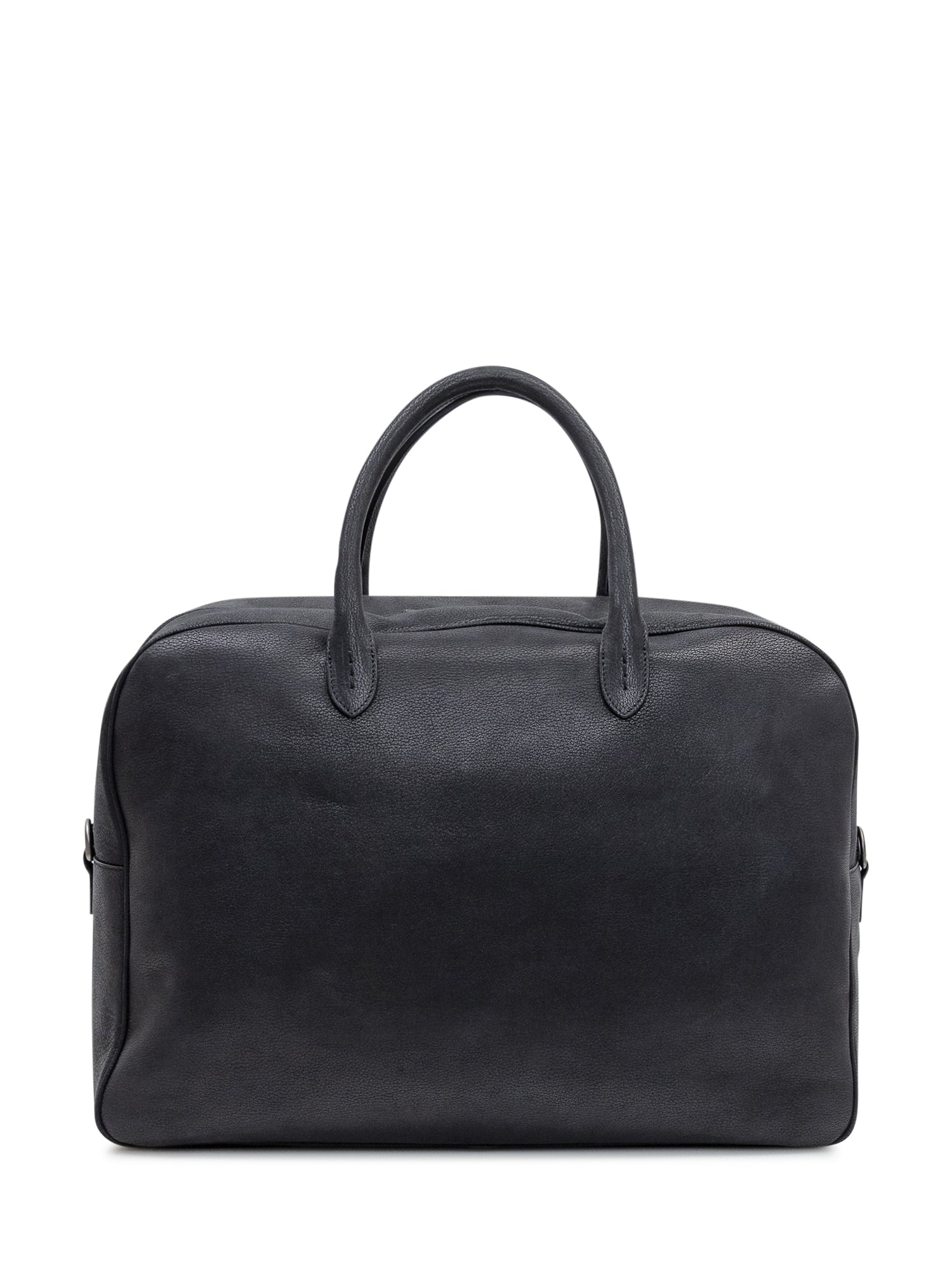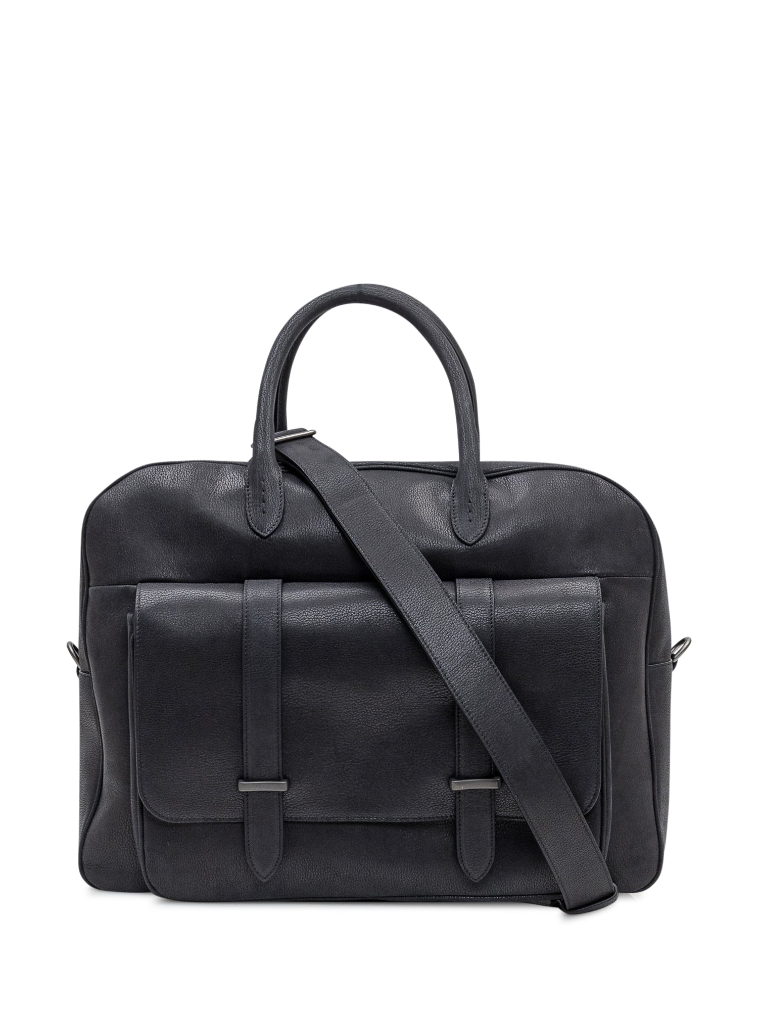 Borsone Orciani in pelle nera con manici superiori e ampia tasca frontale con doppia fibbia.
