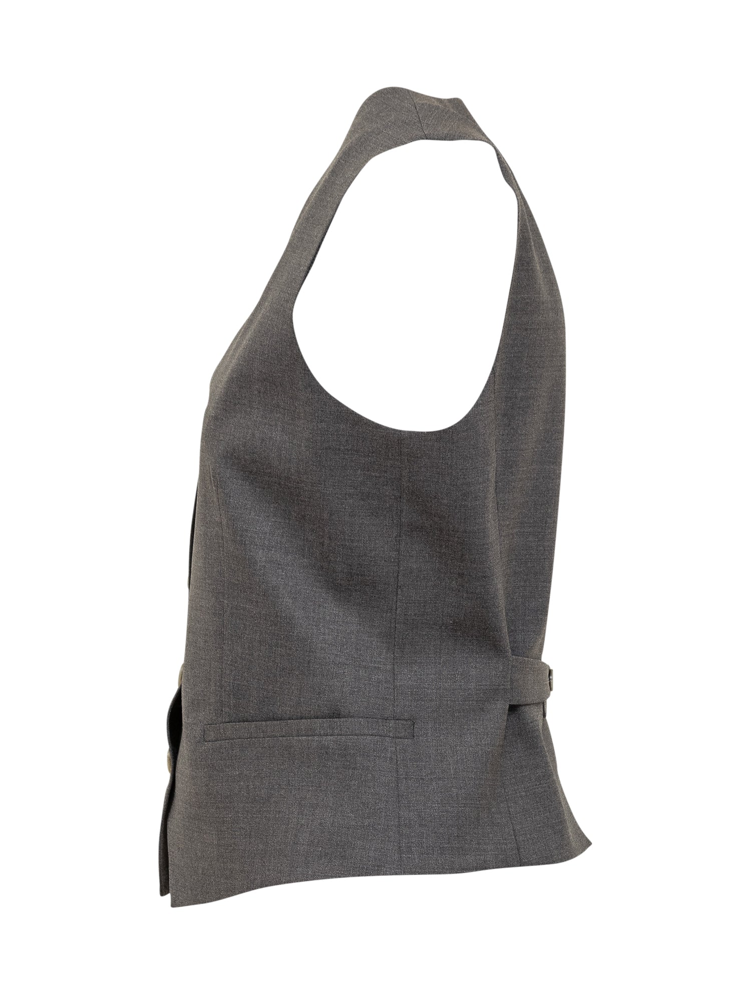 Gilet grigio in lana. Scollo a V. Fibbia con bottone sul retro. Tasche a filetto. Chiusura con bottoni.