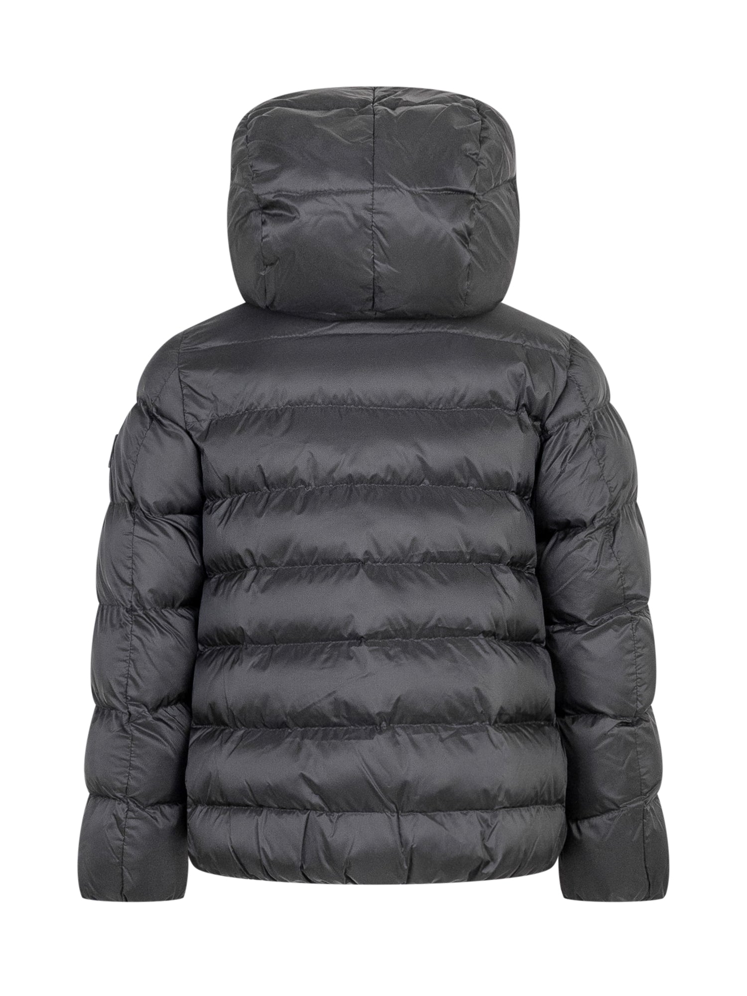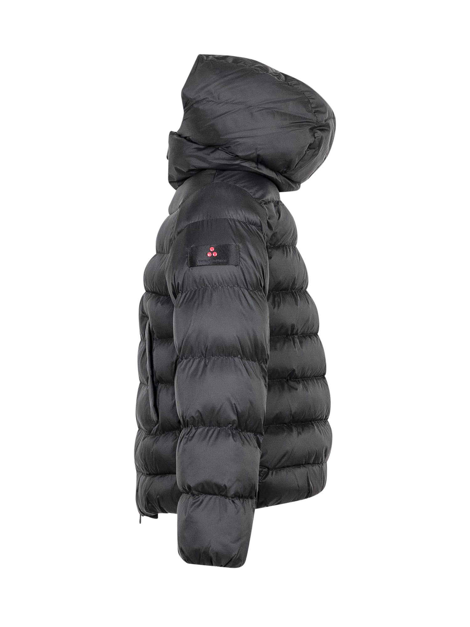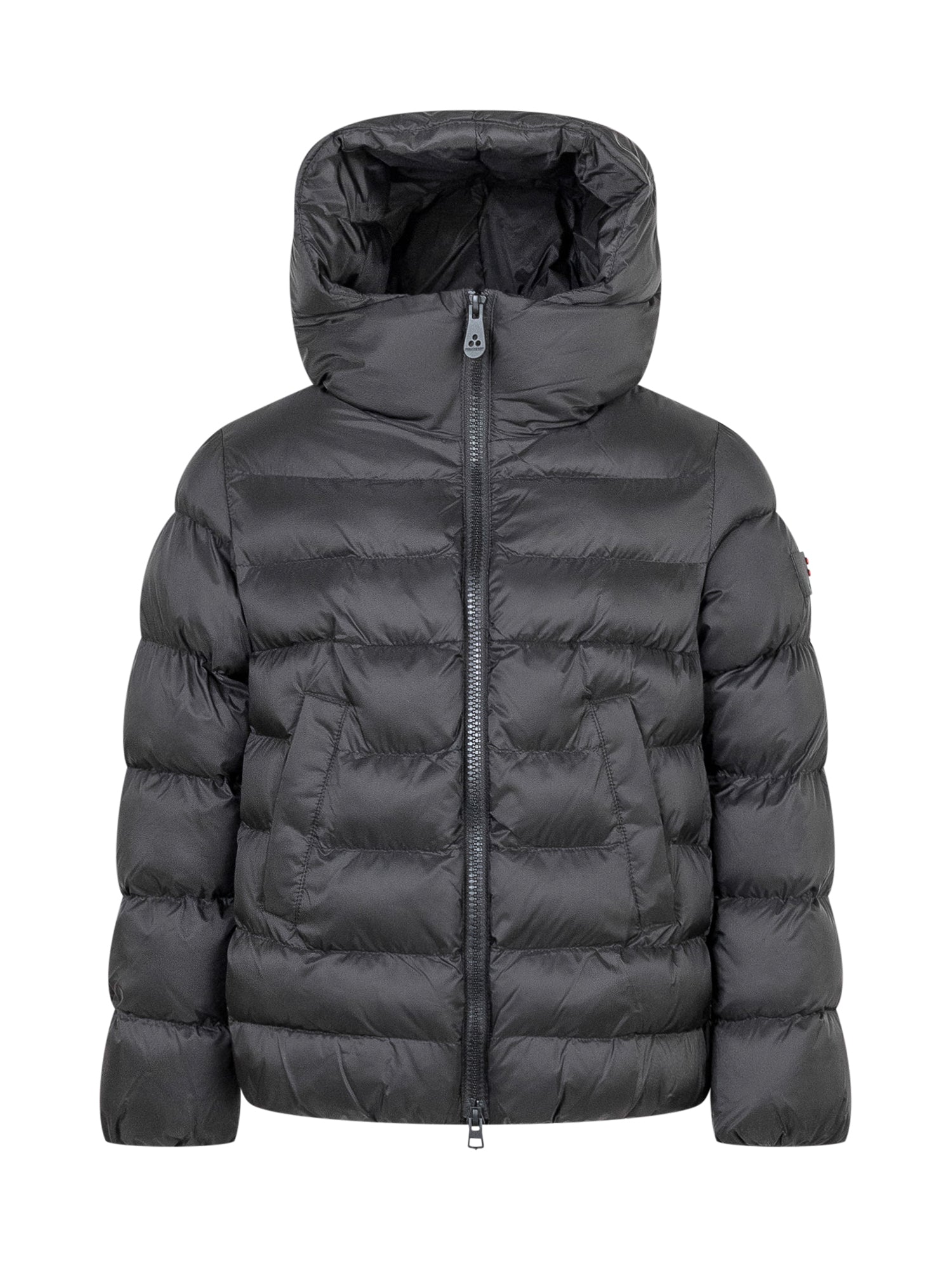 Piumino Peuterey Kids nero con cappuccio e zip frontale. Caldo e leggero, è un capo versatile ideale per la stagione invernale.