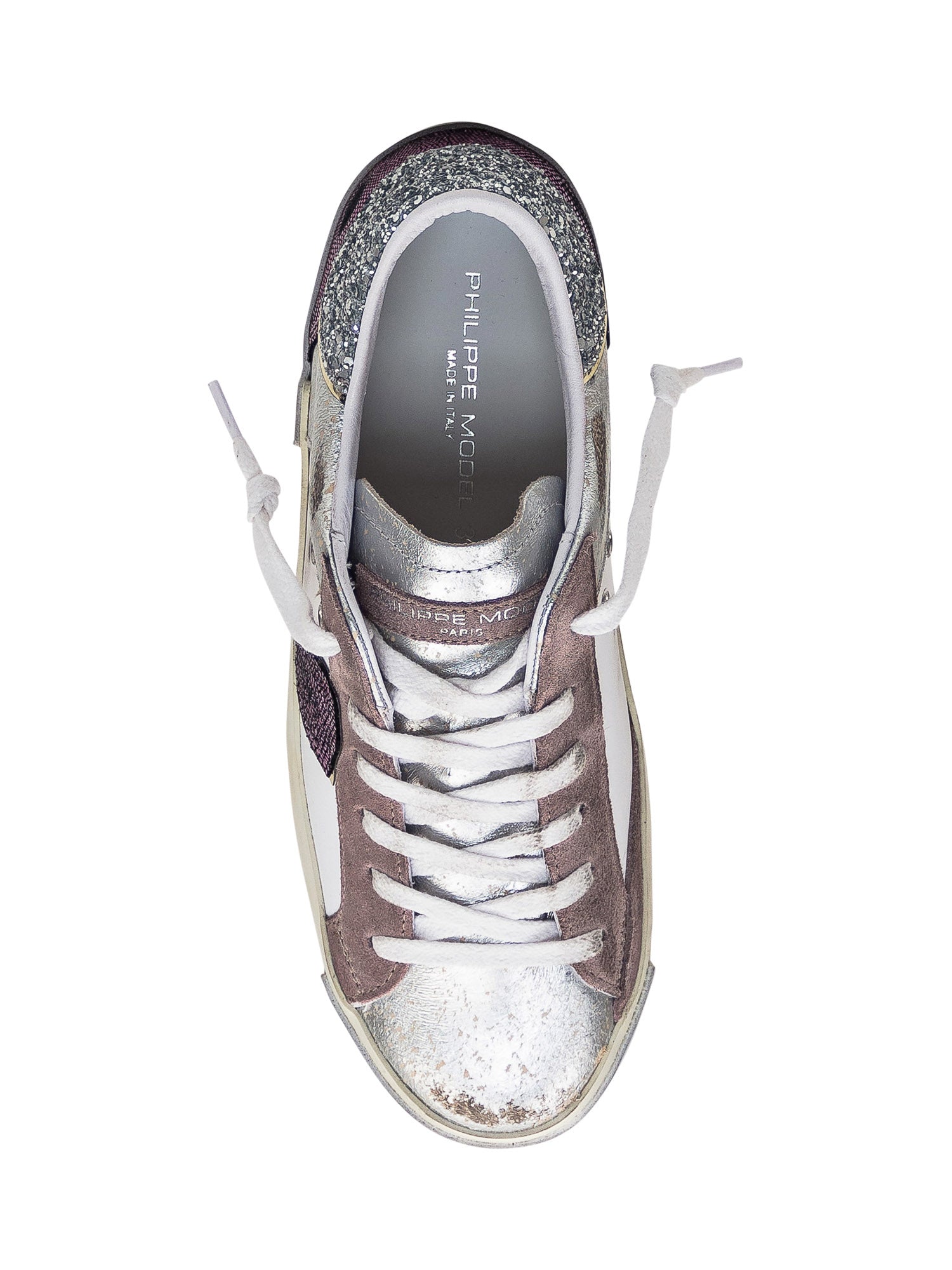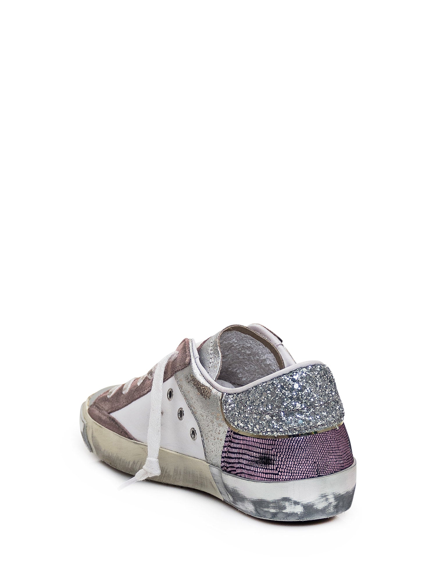 Sneaker bassa. Chiusura con lacci. Inserti in pelle scamosciata. Tallone con glitter. Scudetto patch con glitter sul lato. Logo su linguetta.