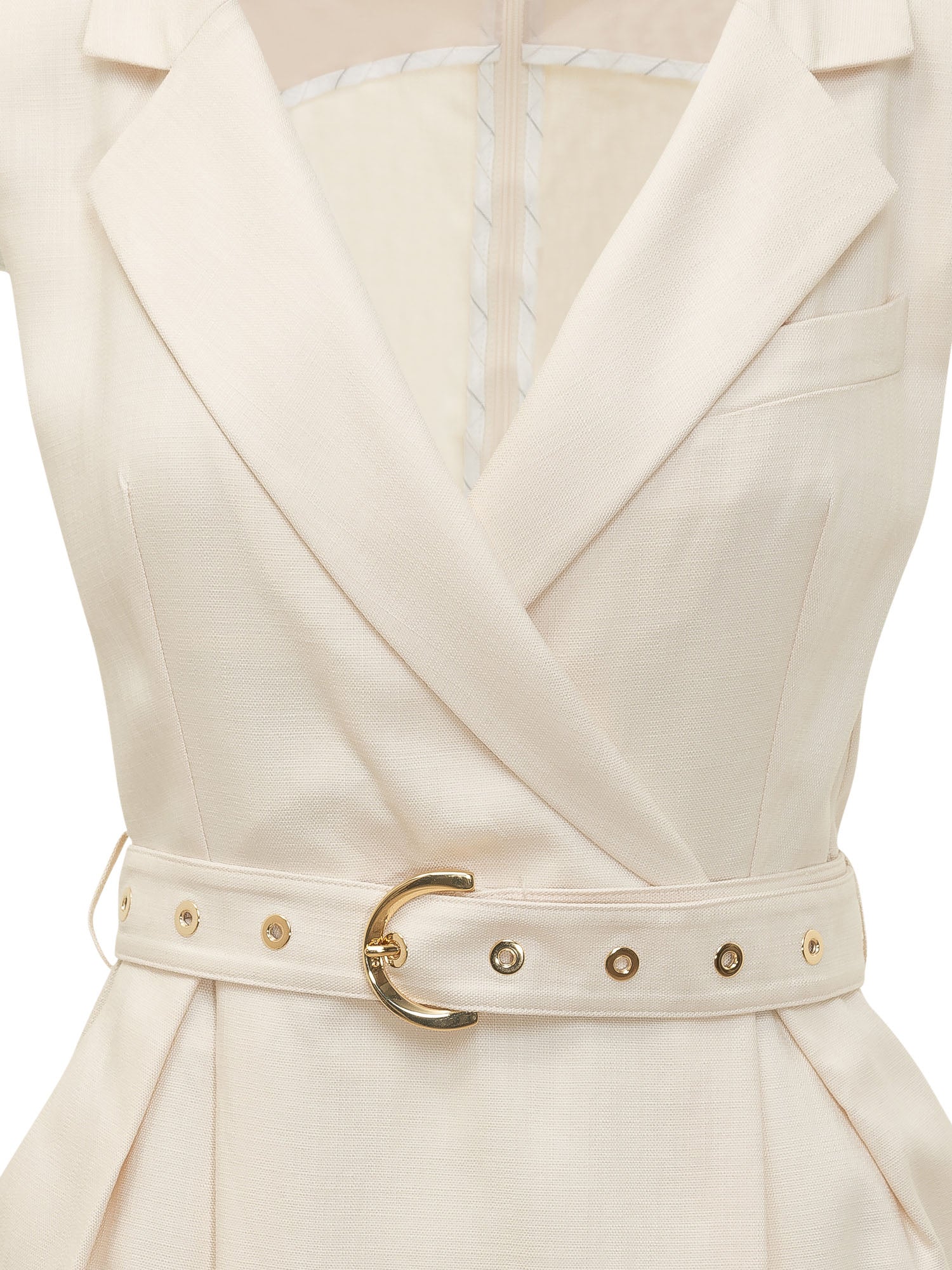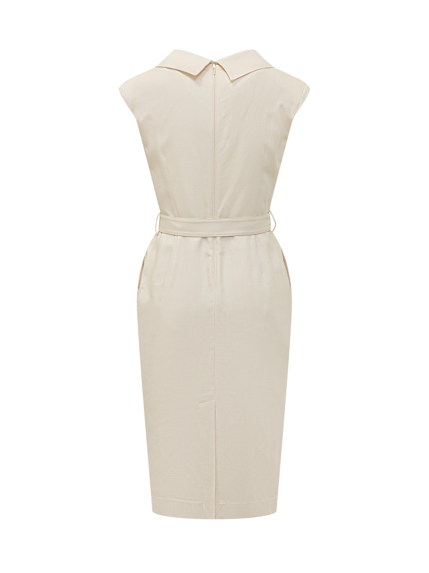 Abito midi con scollo a rever e design incrociato sul davanti. Modello smanicato con tasche laterali e cintura coordinata con fibbia metallica. Linea aderente con lunghezza al ginocchio, ideale per look eleganti e strutturati.