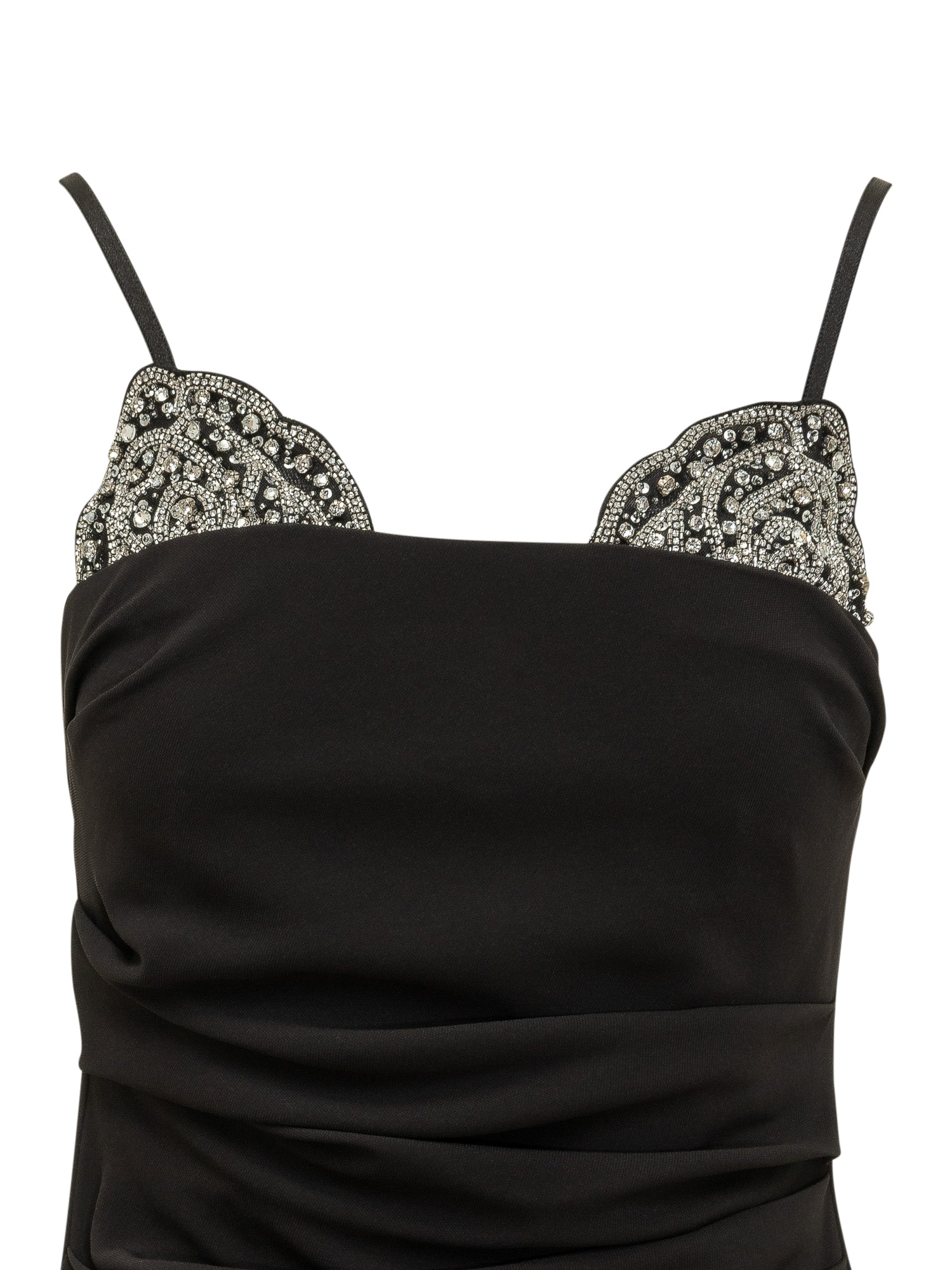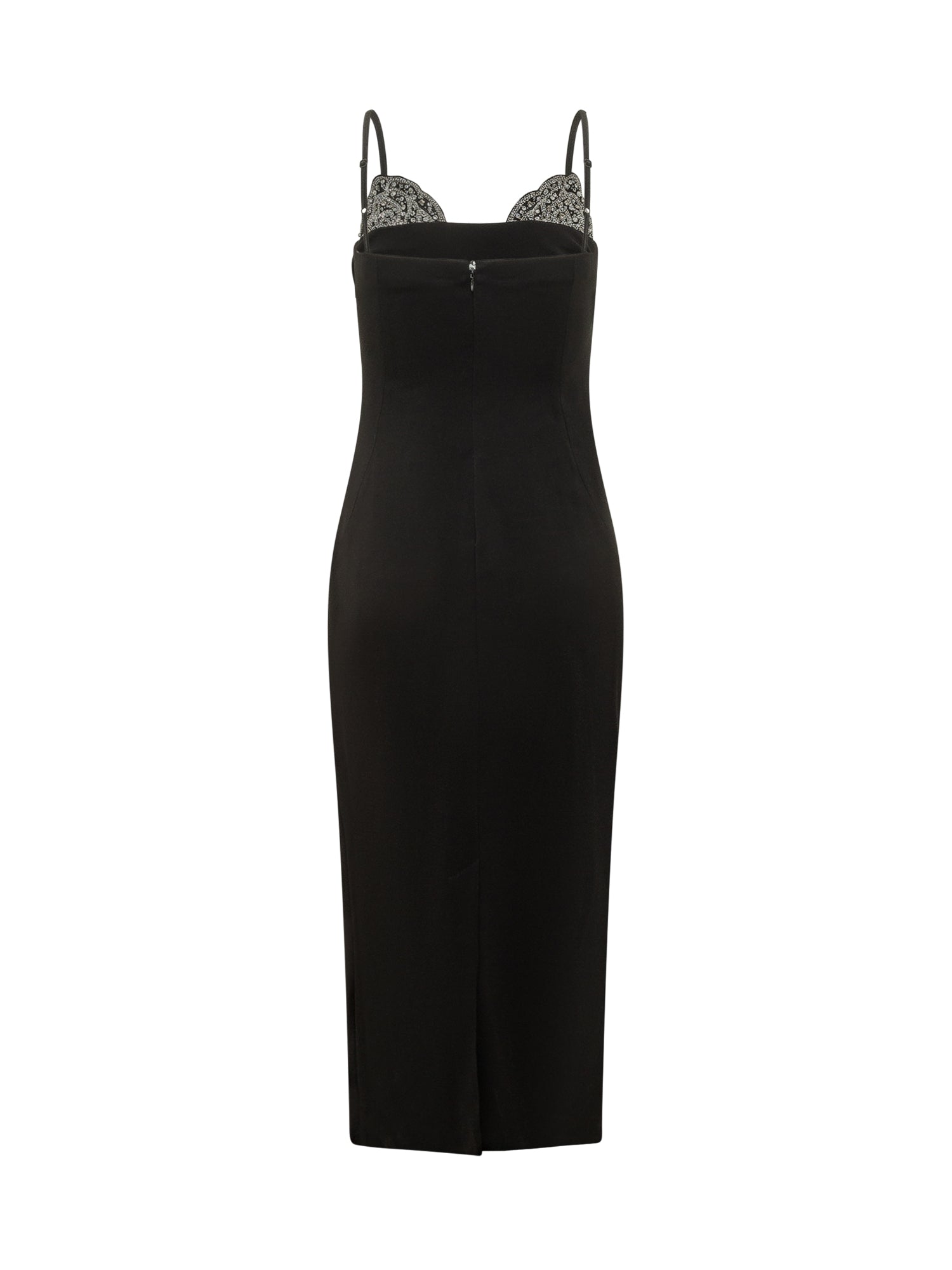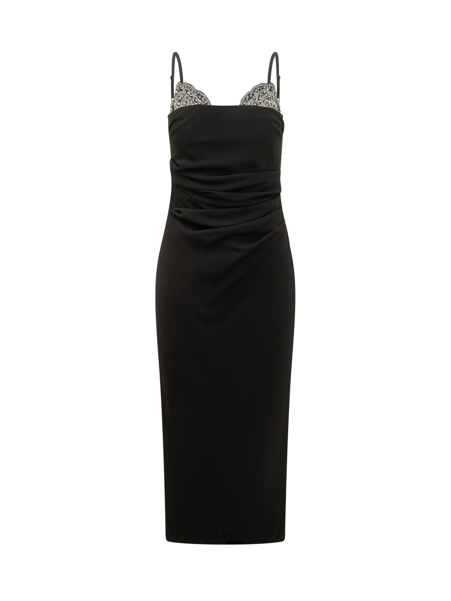 Abito midi aderente con spalline sottili e raffinati inserti gioiello sul décolleté. Design drappeggiato in vita che valorizza la silhouette, perfetto per serate ed eventi eleganti.