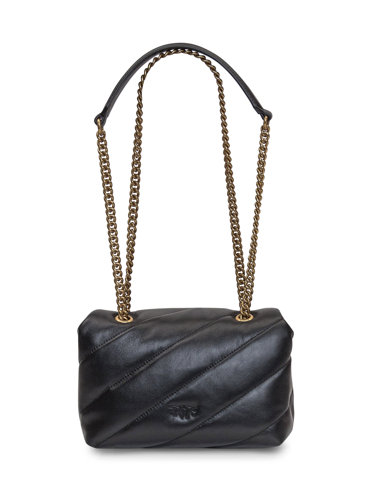 Borsa nera. Tracolla in catena. Chiusura con patta e incastro. Due scomparti con tasca con zip. Fibbia logo sul davanti.