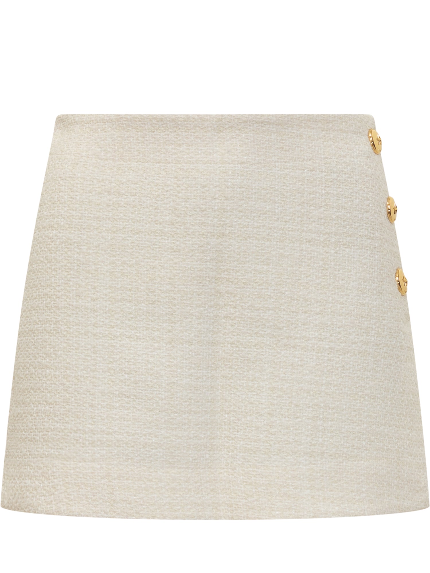 Minigonna Pinko in tweed beige con eleganti bottoni dorati laterali.