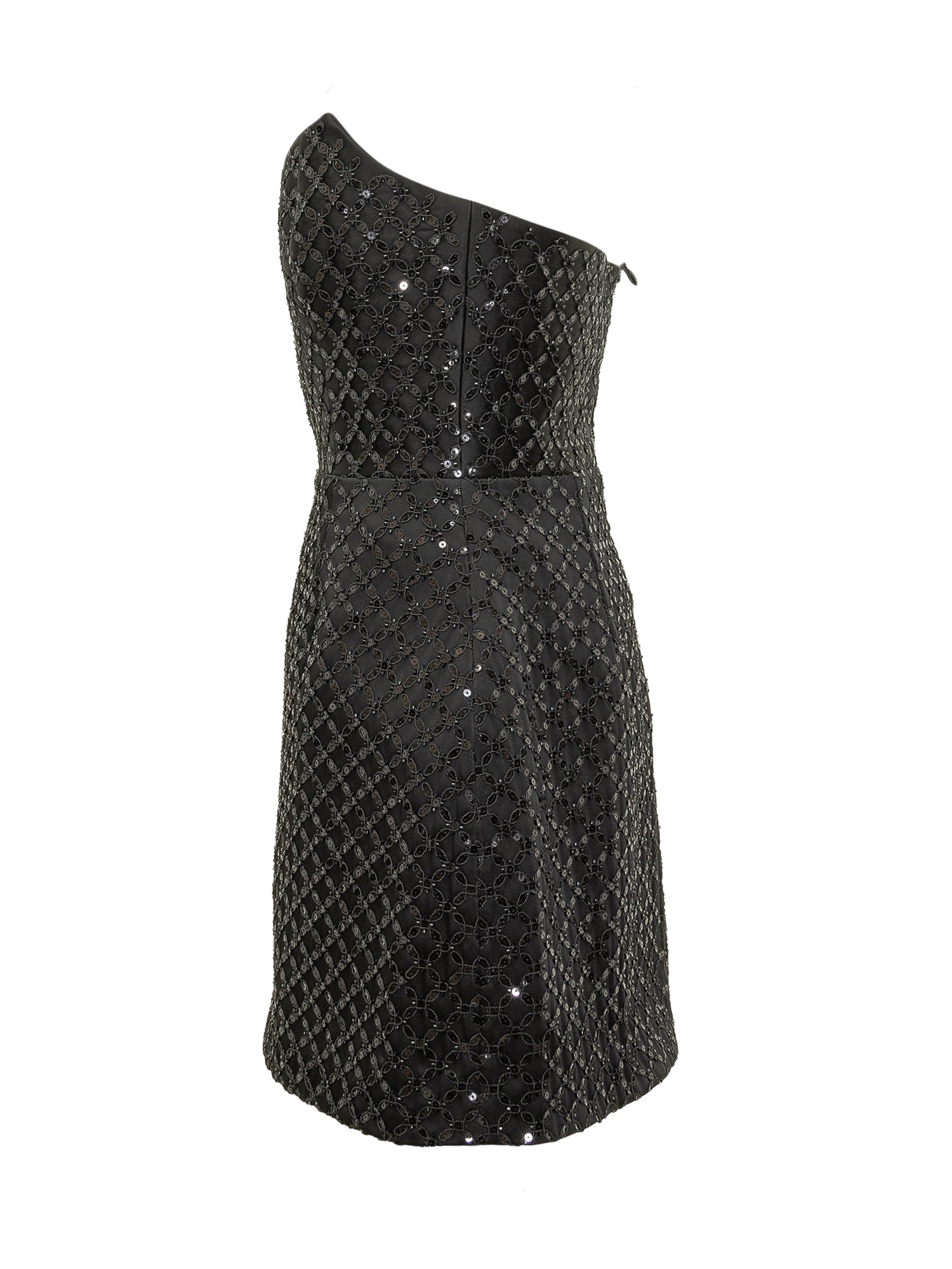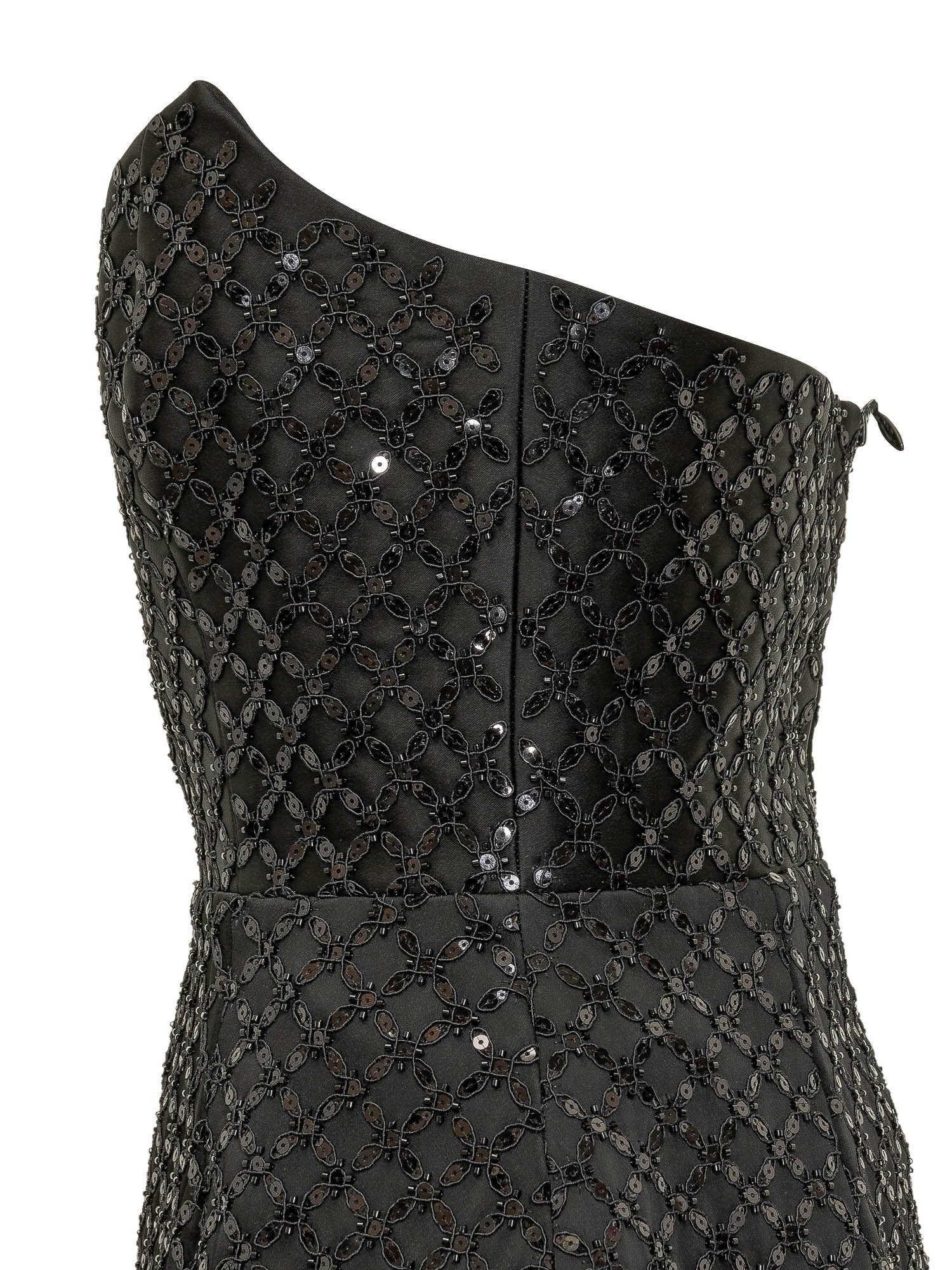 Mini abito senza spalline con silhouette svasata e superficie ricamata a motivi geometrici.