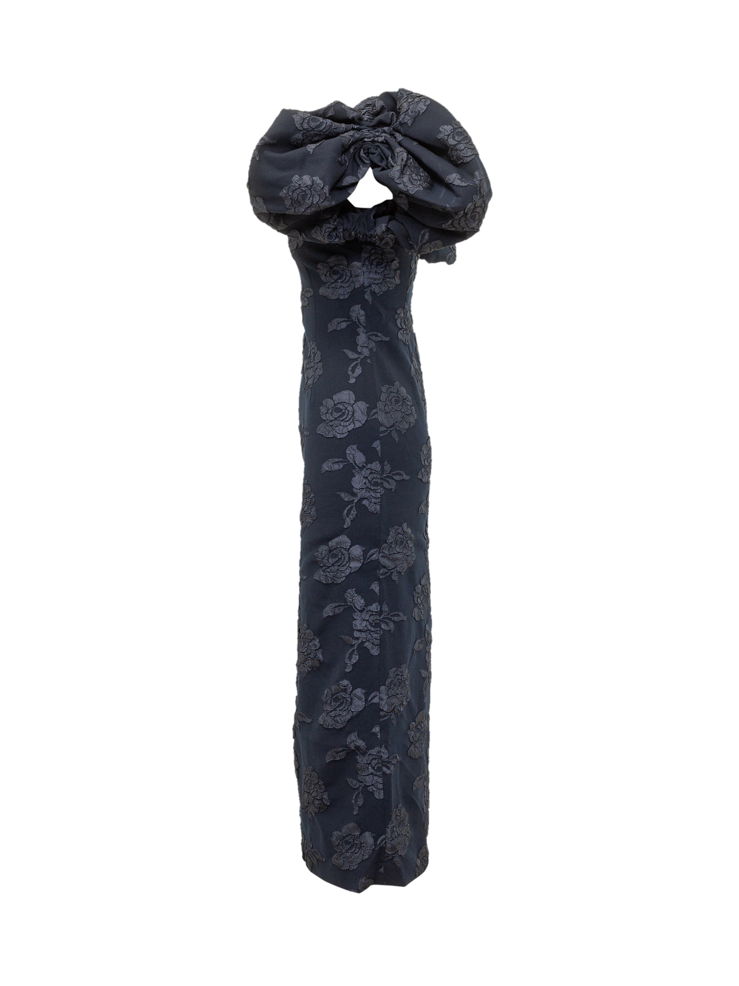 Abito midi con maniche a sbuffo e lavorazione jacquard floreale che aggiunge profondità e raffinatezza. La silhouette aderente valorizza la figura.