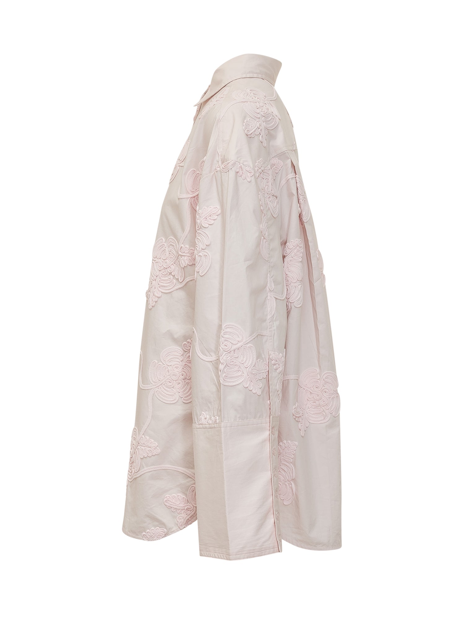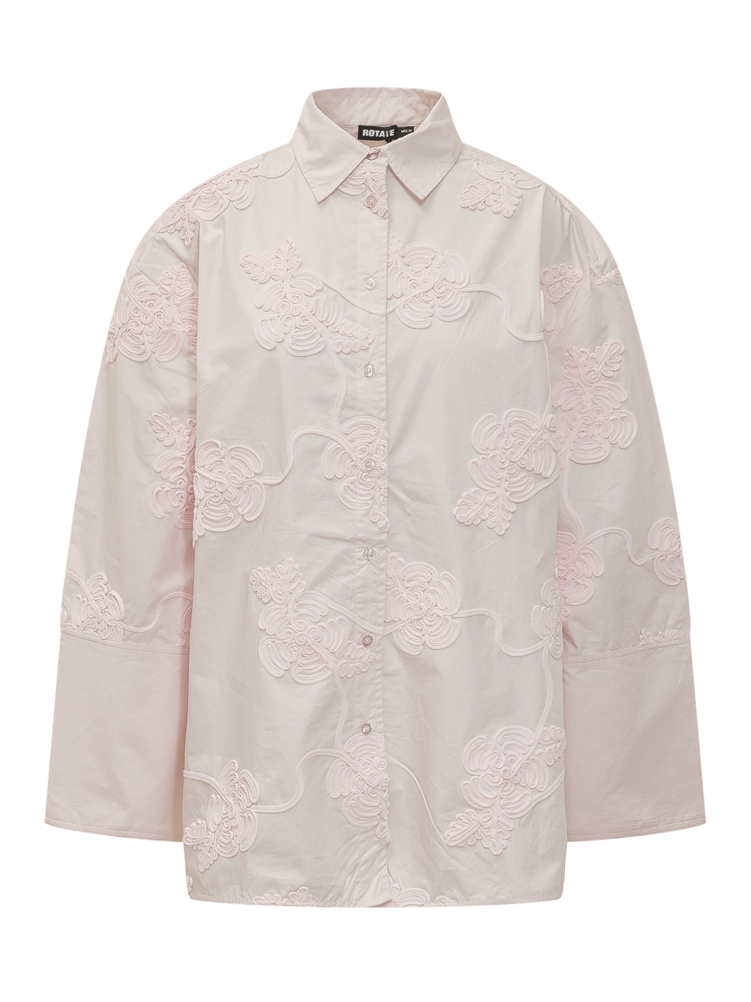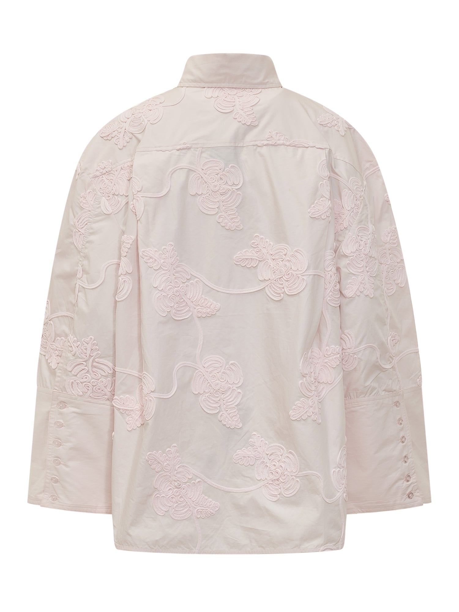 Shirt oversize con ricami floreali in rilievo. Linea ampia con colletto classico, chiusura frontale con bottoni e maniche lunghe. Un capo raffinato che unisce femminilità e stile contemporaneo.
