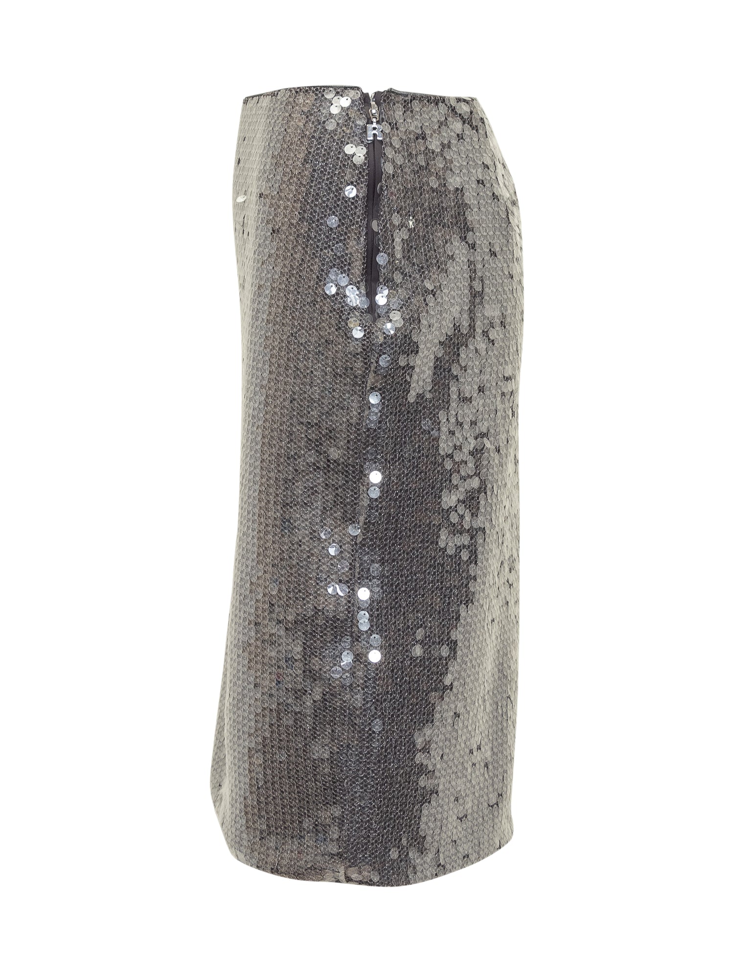 Gonna midi Rotate in paillettes argento, dal taglio aderente e chiusura posteriore.