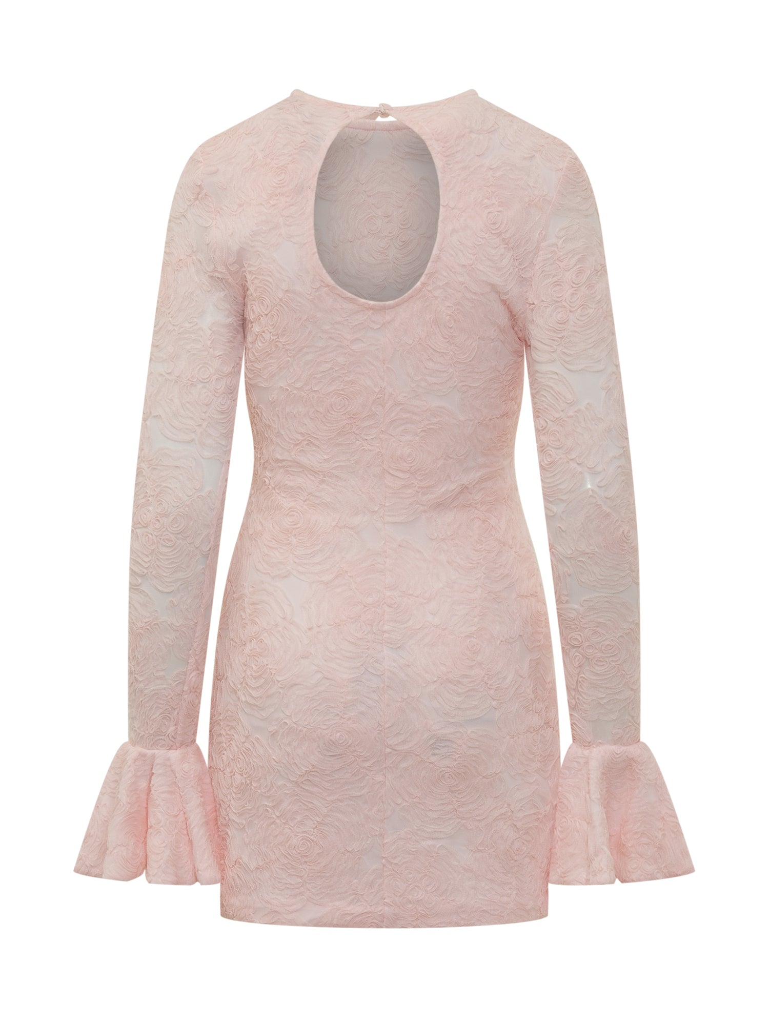 Mini abito in tulle ricamato con motivo floreale e maniche svasate che aggiungono eleganza. La silhouette aderente valorizza le forme.