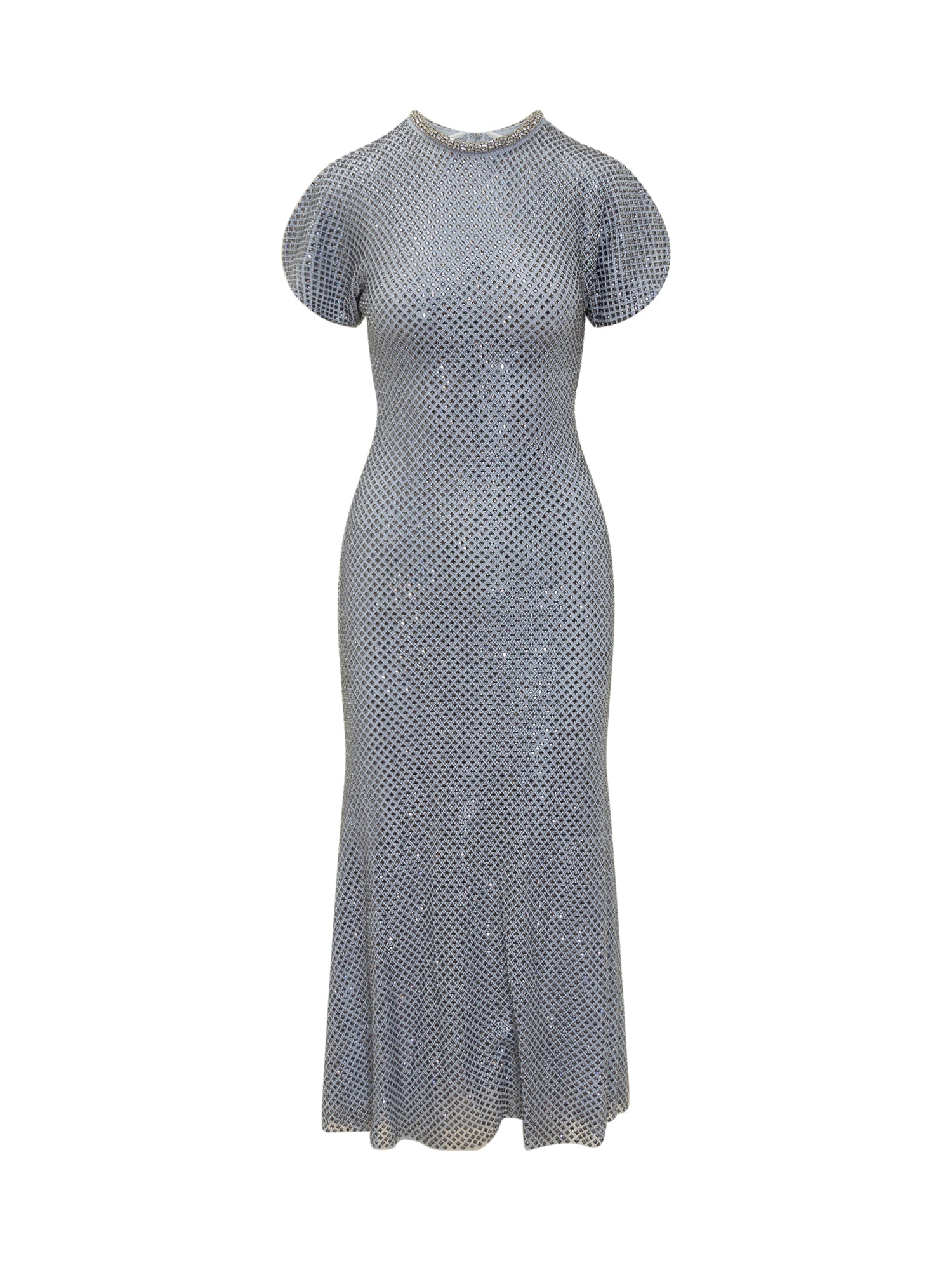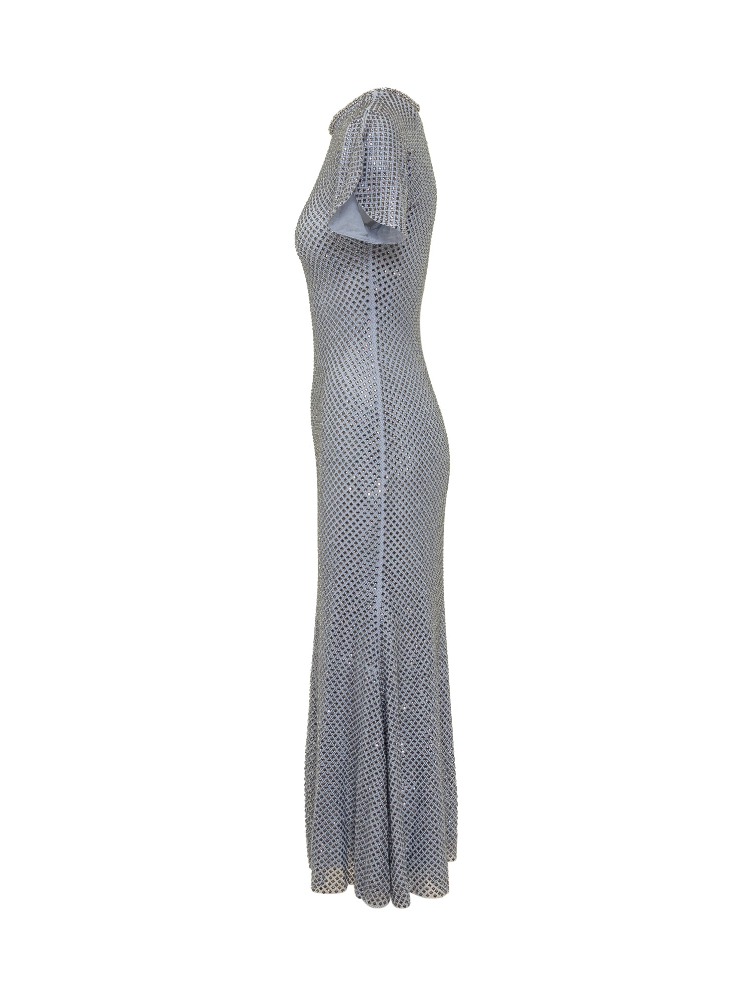 Abito lungo ricoperto di strass con silhouette aderente e maniche corte morbide. Il collo decorato aggiunge luminosità al design elegante.
