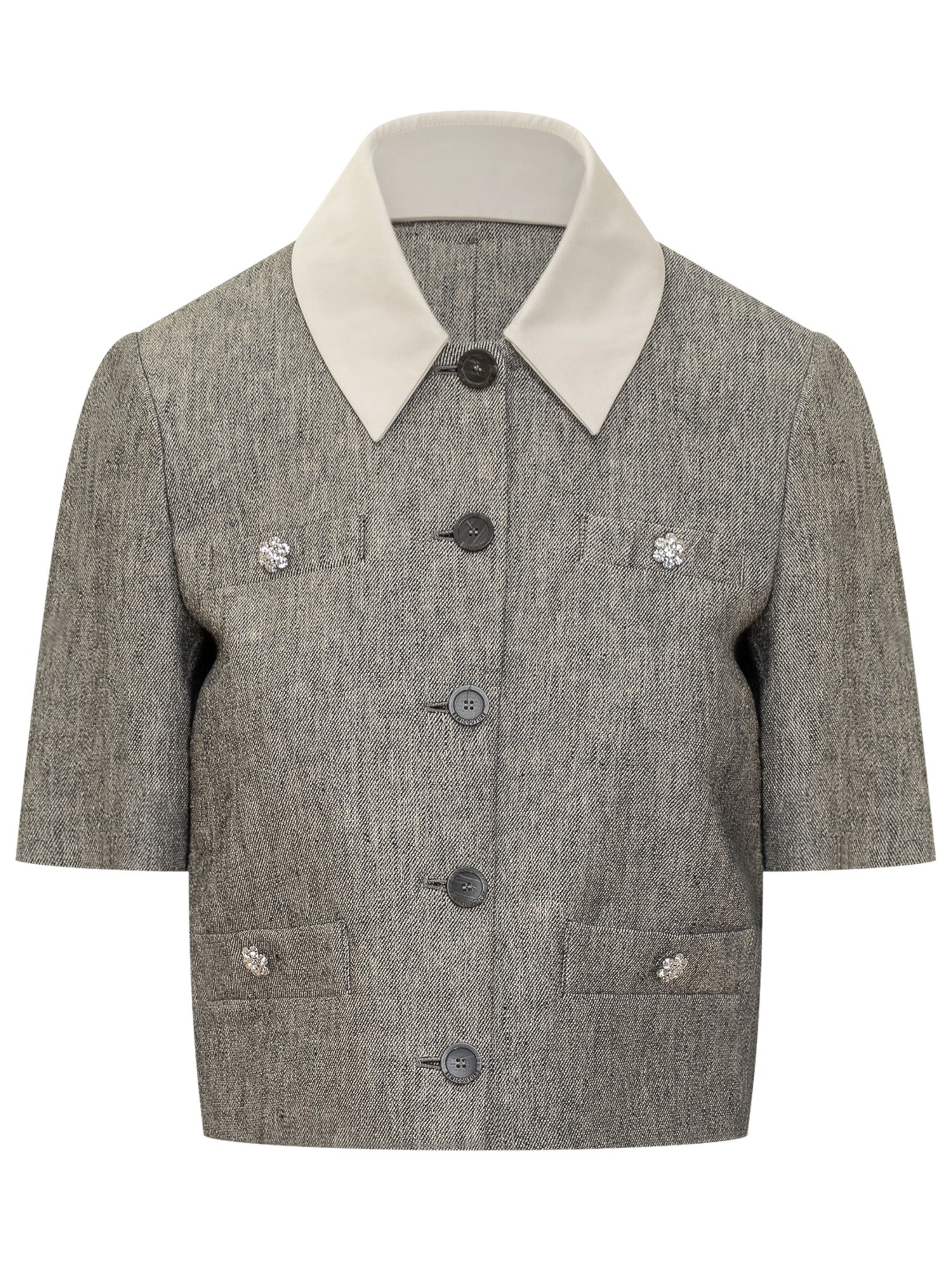 Maniche corte. Colleto a punta. Chiusura con bottoni. Tasche con bottoni gioiello.