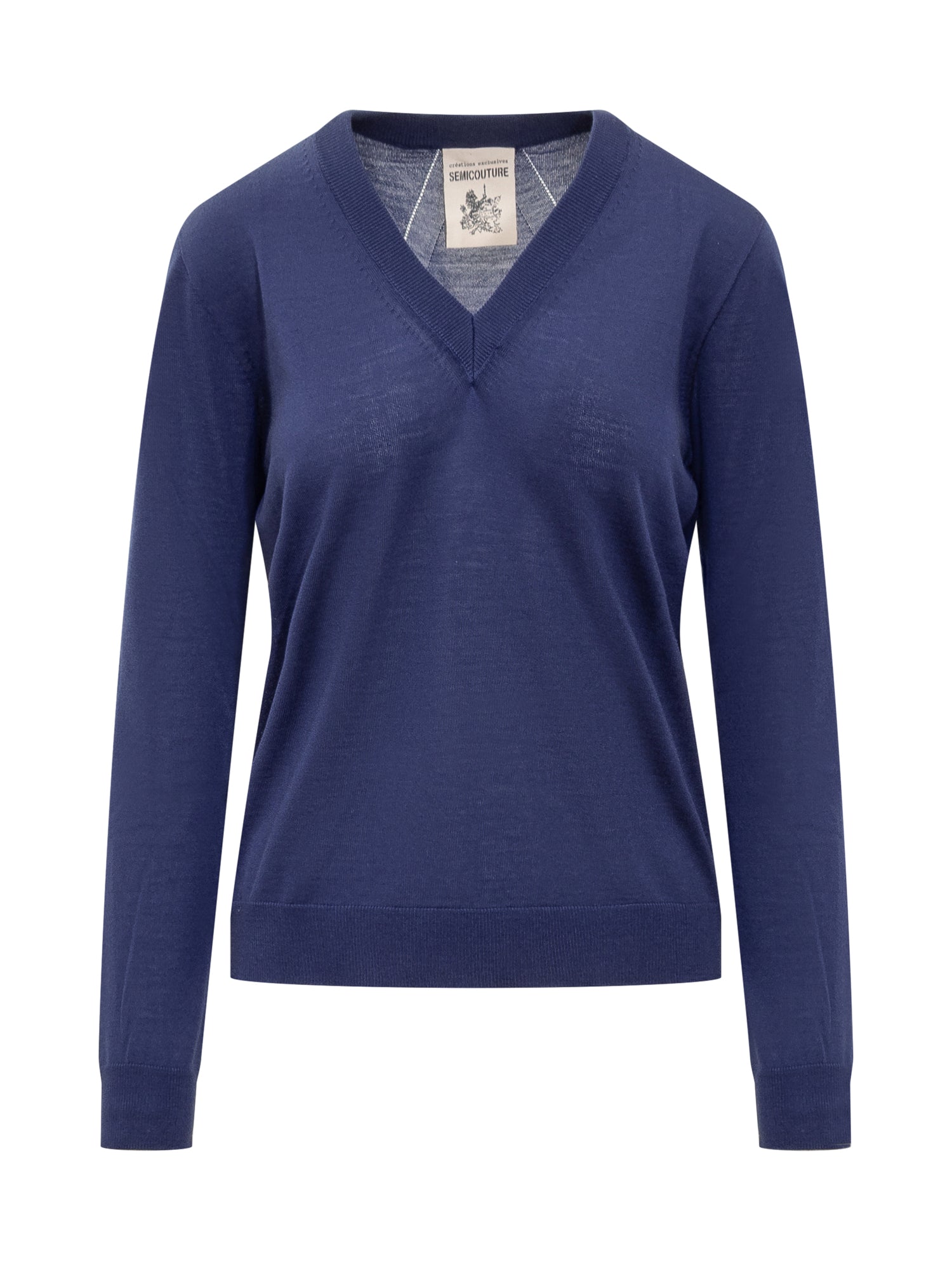 Maglia a maniche lunghe in lana vergine. Scollo a V. Orli a coste.