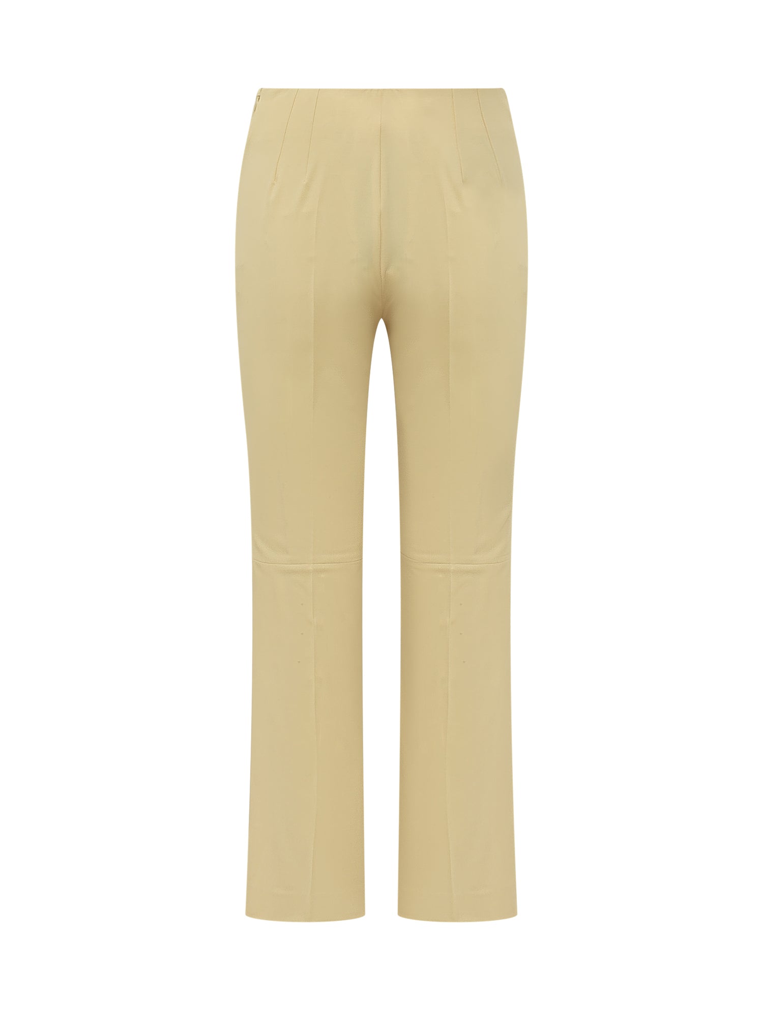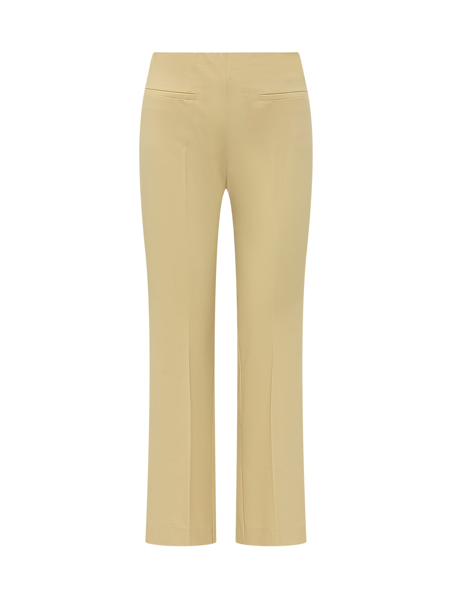 Pantalone sartoriale a vita alta con gamba leggermente svasata e piega centrale. Tasche posteriori a filetto e finiture pulite per una linea slanciata.