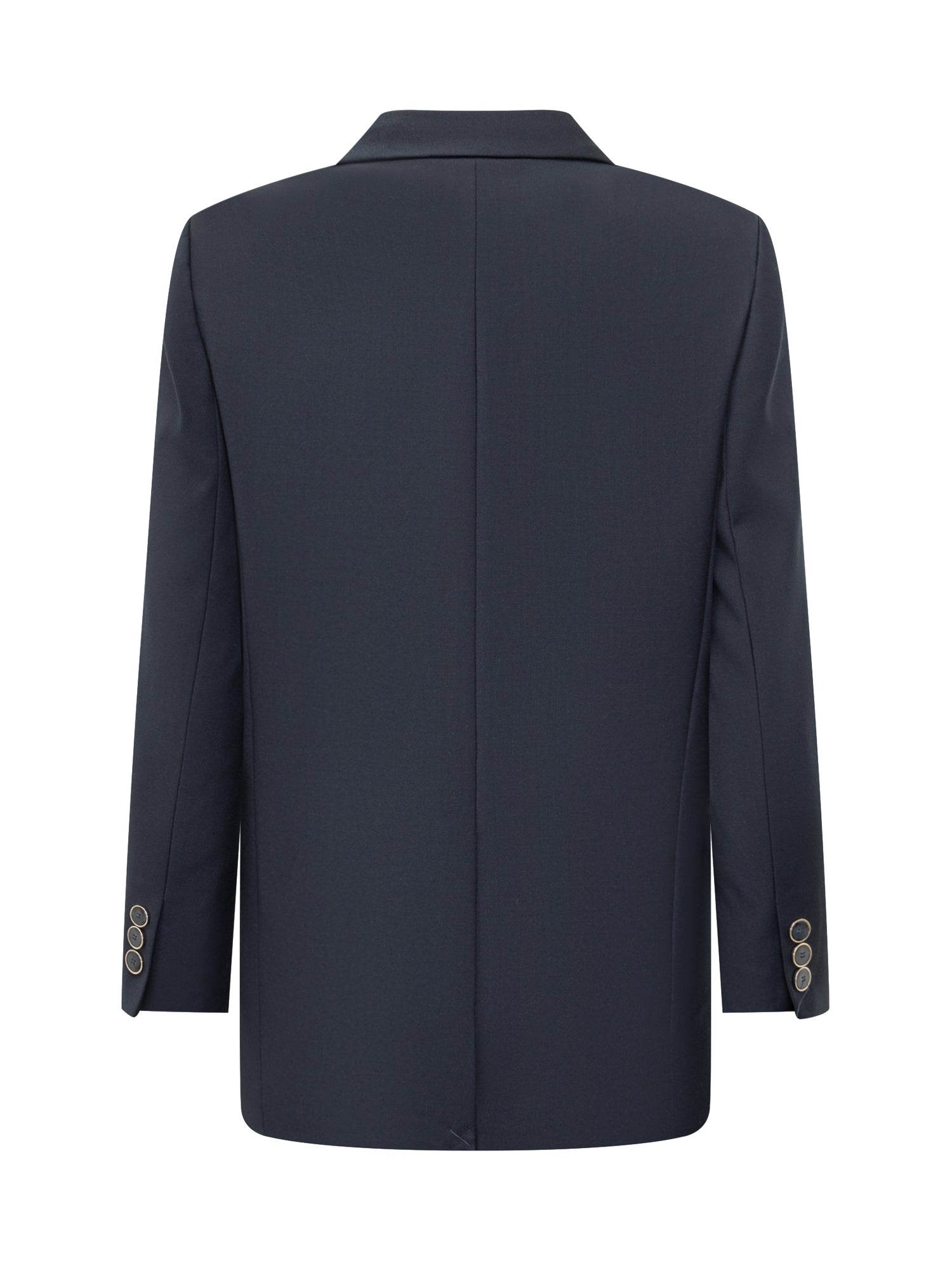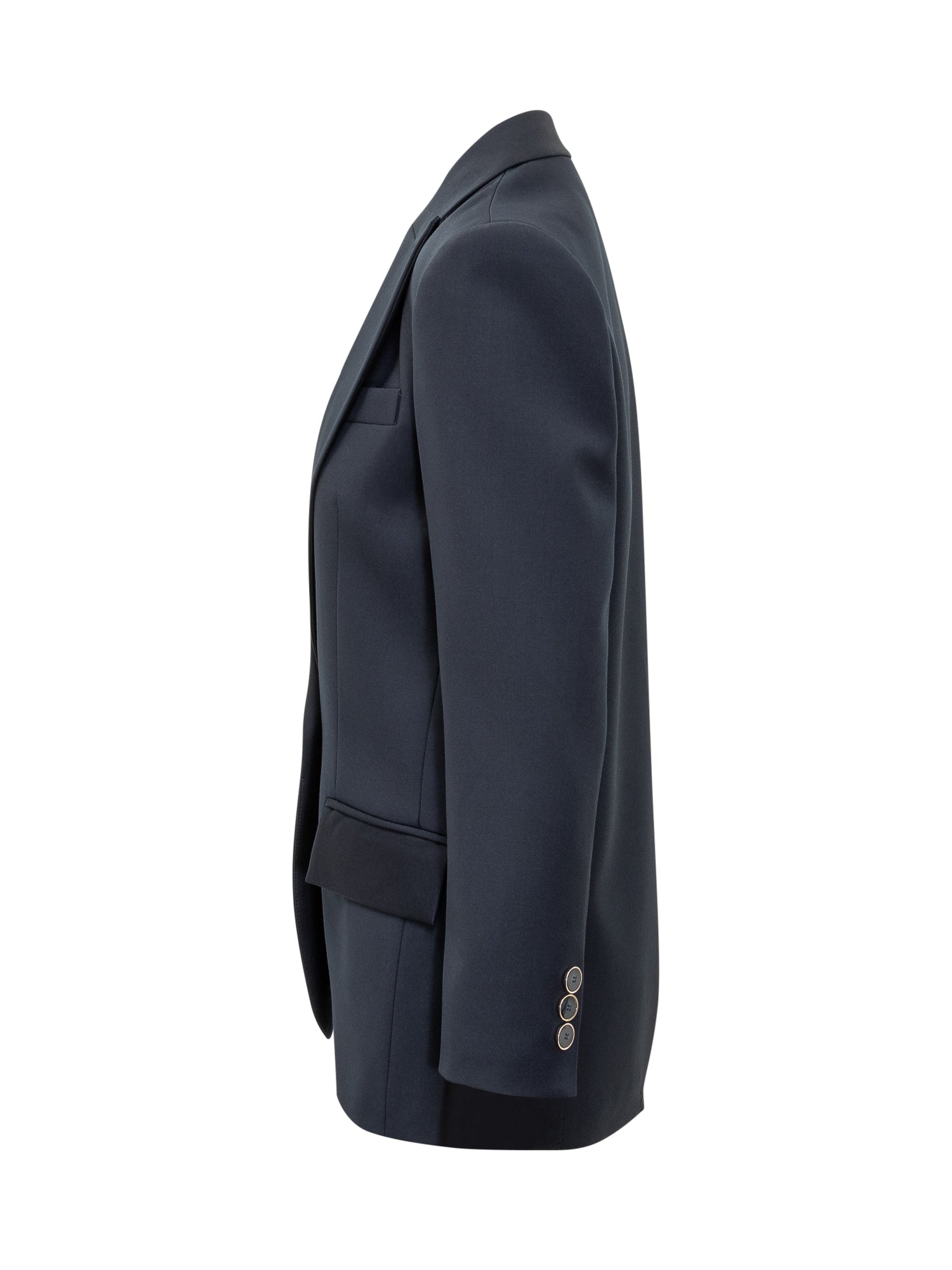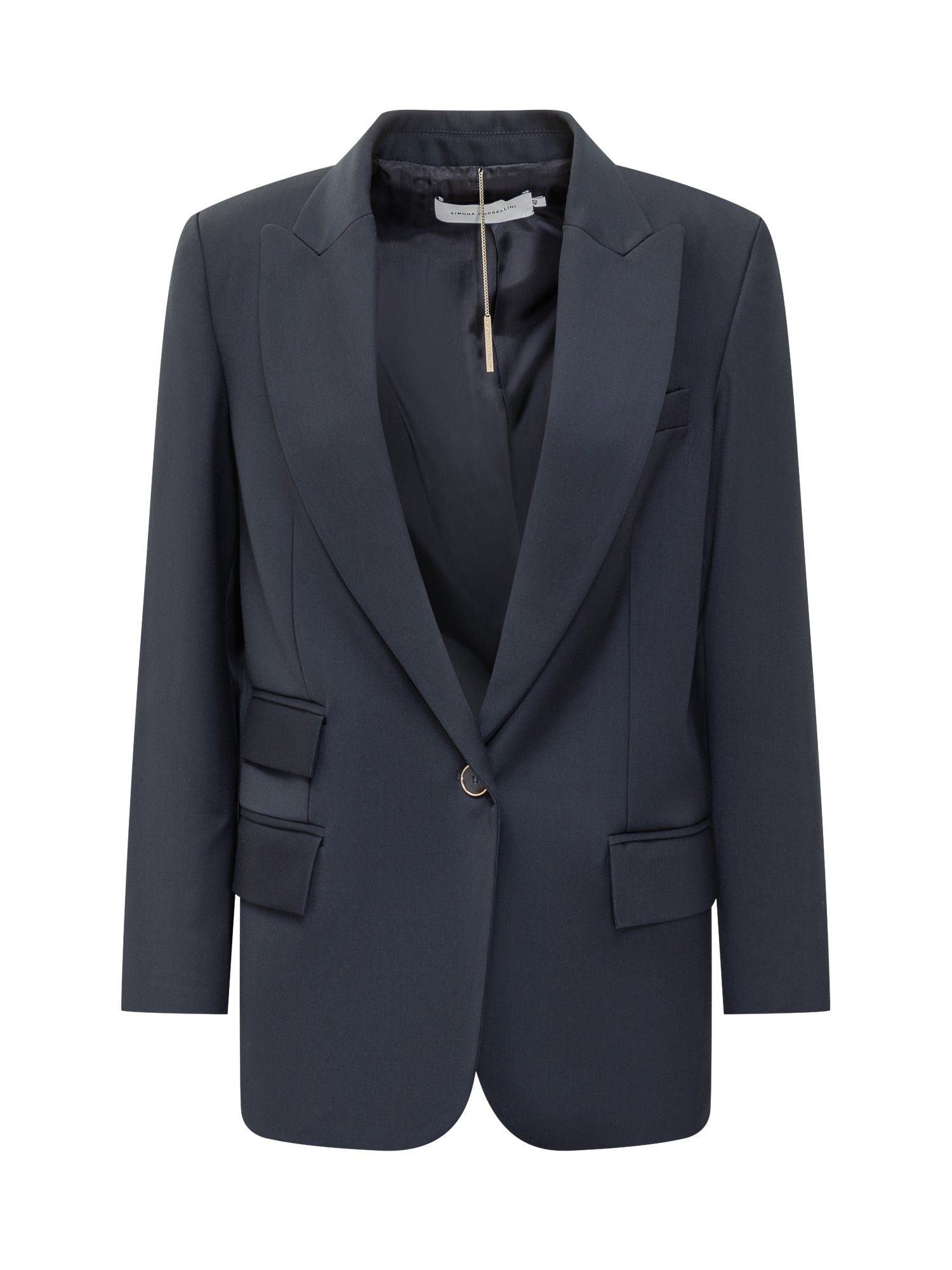 Blazer Simona Corsellini in blu scuro con revers a lancia e dettagli a tasche multiple.