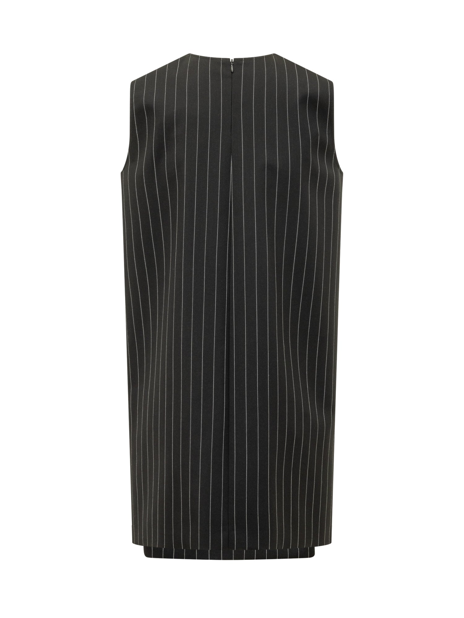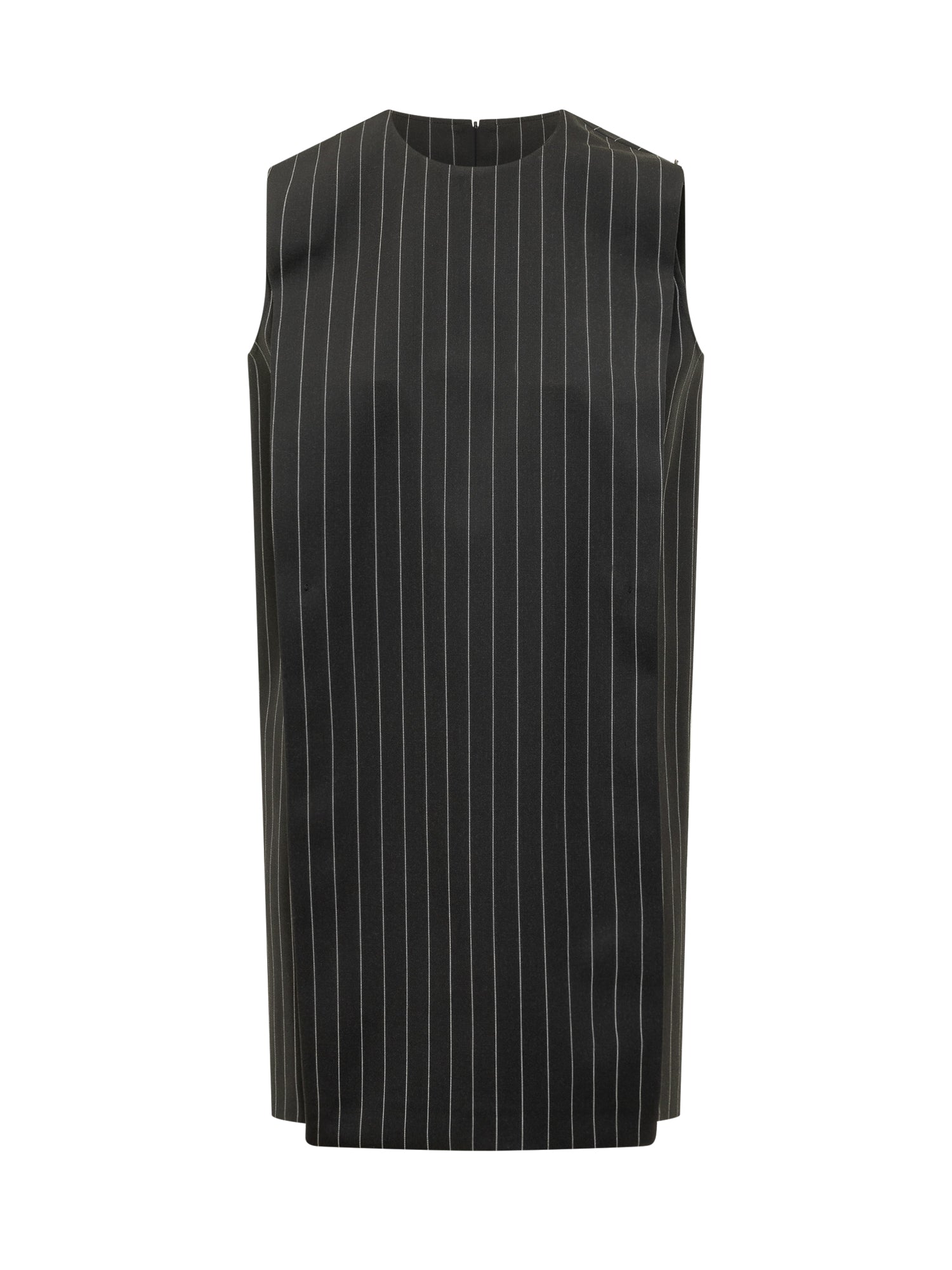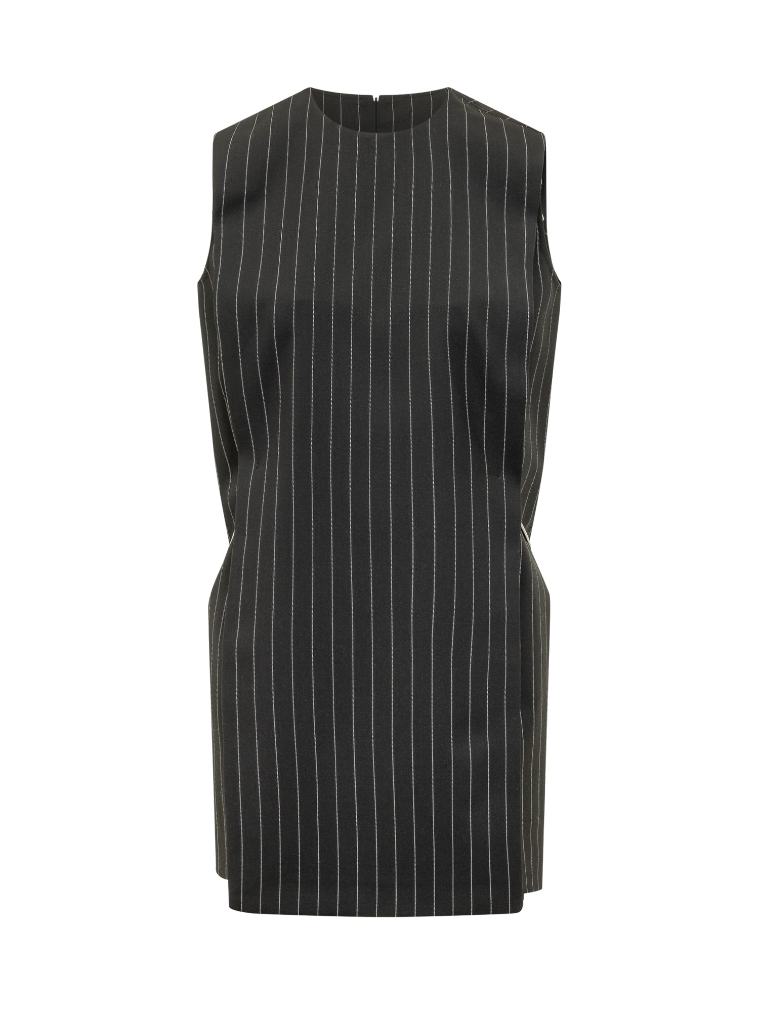 Abito corto senza maniche con scollo tondo, motivo a righe sottili, cintura sottile in vita, chiusura con zip sul retro.