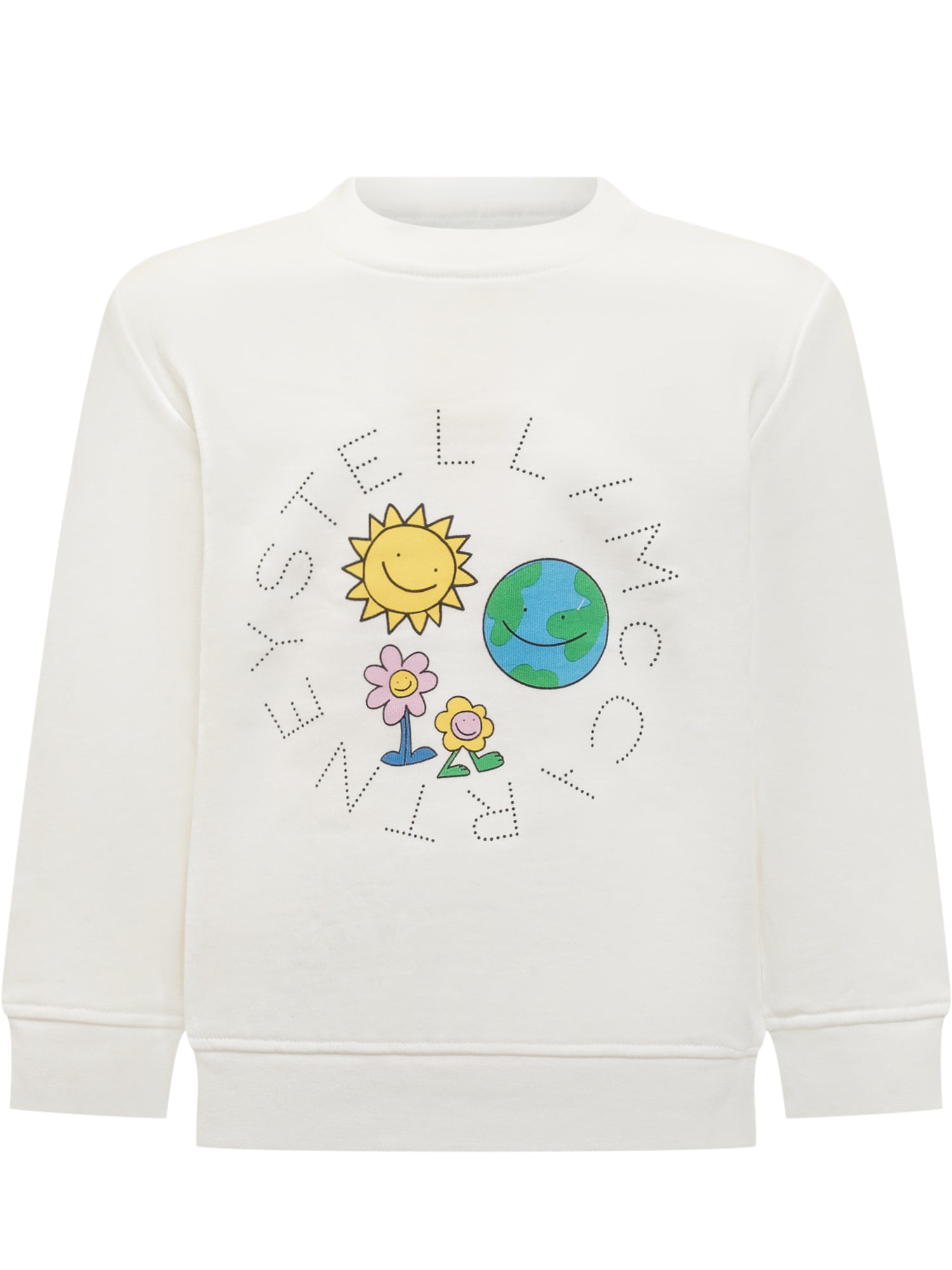 Felpa bianca da bambina firmata Stella McCartney Kids, decorata con una simpatica stampa di sole, pianeta Terra e fiori, circondati dal nome del brand.