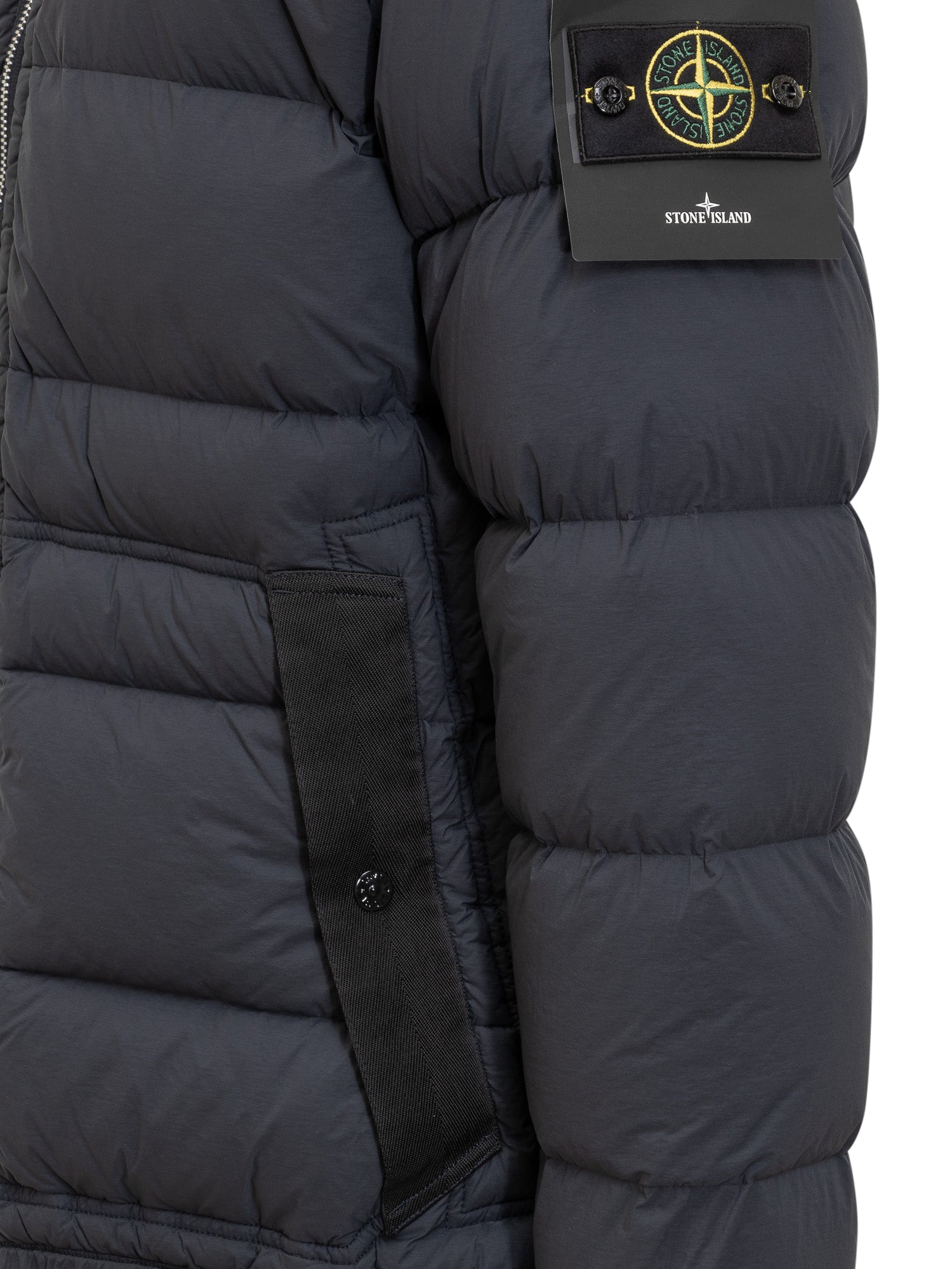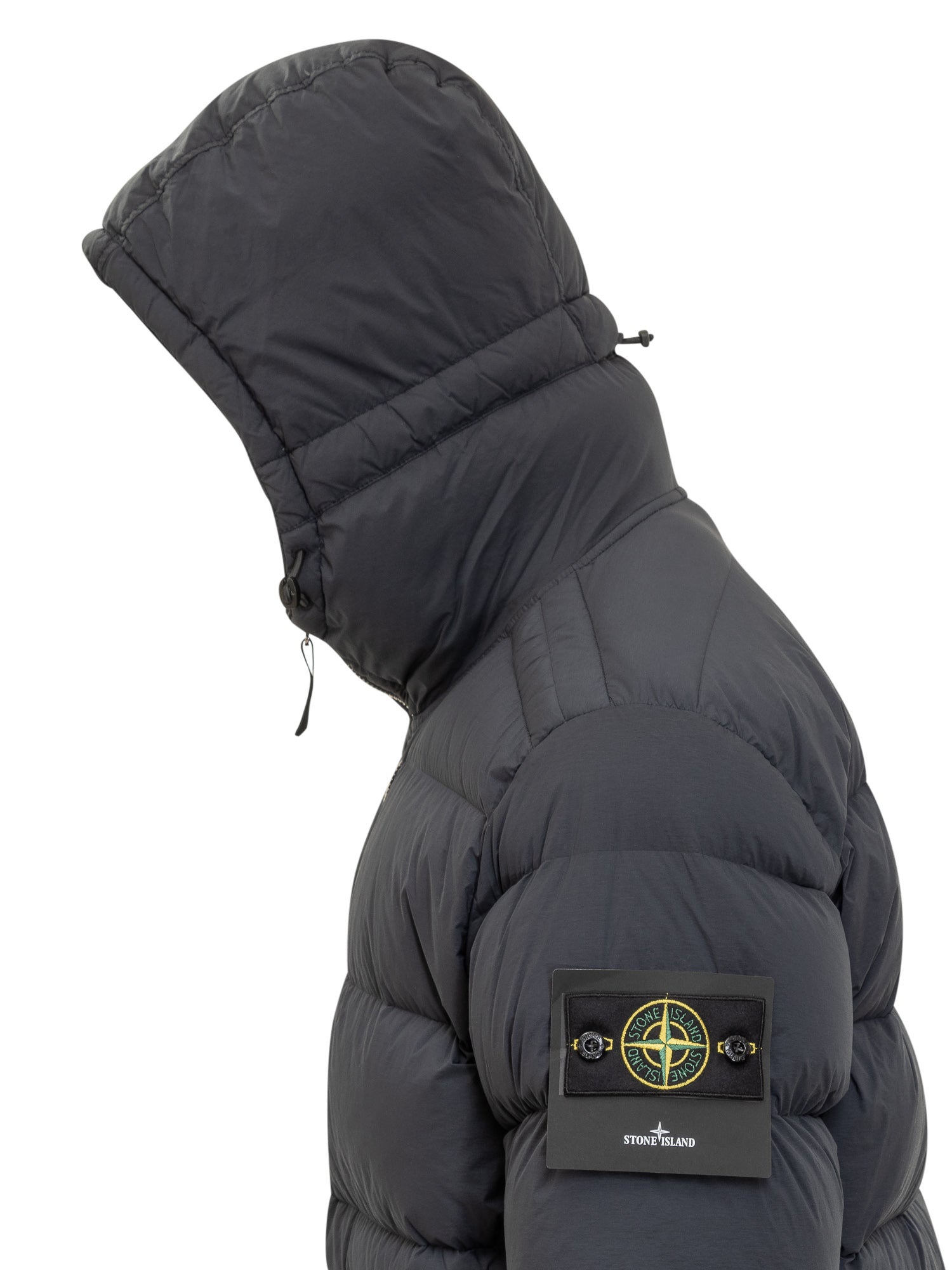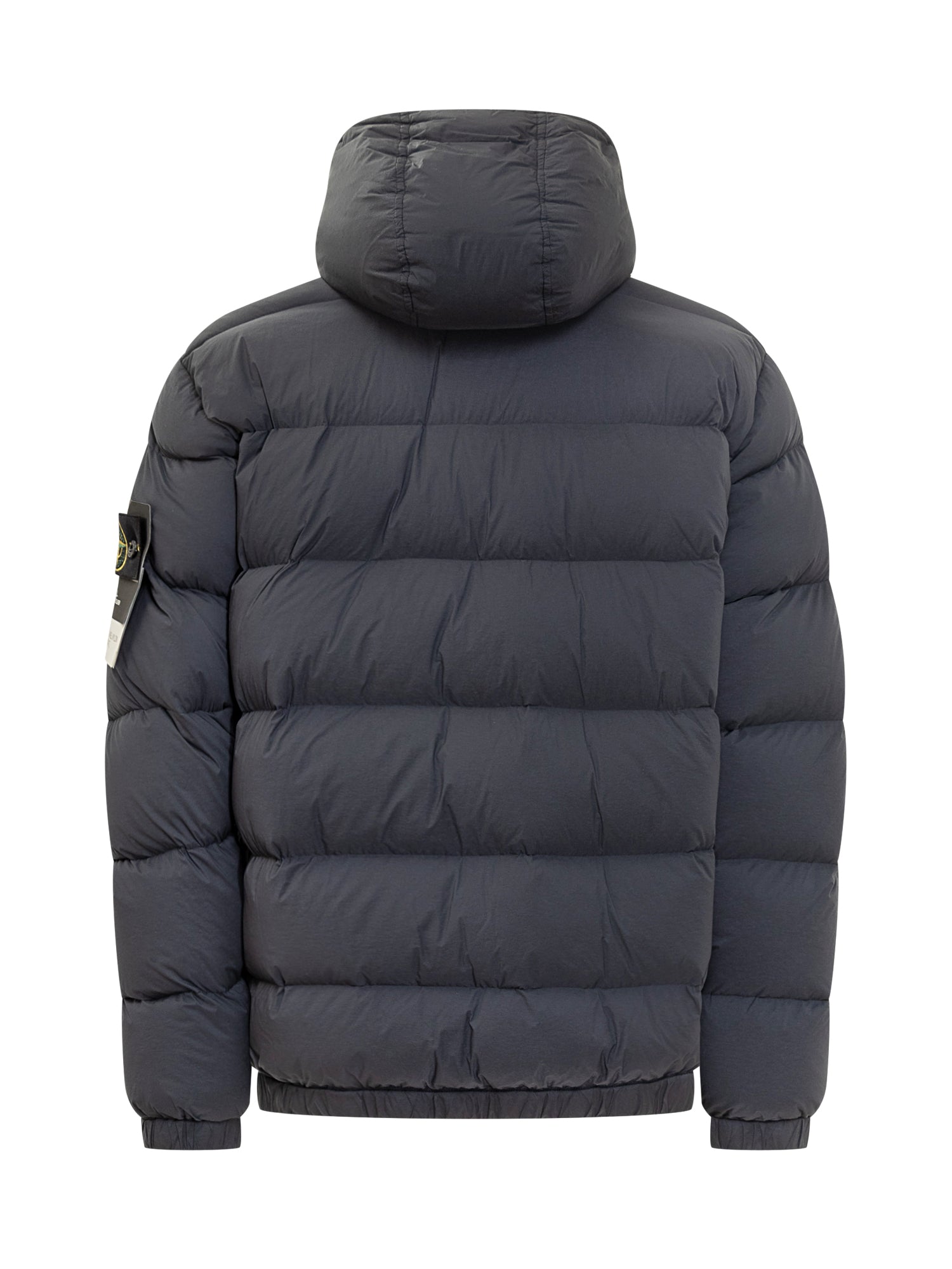 Giacca imbottita Stone Island in tessuto tecnico opaco. Modello con cappuccio regolabile, chiusura zip a doppio cursore e tasche laterali. Logo removibile sulla manica.