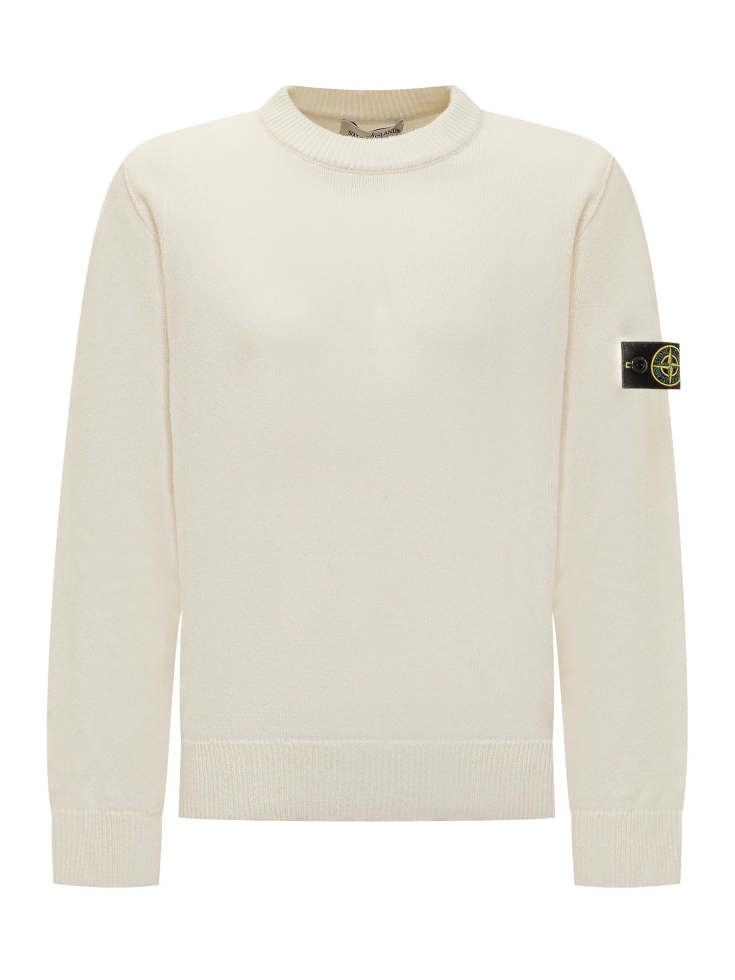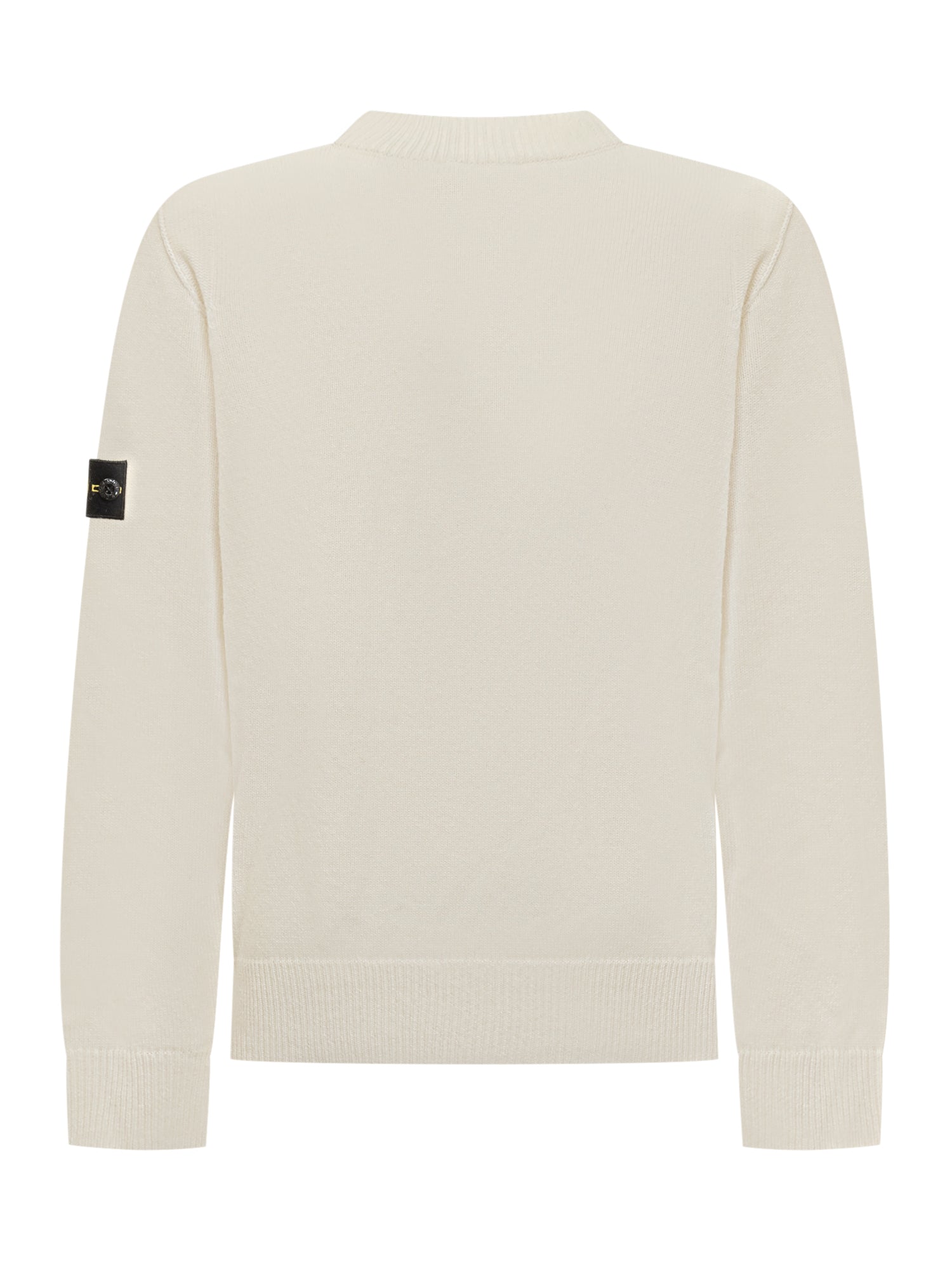 Maglia girocollo Stone Island da bambino in lana color panna, caratterizzata dall'iconico badge rimovibile sulla manica sinistra.