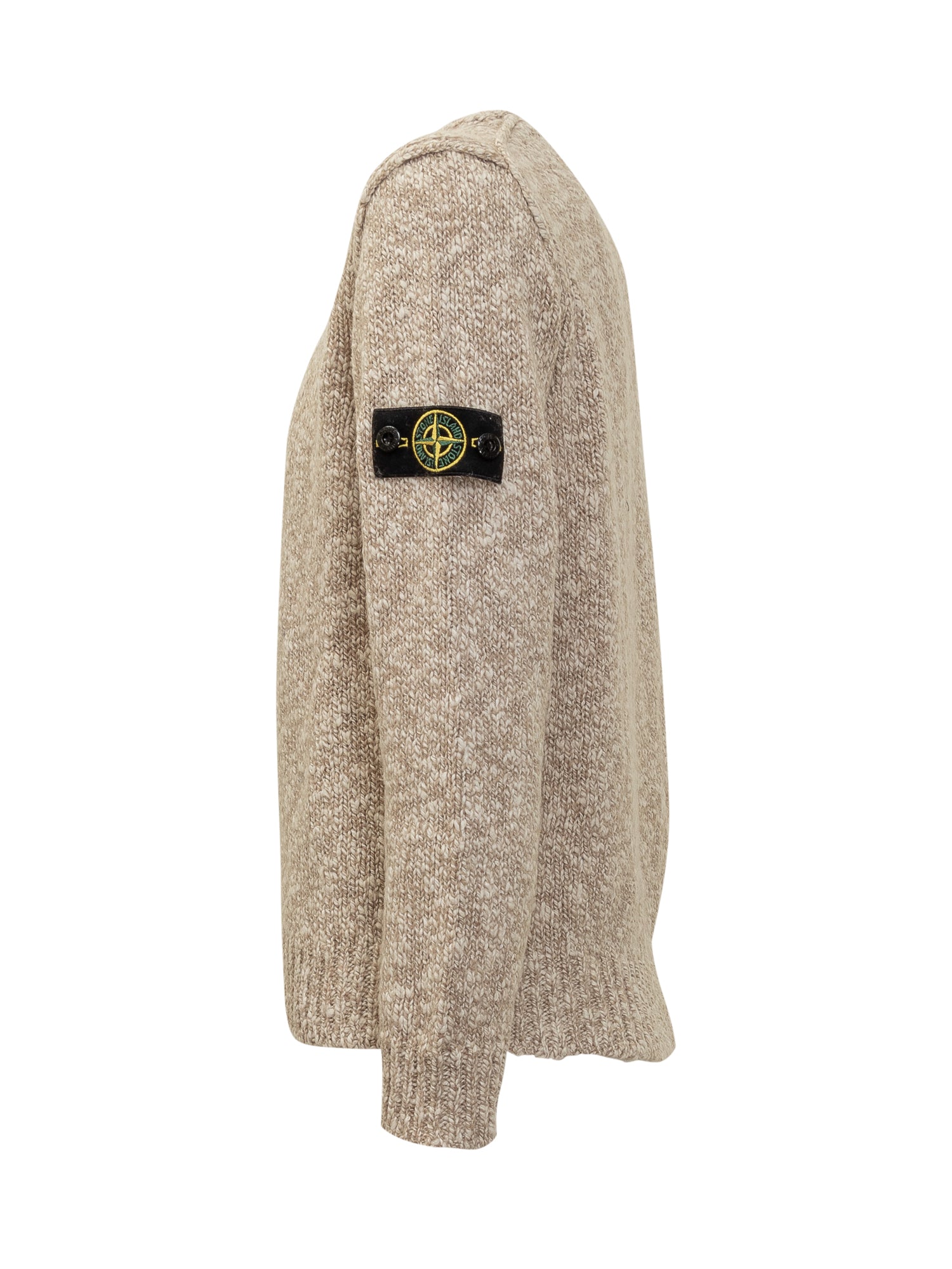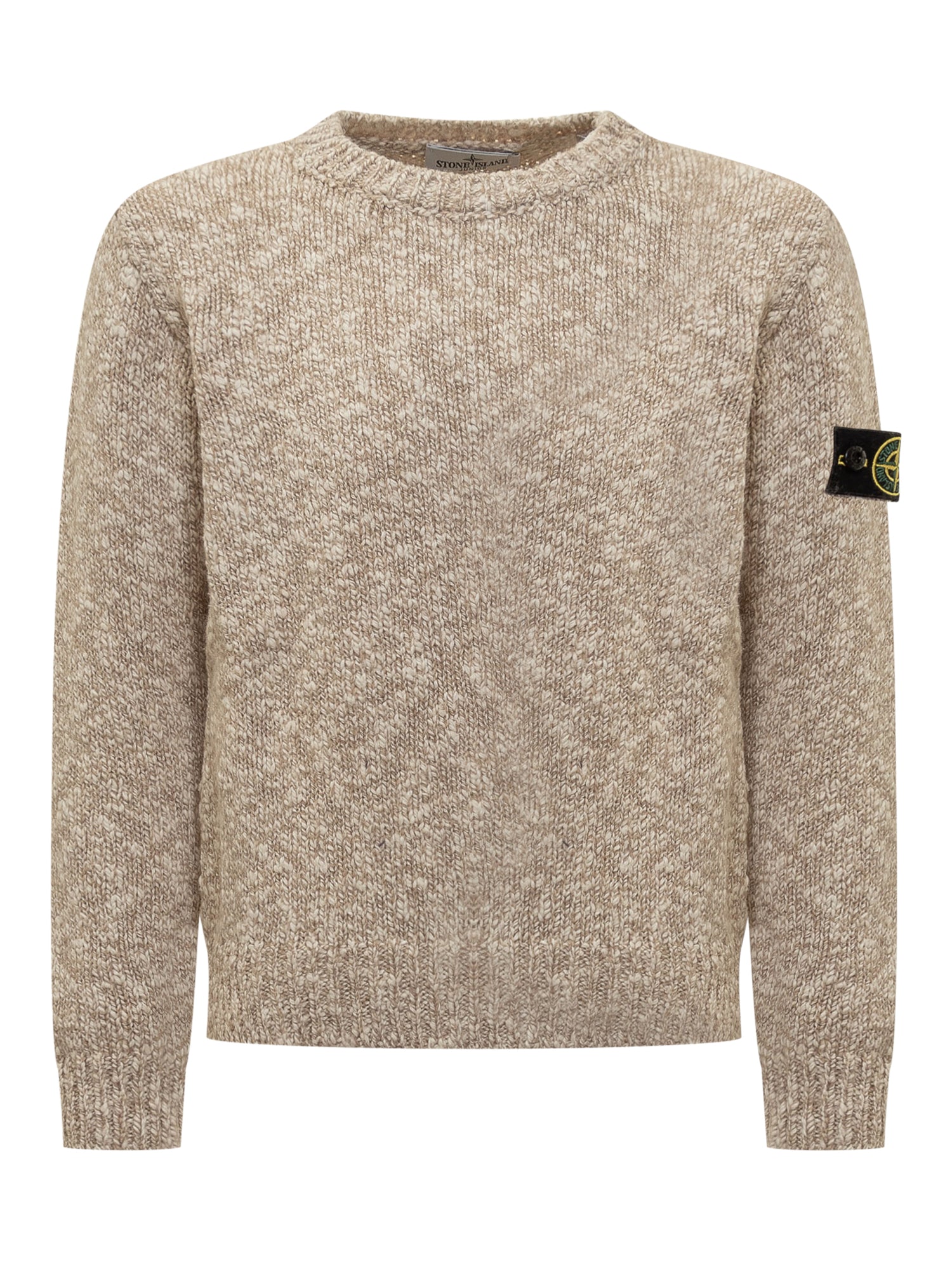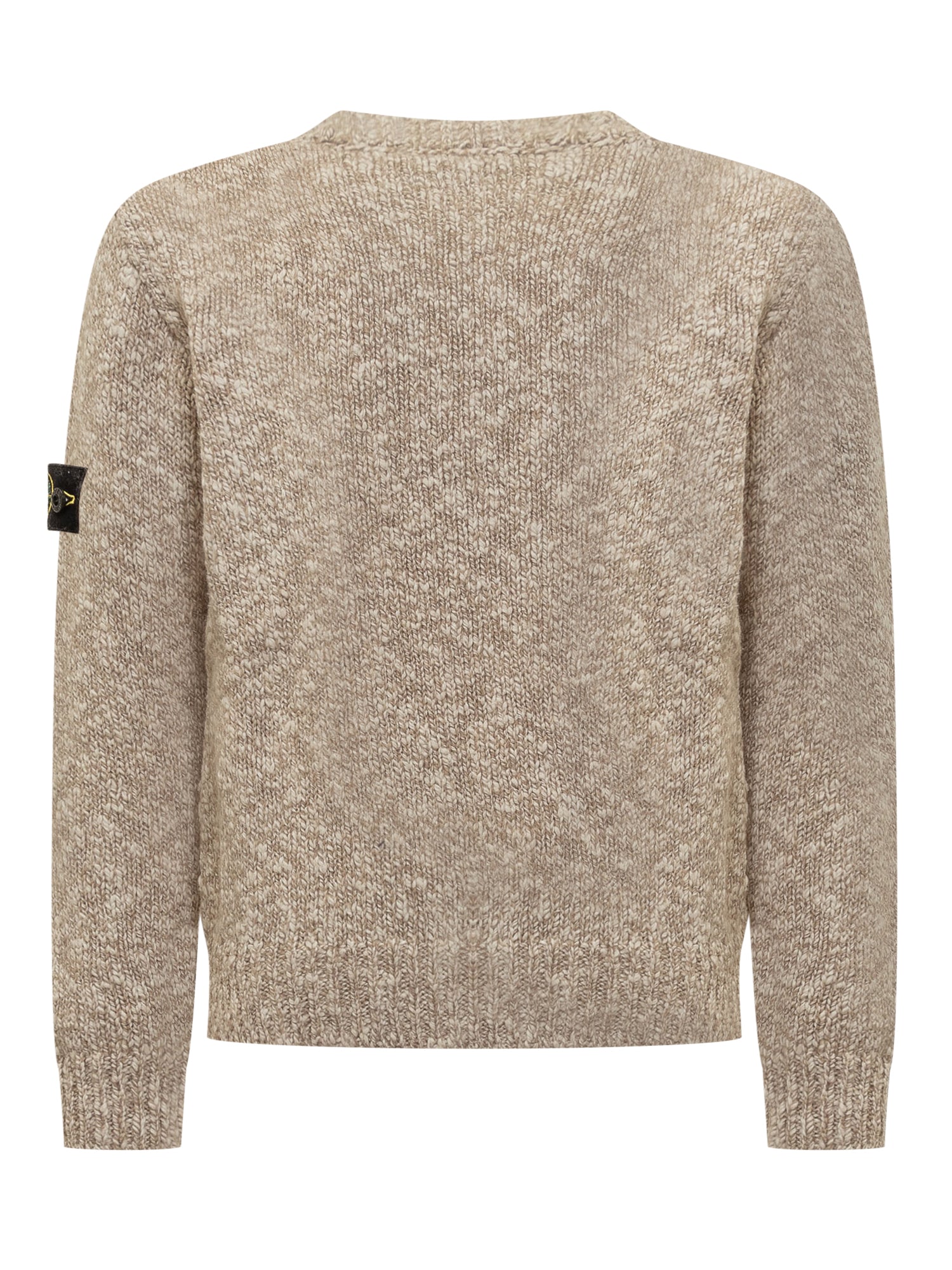 Maglia girocollo Stone Island da bambino in lana mélange beige, con iconico badge rimovibile sulla manica sinistra.