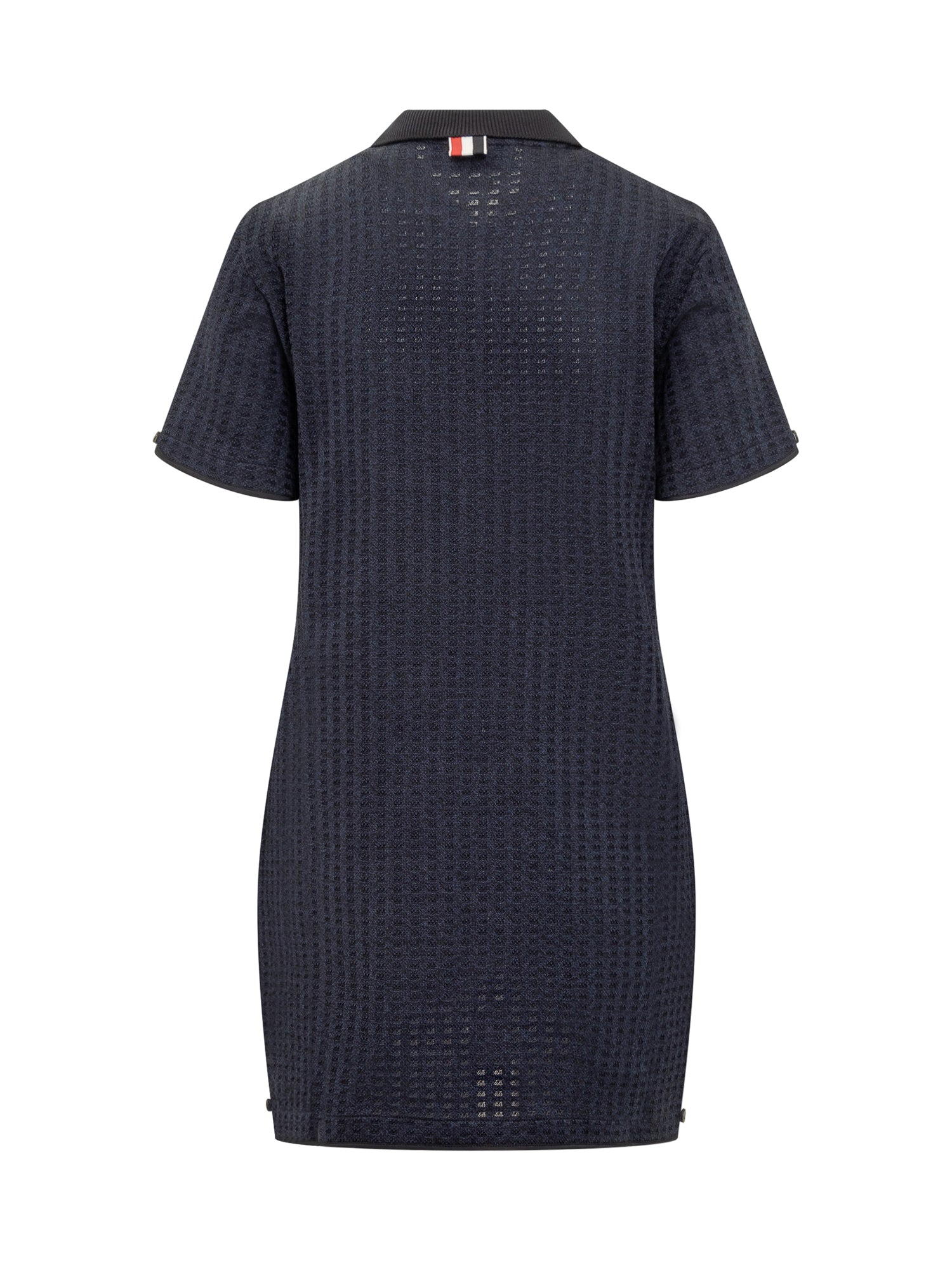 Abito midi in stile polo in maglia di cotone con lavorazione jacquard ad effetto vichy. Colletto classico a coste. Chiusura con bottoni. Bottoni decorativi sulle maniche e sul fondo. Linguetta tricolore in gros grain sul retro. Logo patch sul davanti.