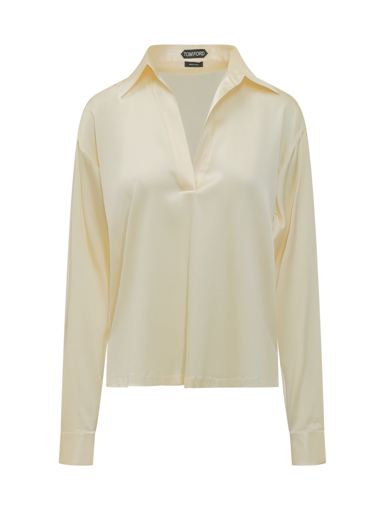 Blusa dalla linea fluida con vestibilità morbida e scollo a V profondo rifinito da colletto classico. Maniche lunghe con polsini semplici e fondo dritto. Tessuto liscio e leggero dall aspetto elegante.