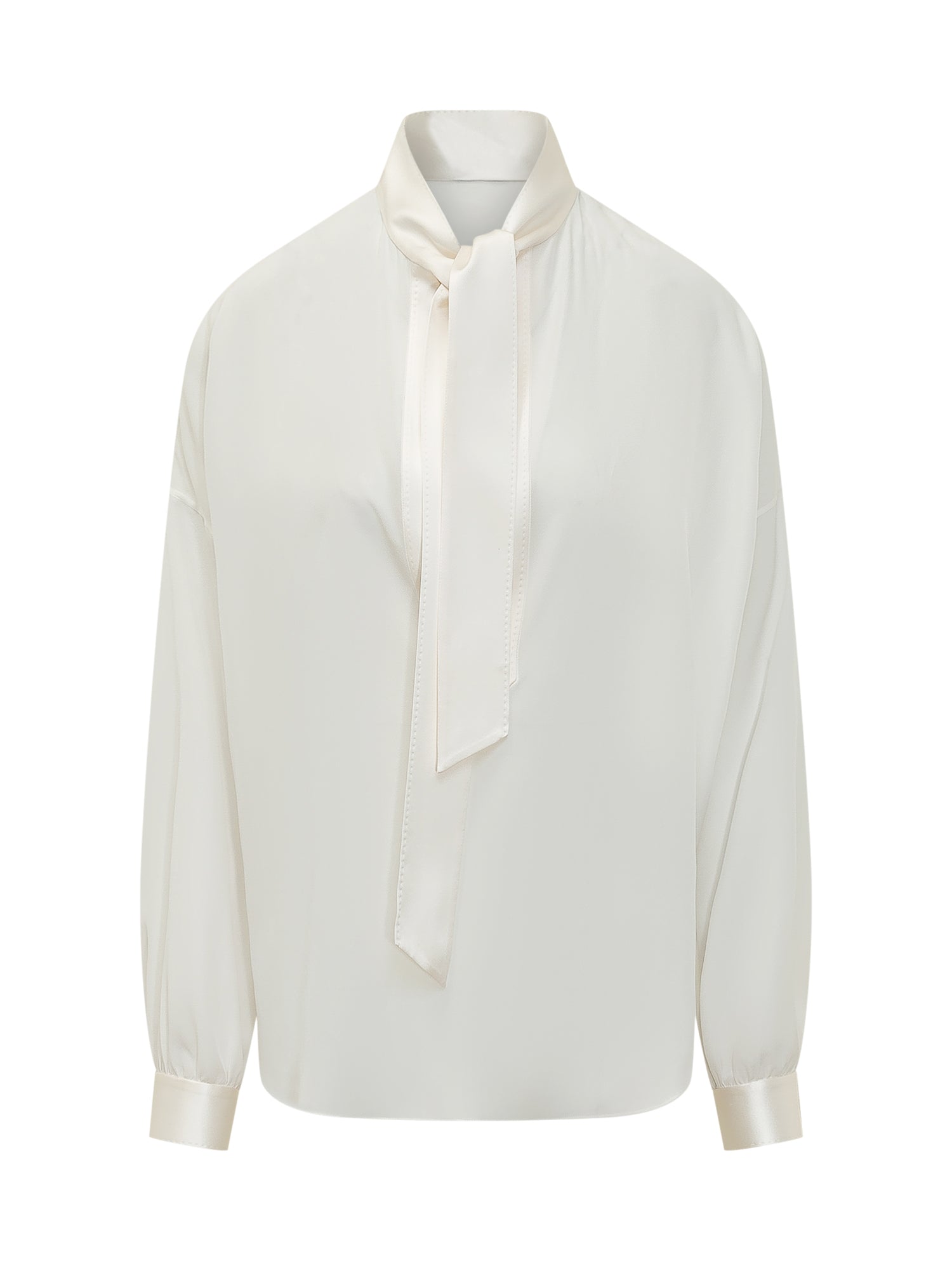 Blusa in crêpe di seta dal taglio morbido con dettaglio di fiocco al collo. Maniche lunghe con polsini rifiniti e silhouette elegante.
