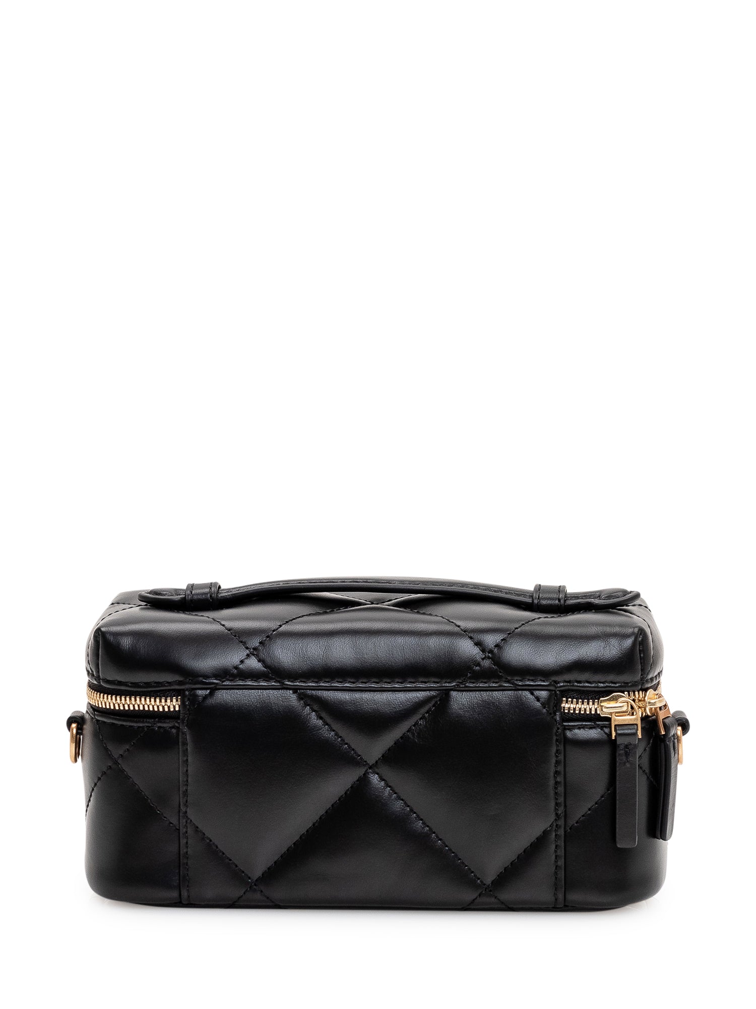 Vanity case compatto con design trapuntato a rombi, struttura rigida e chiusura con zip superiore.Dimensioni: 19x9x7