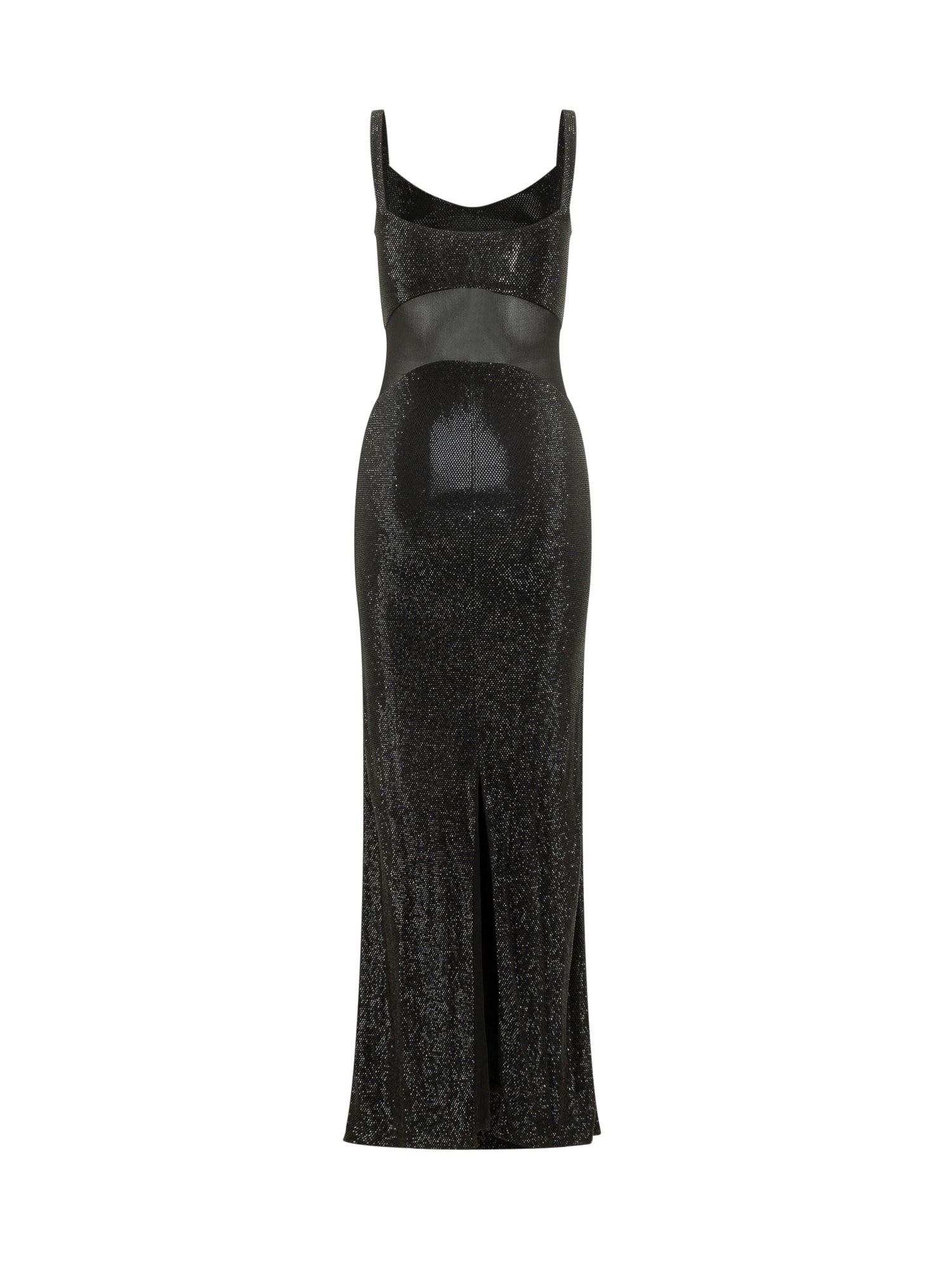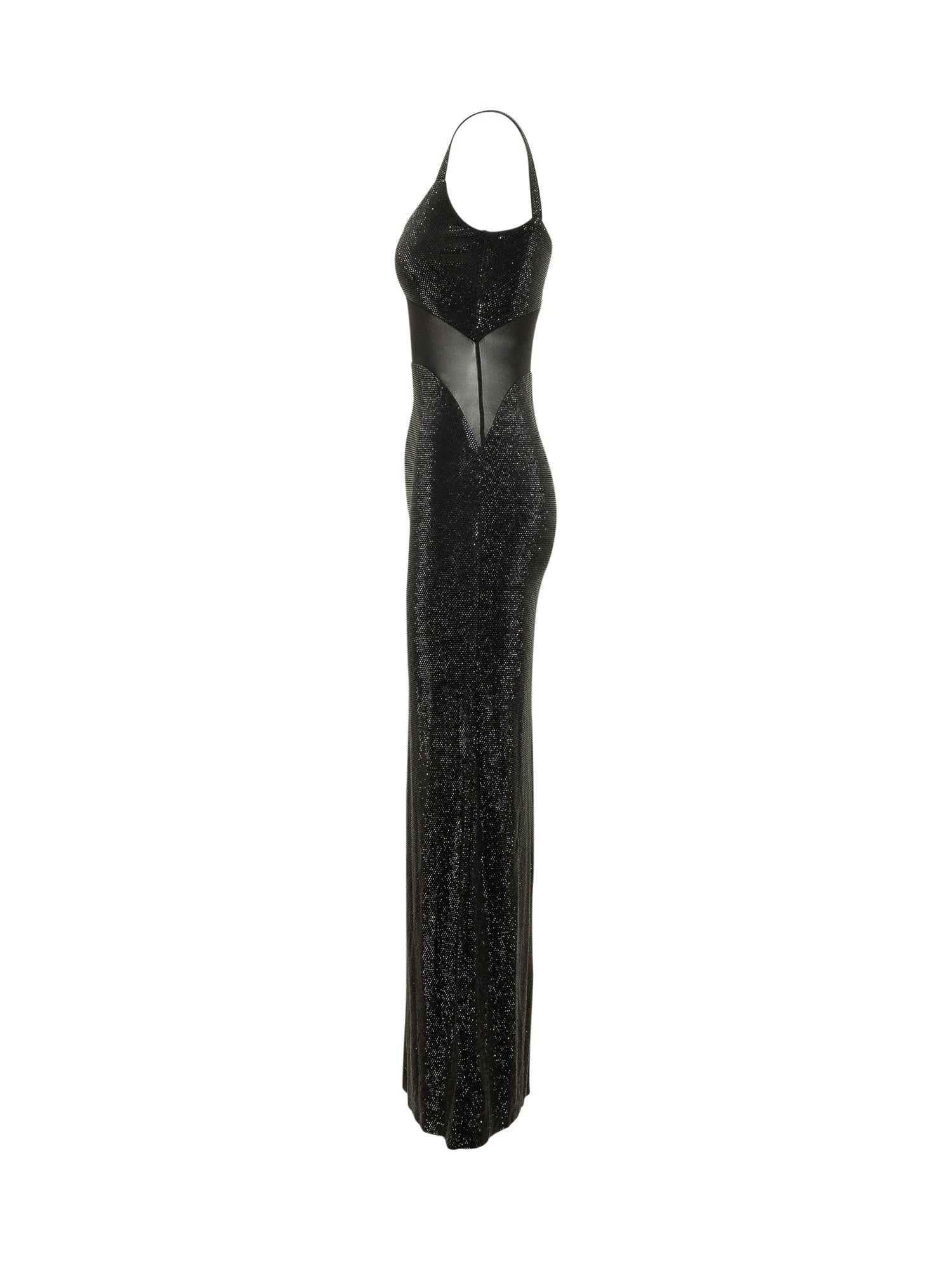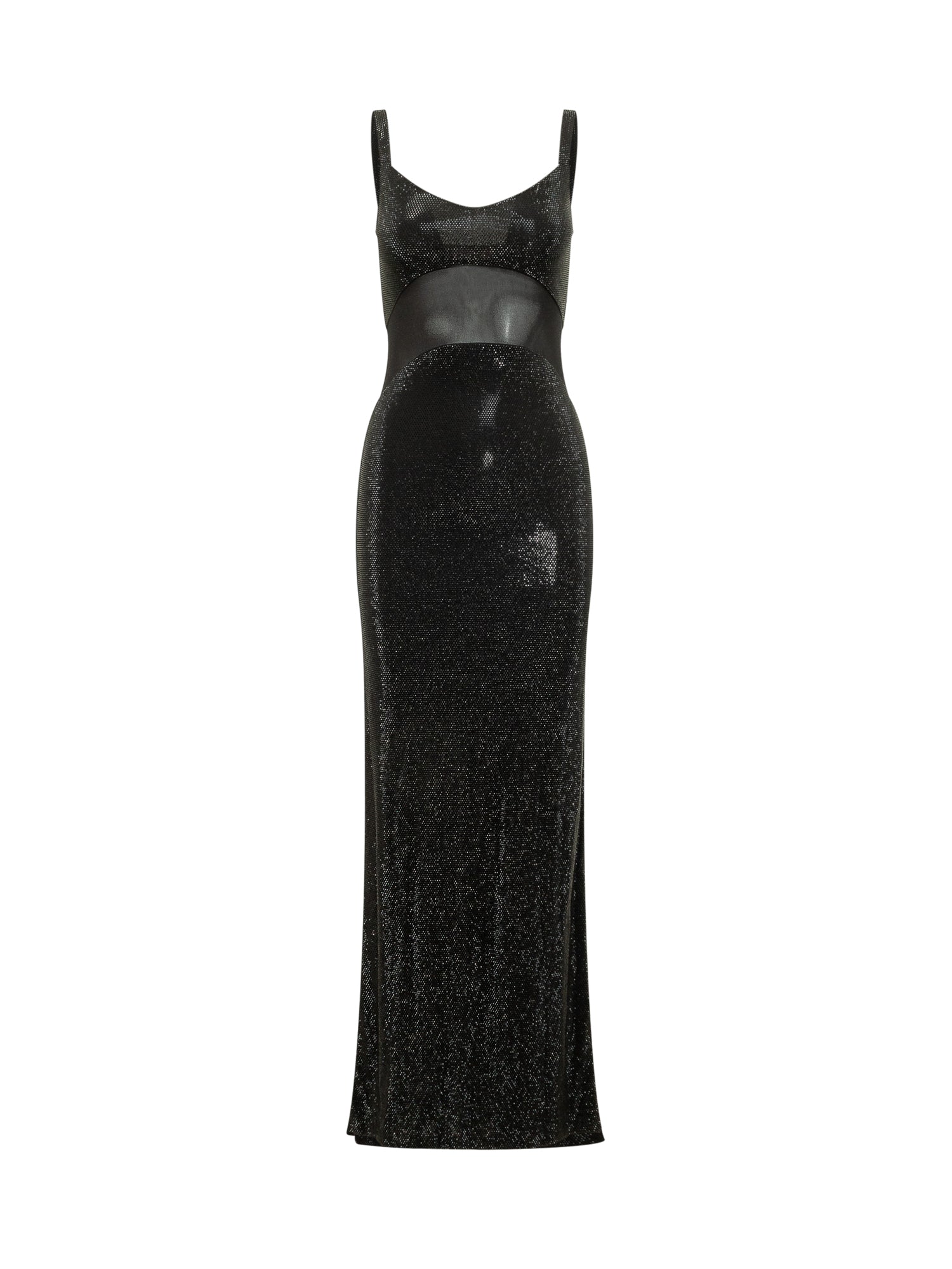 Abito lungo con spalline sottili e scollo dritto. Linea aderente con pannello centrale a contrasto e fondo dritto.