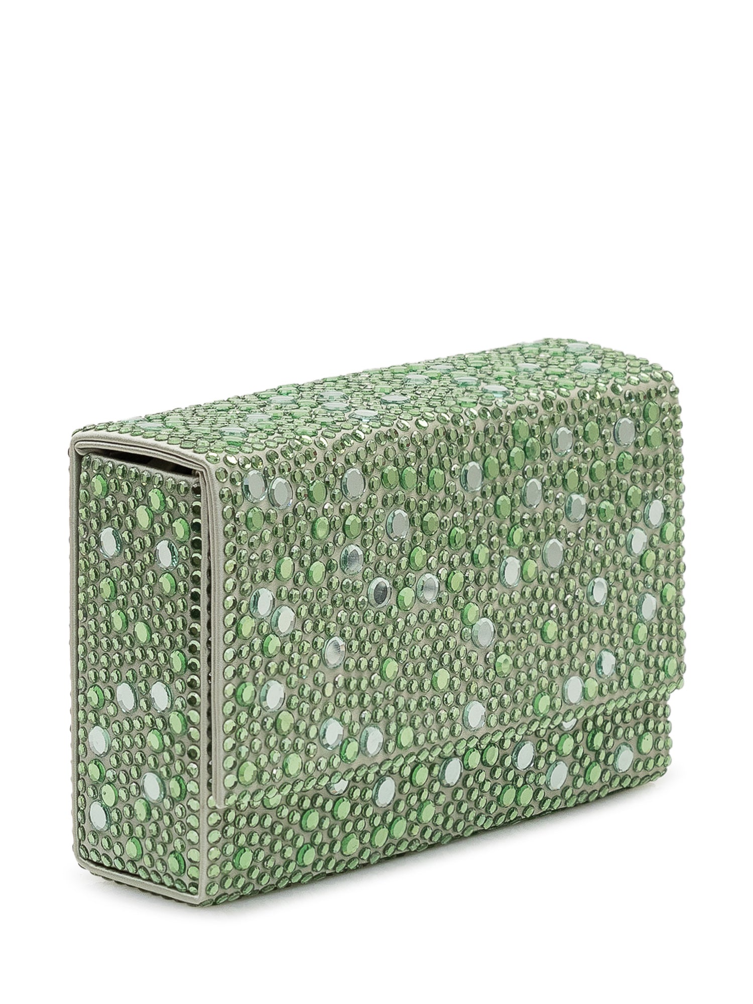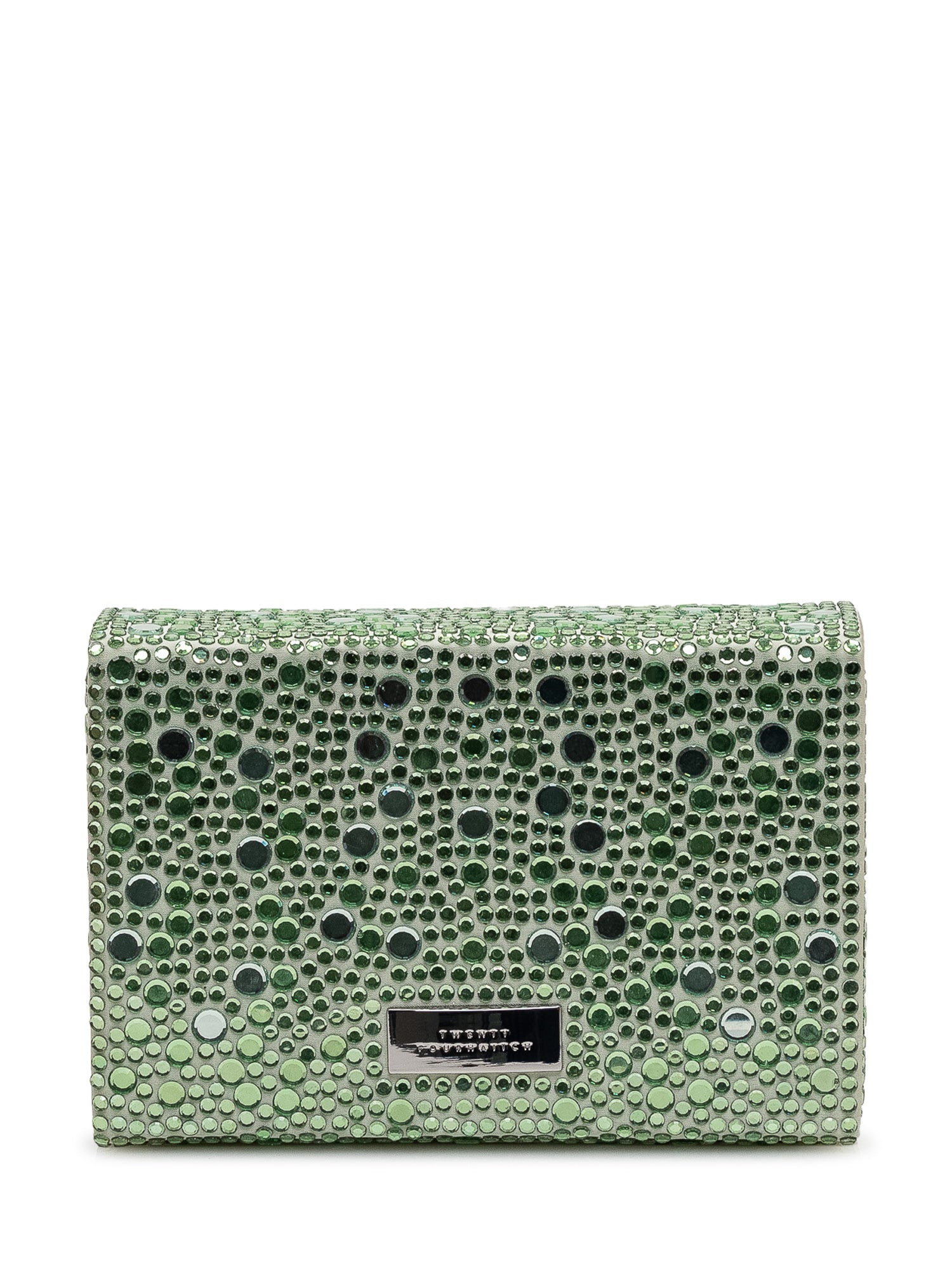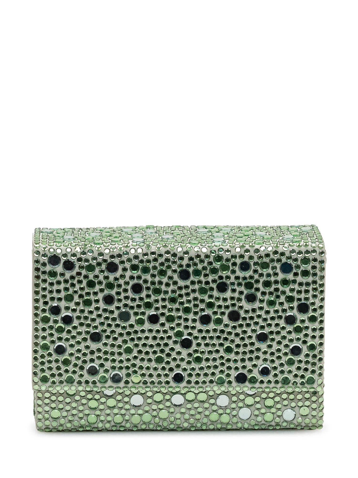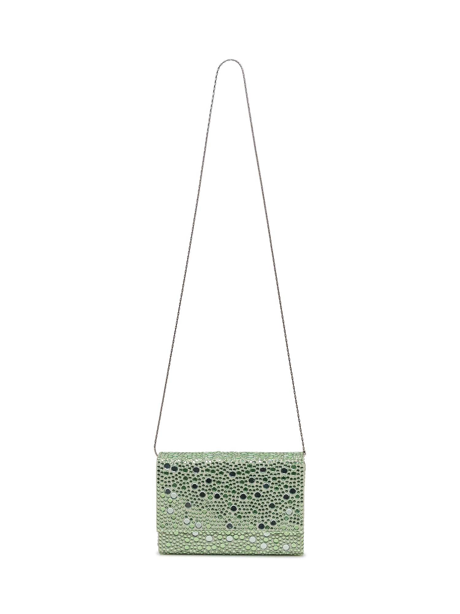 Borsa a mano con patta rivestita da applicazioni luminose, chiusura magnetica e interno compatto.Dimensioni: 17x12x4