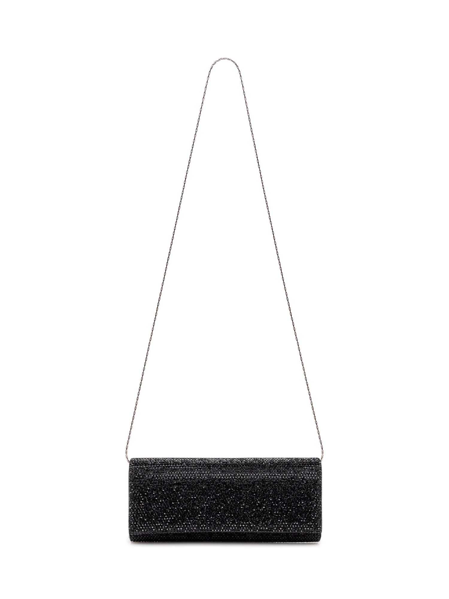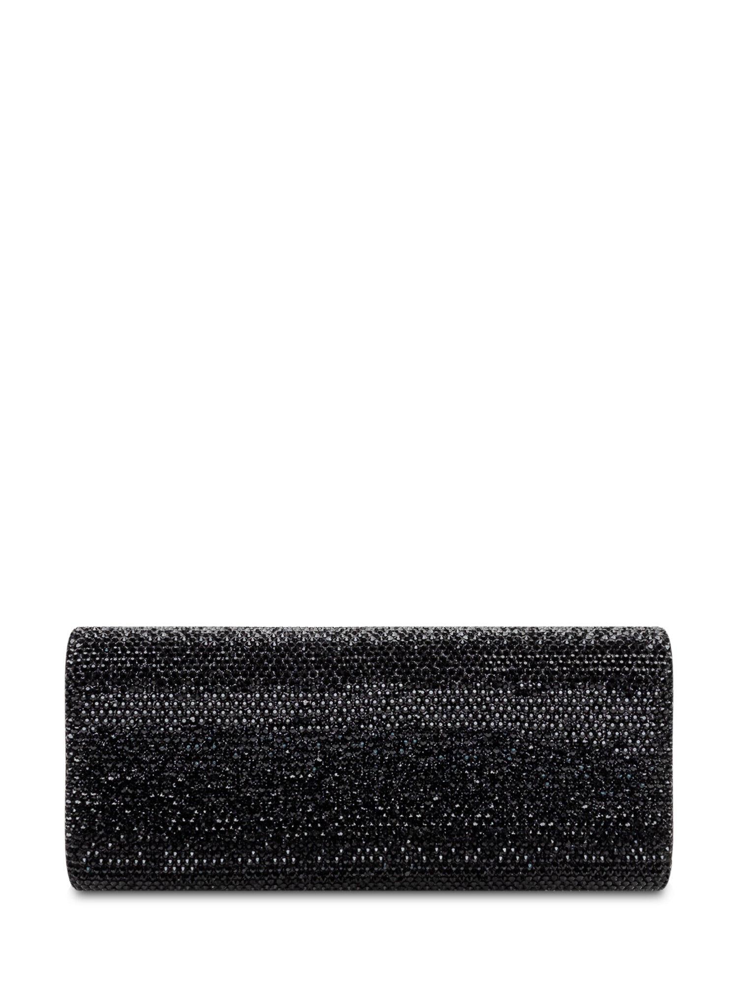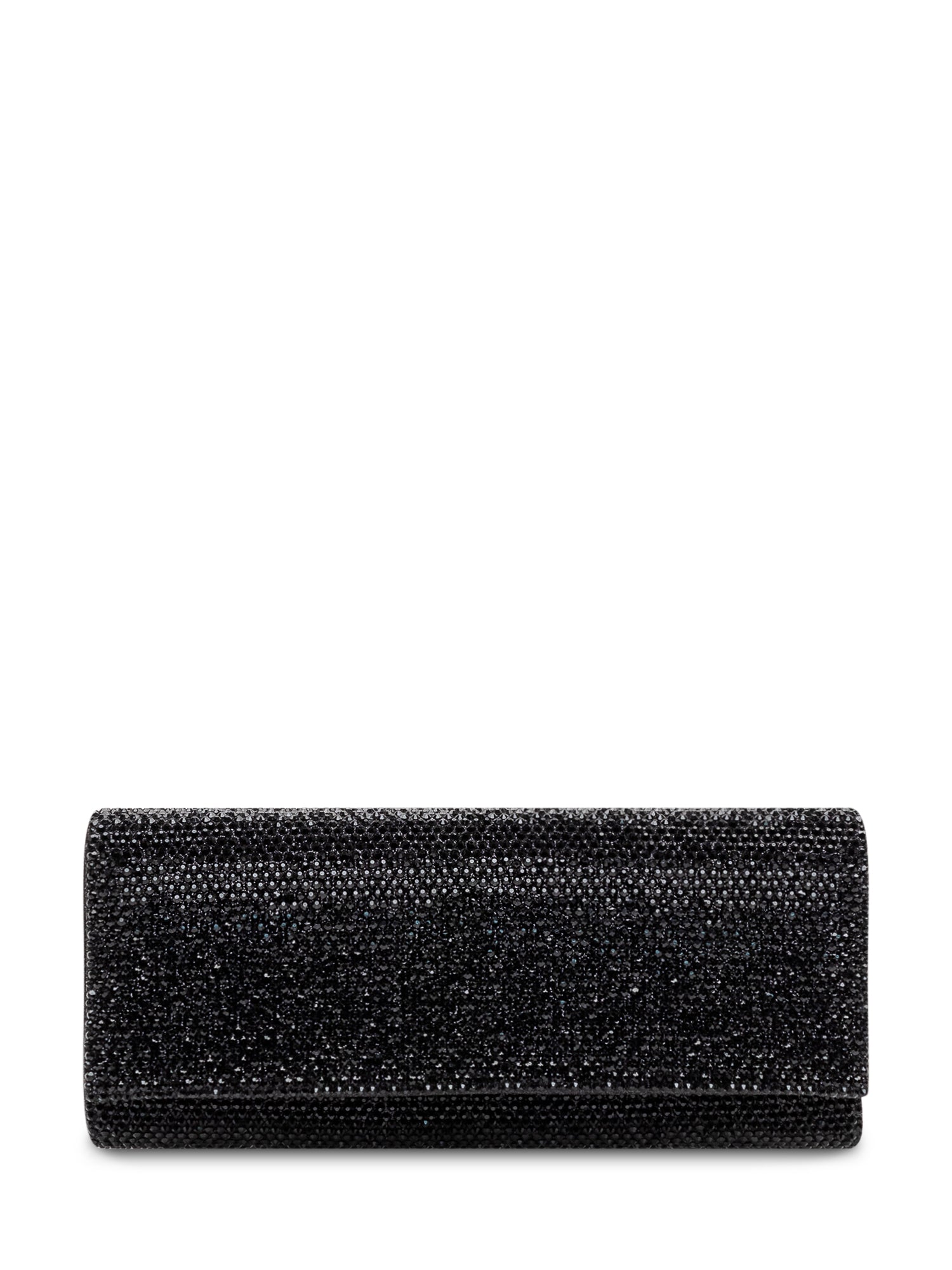 Pochette rigida rivestita di micro strass con silhouette rettangolare, patta con chiusura a scatto e interno compatto per gli essenziali.Dimensioni: 22x9x2