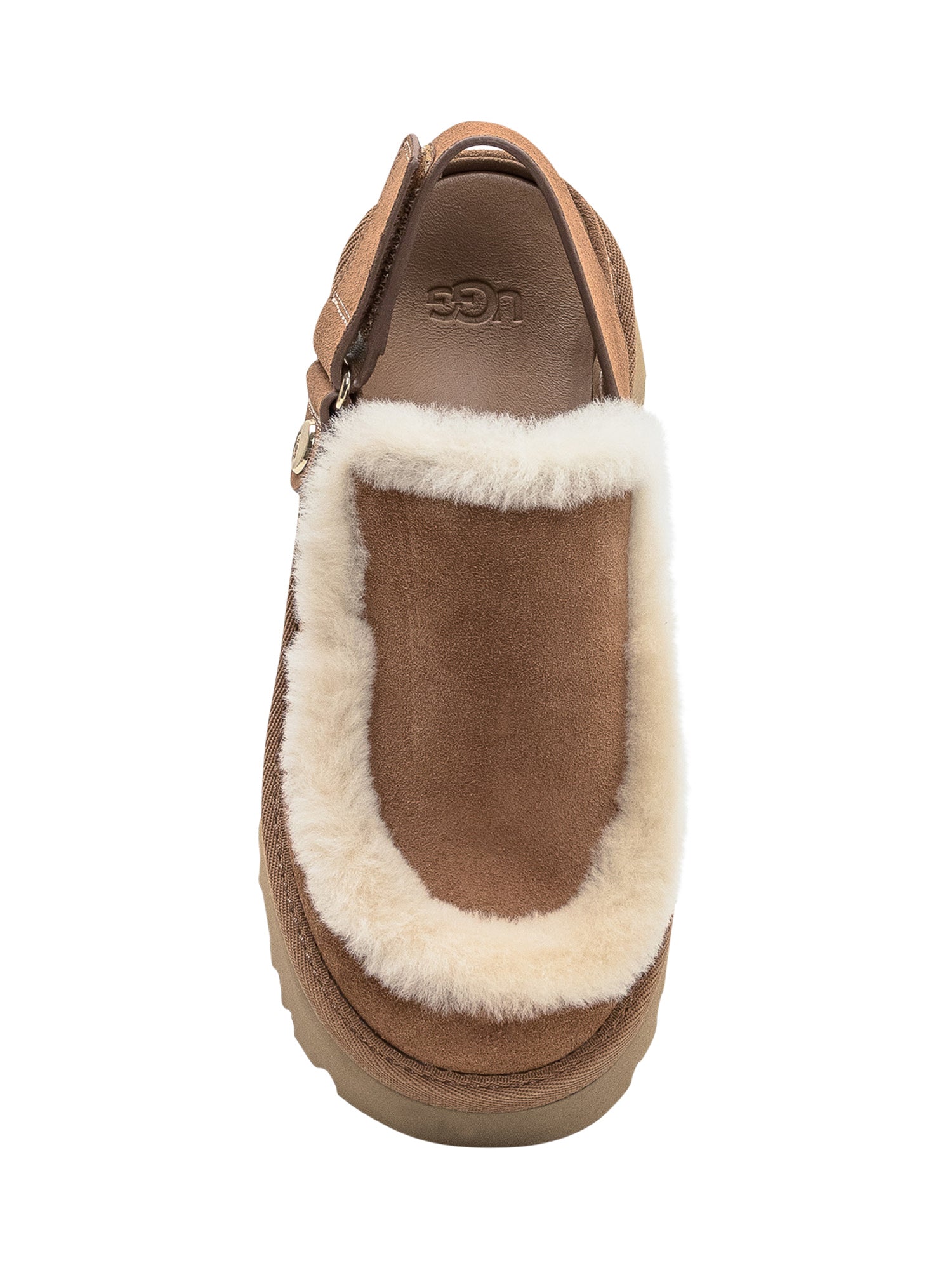 Zoccoli UGG Esmee in camoscio marrone con fodera in shearling, cinturino regolabile e suola platform dentellata.