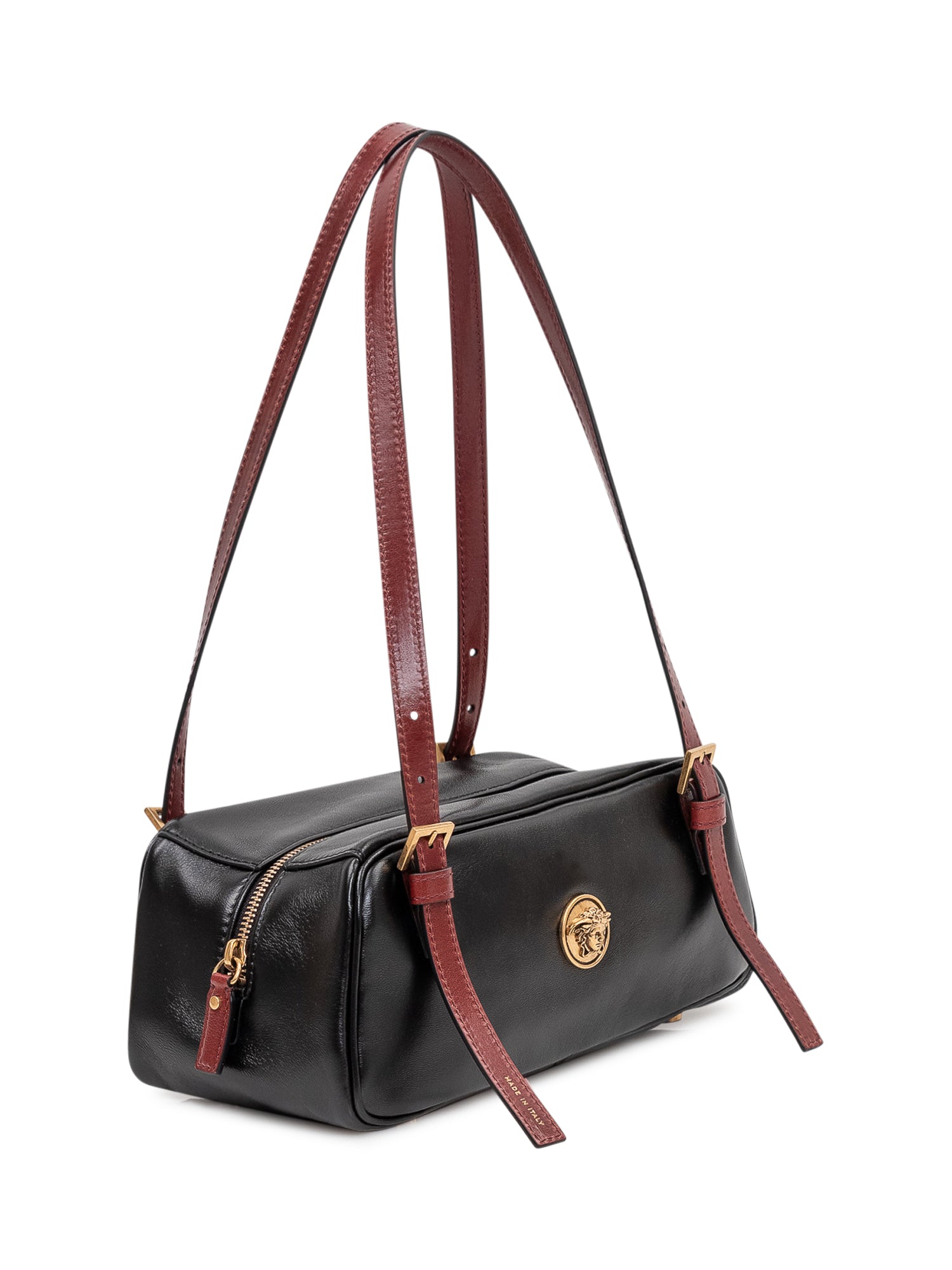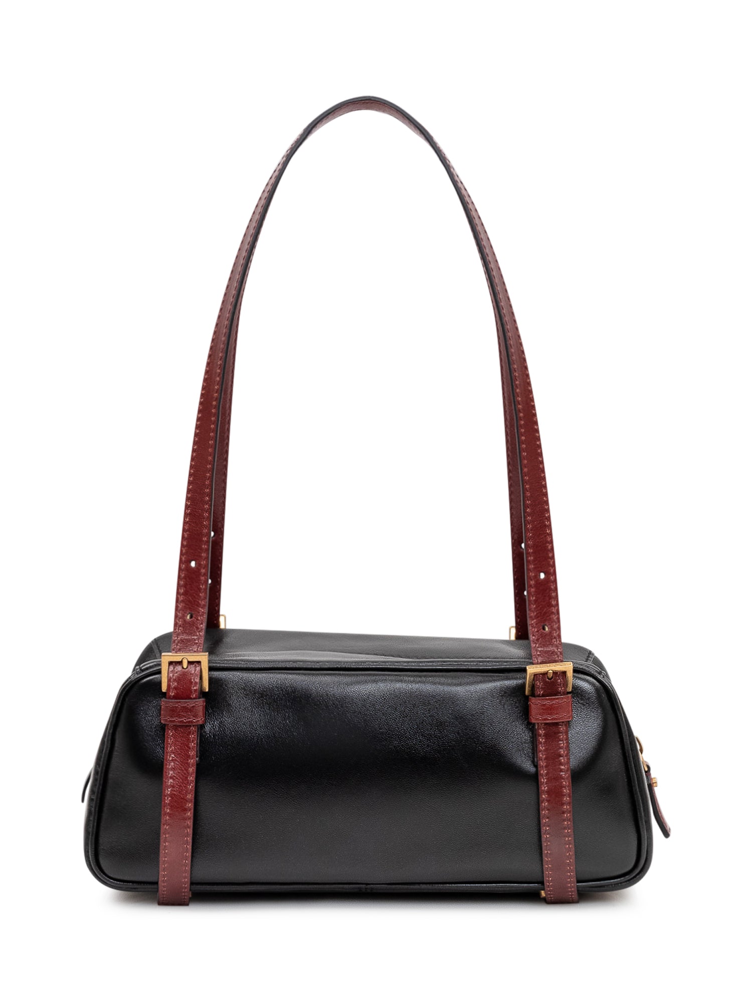 Borsa a spalla compatta con forma allungata e chiusura superiore con zip. Doppi manici regolabili con fibbie metalliche e dettaglio logo frontale. Struttura morbida ideale per outfit moderni.