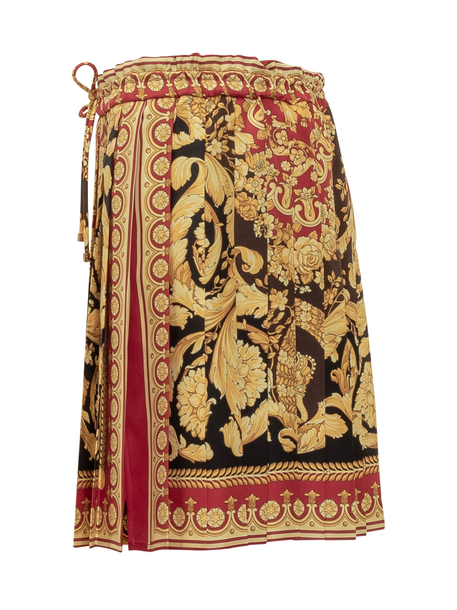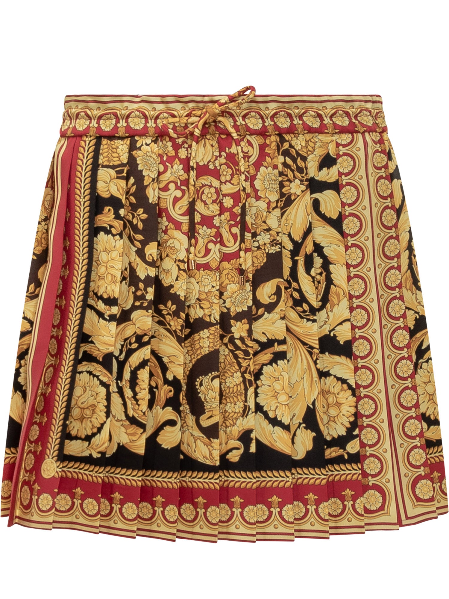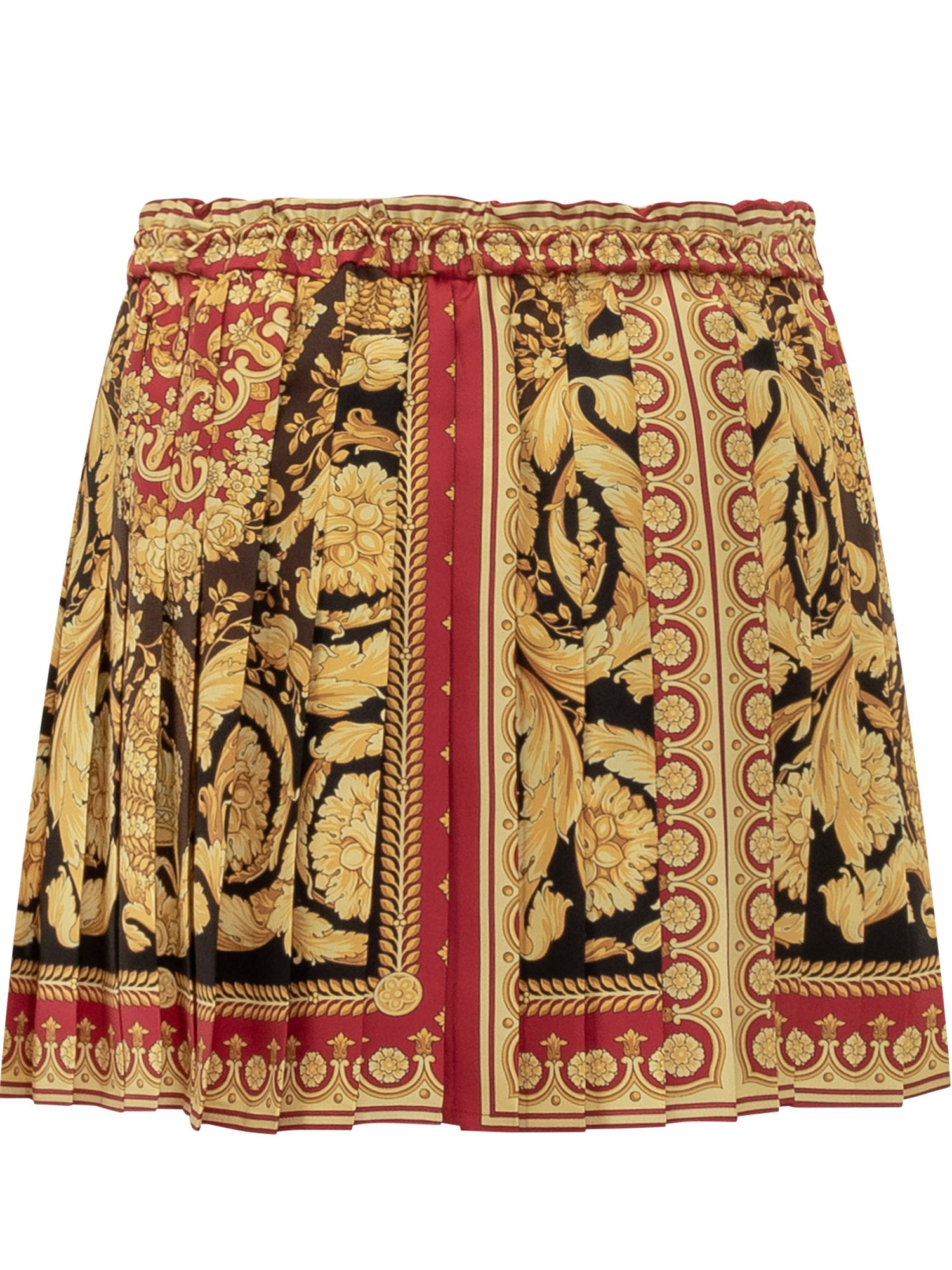 Gonna corta plissettata Versace con elastico in vita e stampa barocca nei toni oro, rosso e nero.