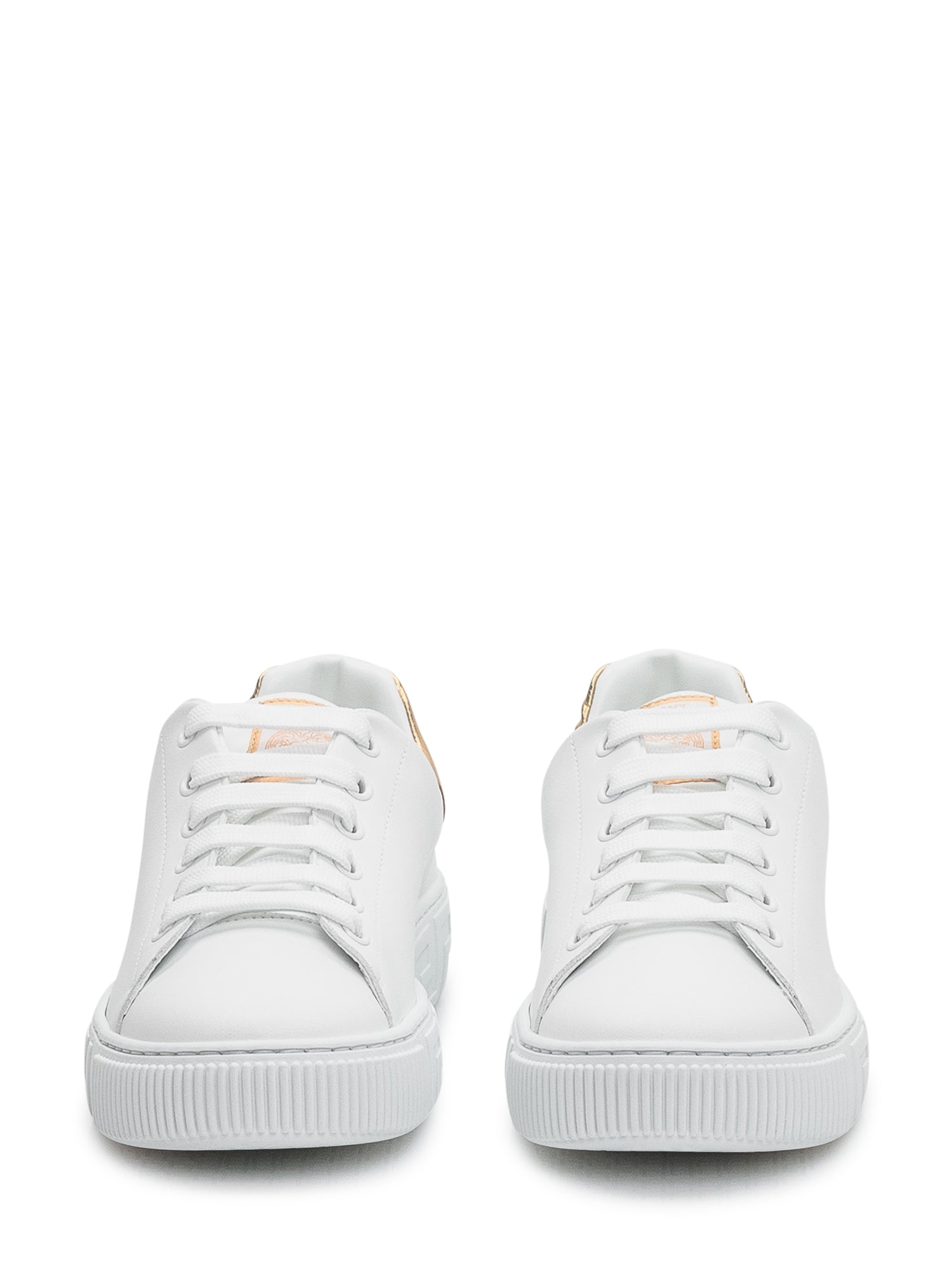 Sneaker bassa dal design pulito con dettaglio metallico sul tallone e suola con motivo geometrico.
