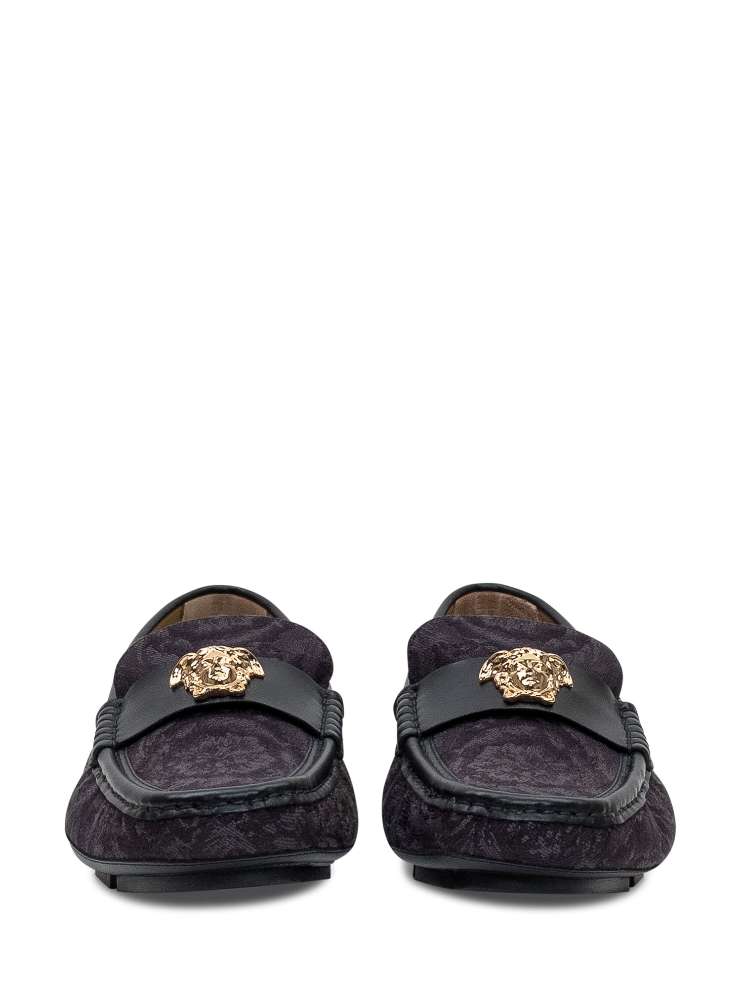 Mocassini driver da uomo Versace in tessuto con motivo barocco e pelle nera, arricchiti dall iconico dettaglio Medusa dorato.