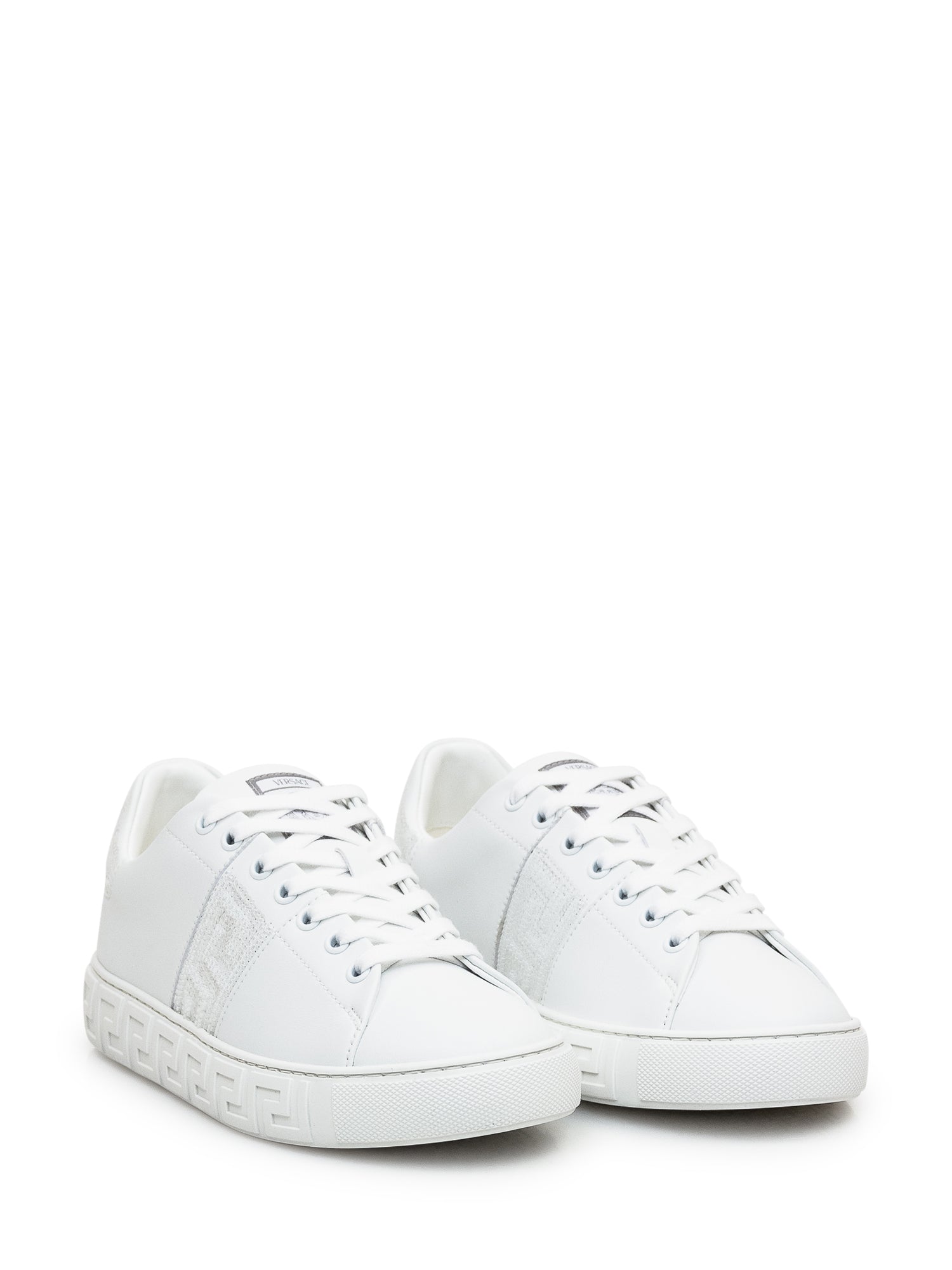 Sneaker bianca. Chiusura con lacci. Patch Logo sulla linguetta. Logo sul tallone. Pattern Greca inciso sulle suole in gomma. Inserti in paillettes.