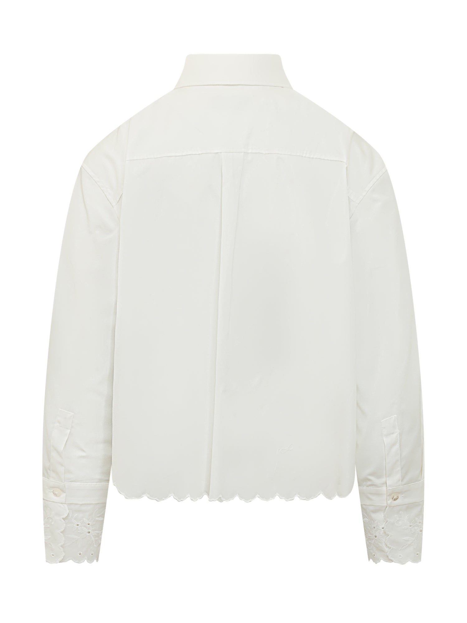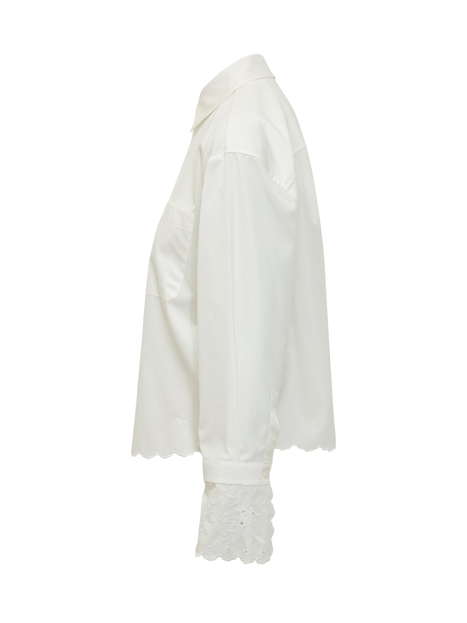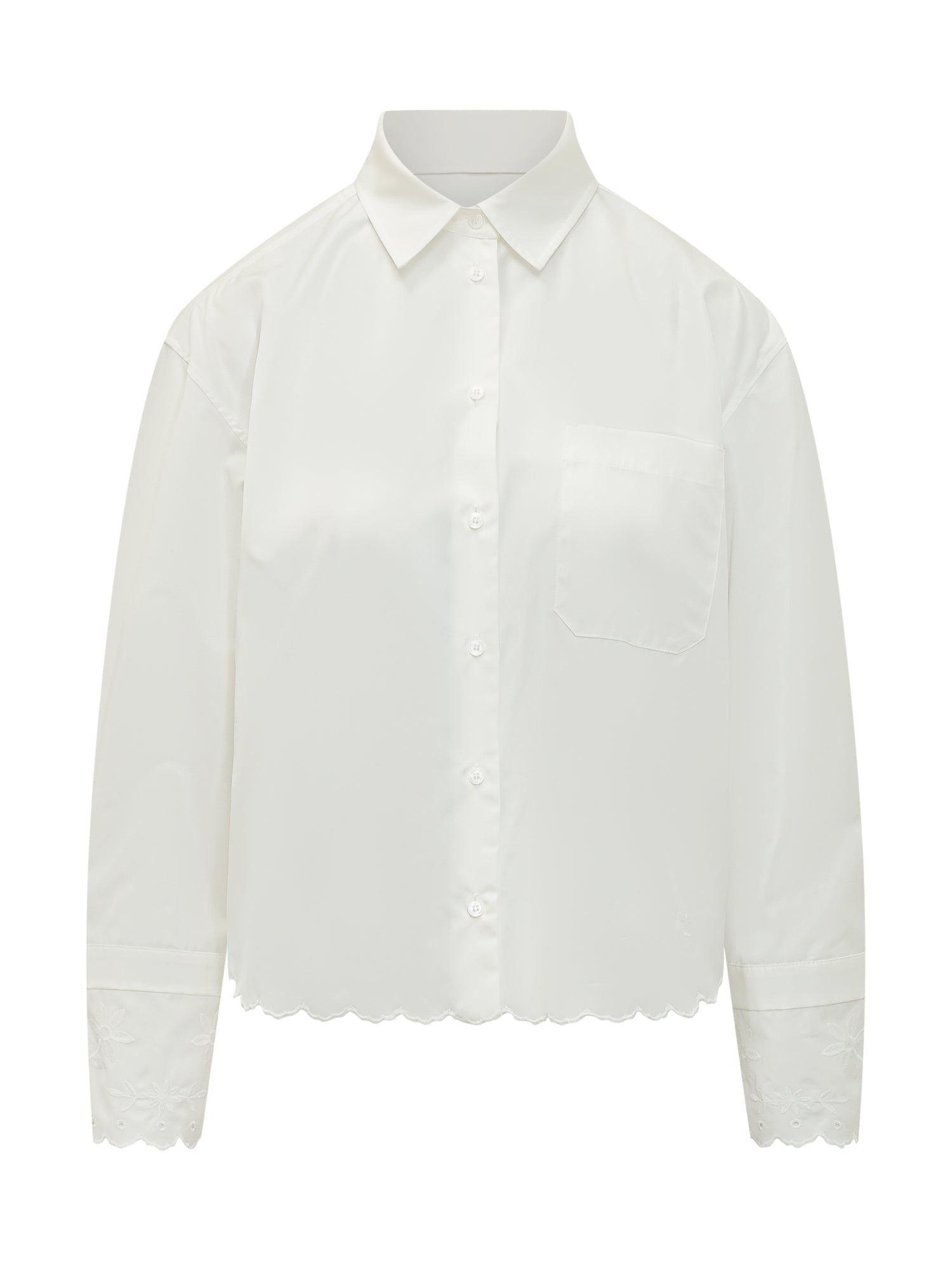 Camicia con colletto classico, chiusura con bottoni, maniche lunghe con polsini ricamati, taschino applicato, fondo con bordo smerlato.