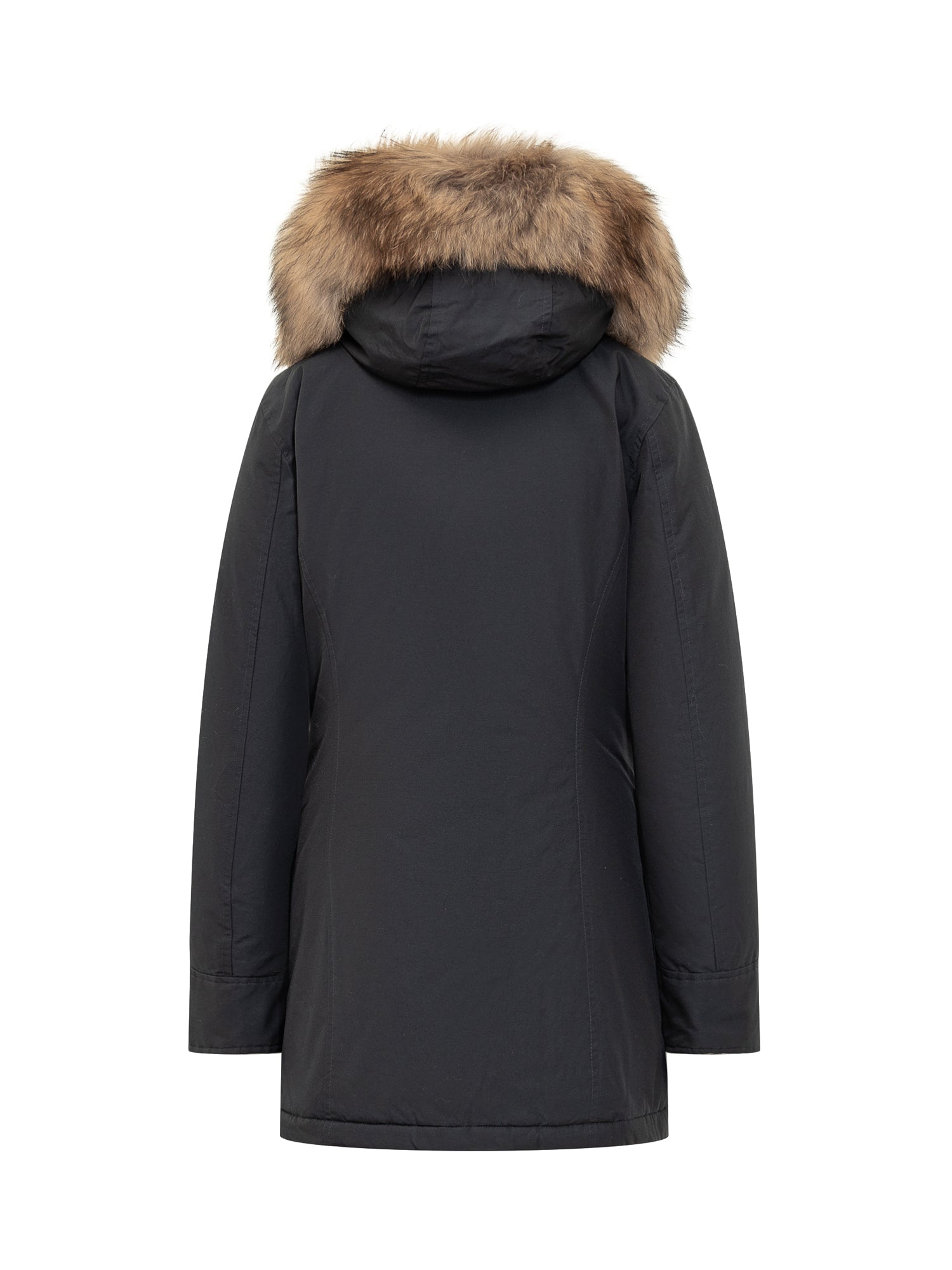 Parka blu imbottito. Cappuccio con pelliccia. Tasche con patta. Chiusura con zip.